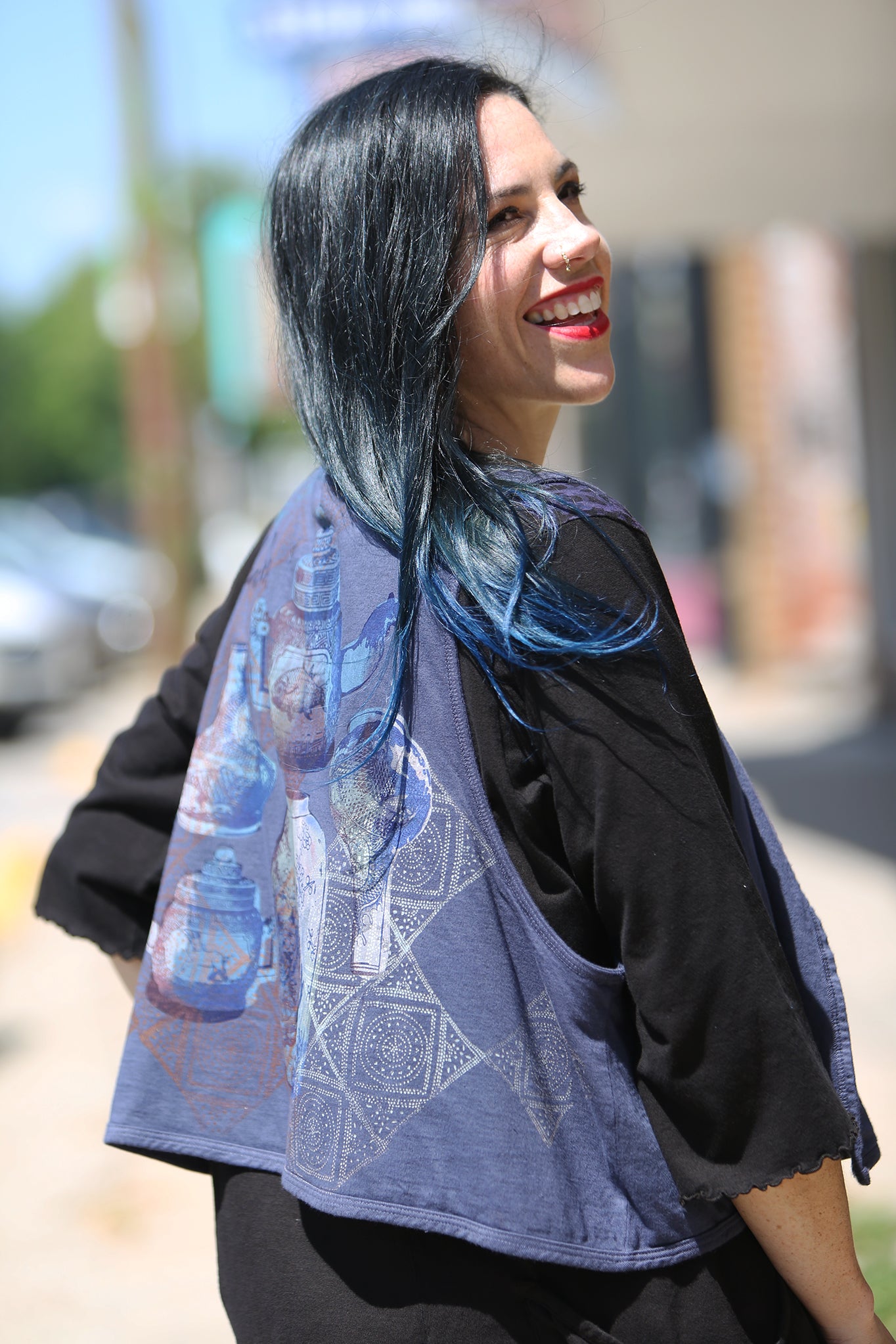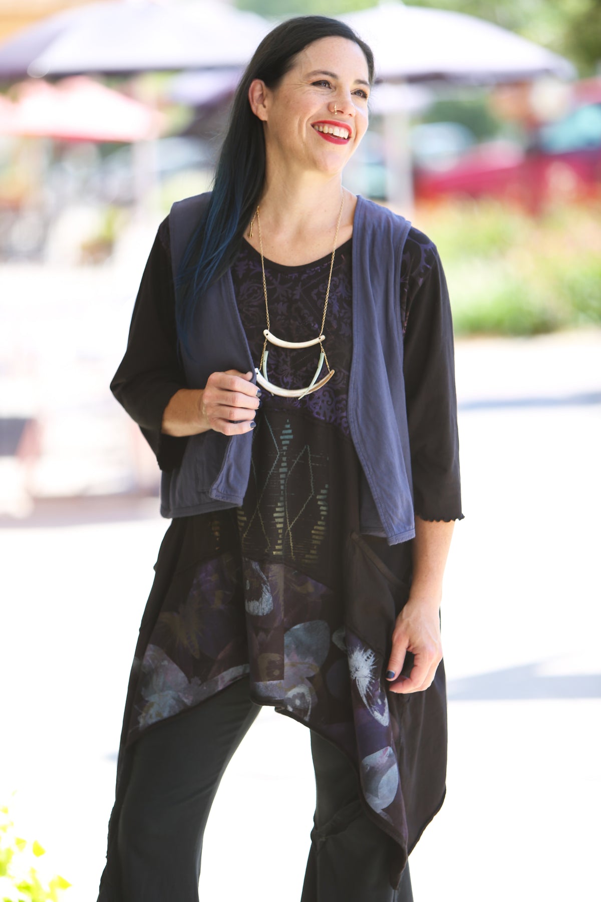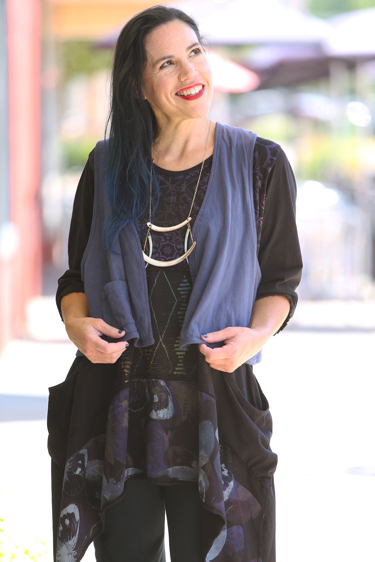 The perfect layering vest! Features a small side-pocket and a magical print covering the entire back. Create a magnificent lagenlook outfit year round with this go to piece.