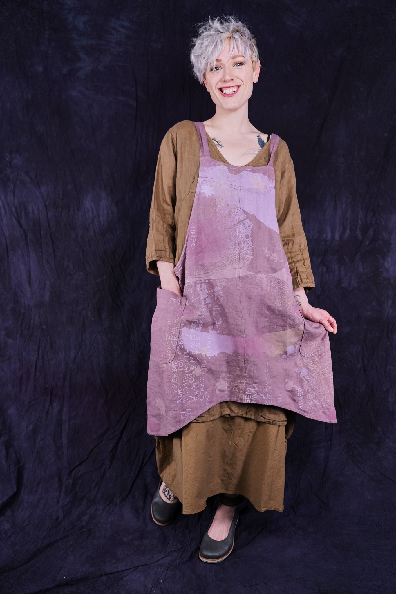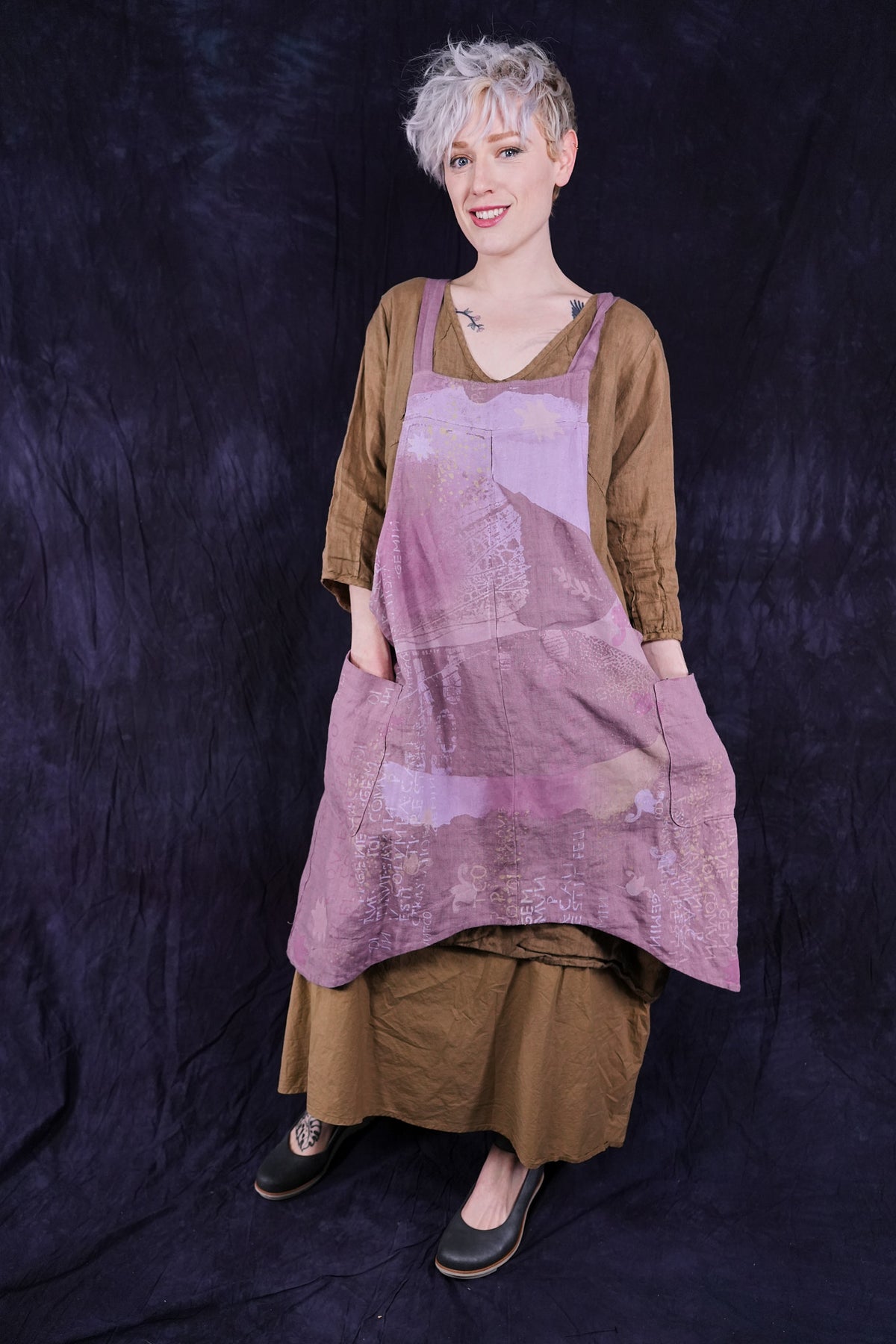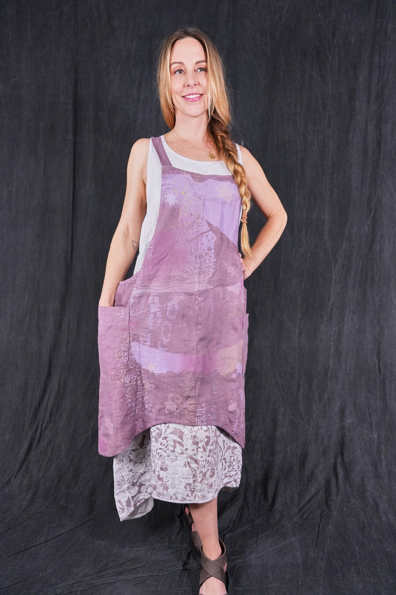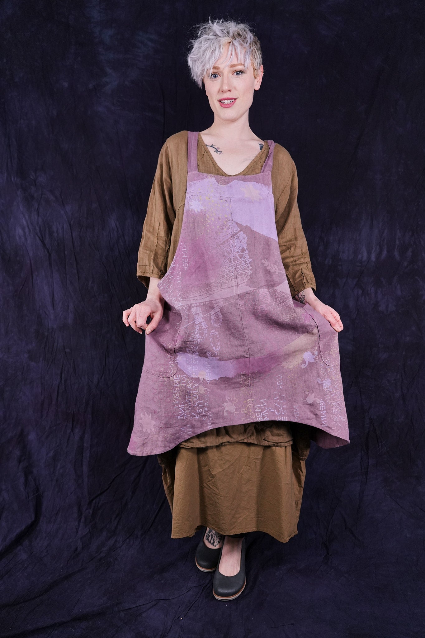 Hand-printed with abstracted & delicate, beautifully patterned moth wings...In the Blue Fish style of lagenlook, this special Cantina Apron Midlayer creates that eclectic Blue Fish look simply by layering over pants, skirts and dresses. The softest mid-weight linen with adjustable ties. Roomy pockets give function to the artful style. Get ready to garner many compliments in this essential Blue Fish Midlayer!
