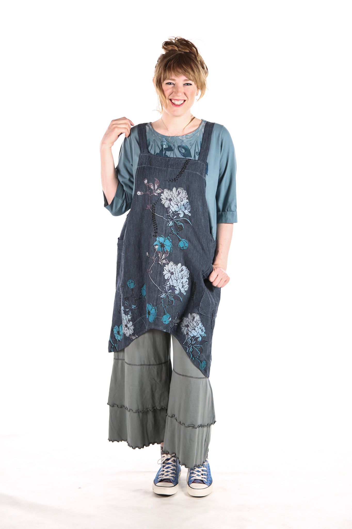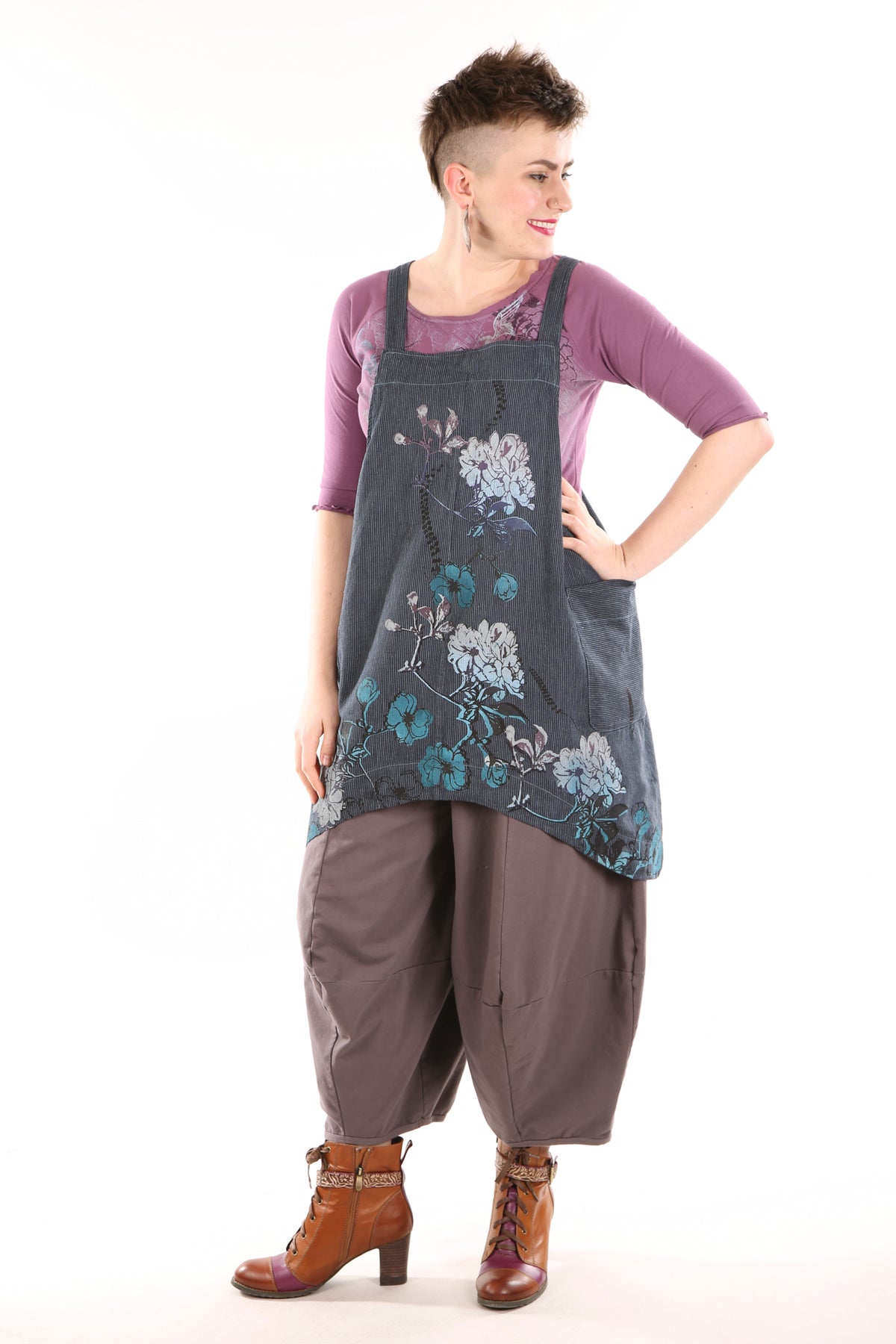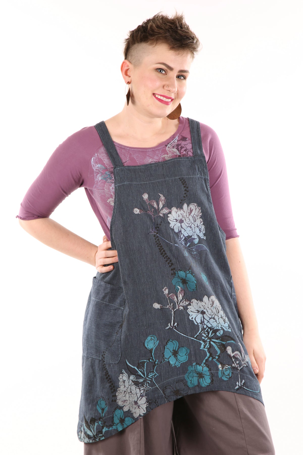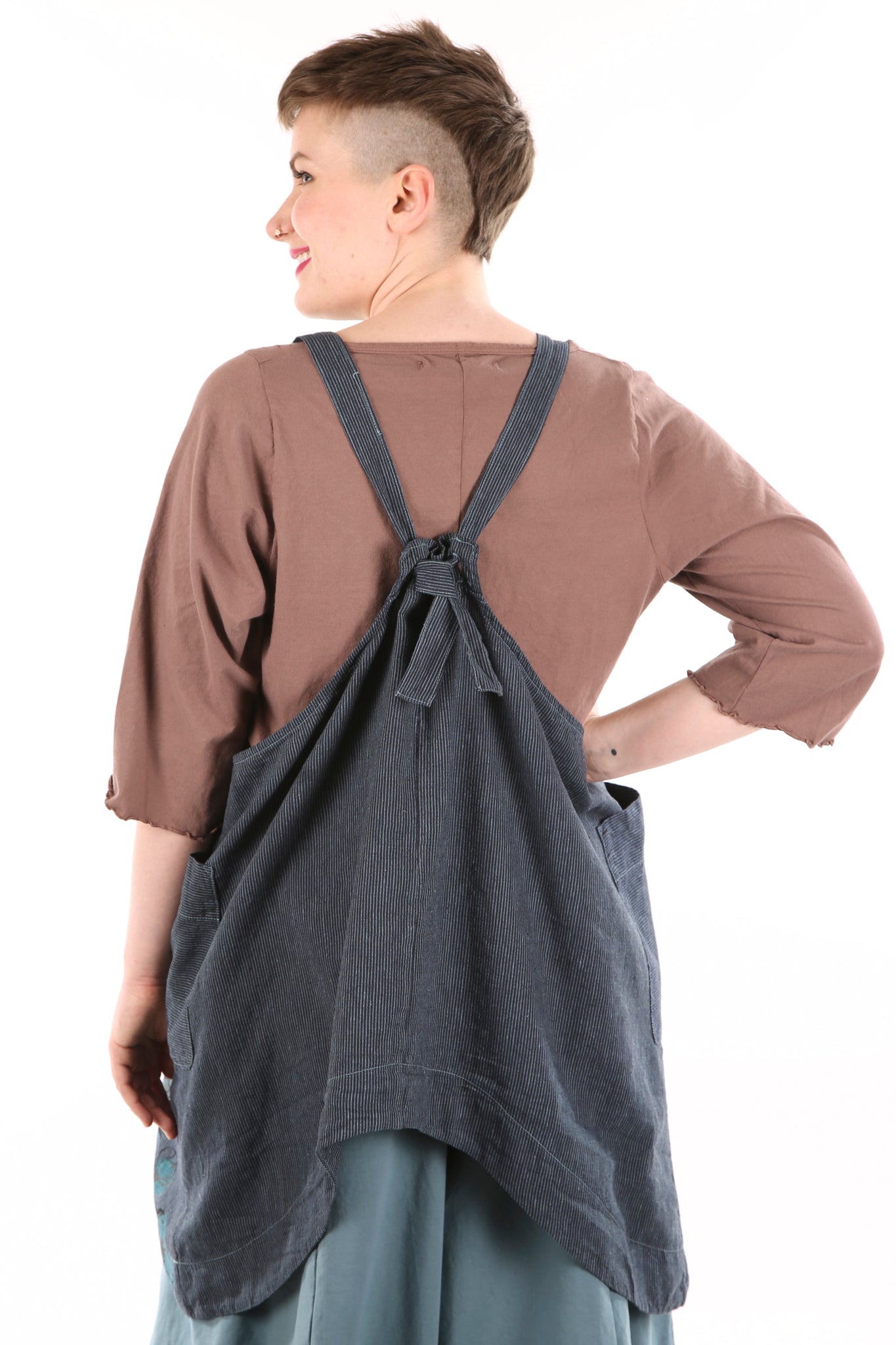 In the Swedish style of lagenlook, this special apron/jumper creates that eclectic Blue Fish look simply by layering over pants, skirts and dresses. The indigo striped hemp-cotton woven fabric feels like linen, and has been overdyed in gorgeous colors that coordinate with the other pieces in the collection. Roomy pockets give function to the artful style. Measurements are updated for improved fit. T Get ready to garner many compliments in this essential Blue Fish apron jumper!