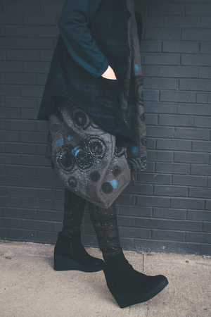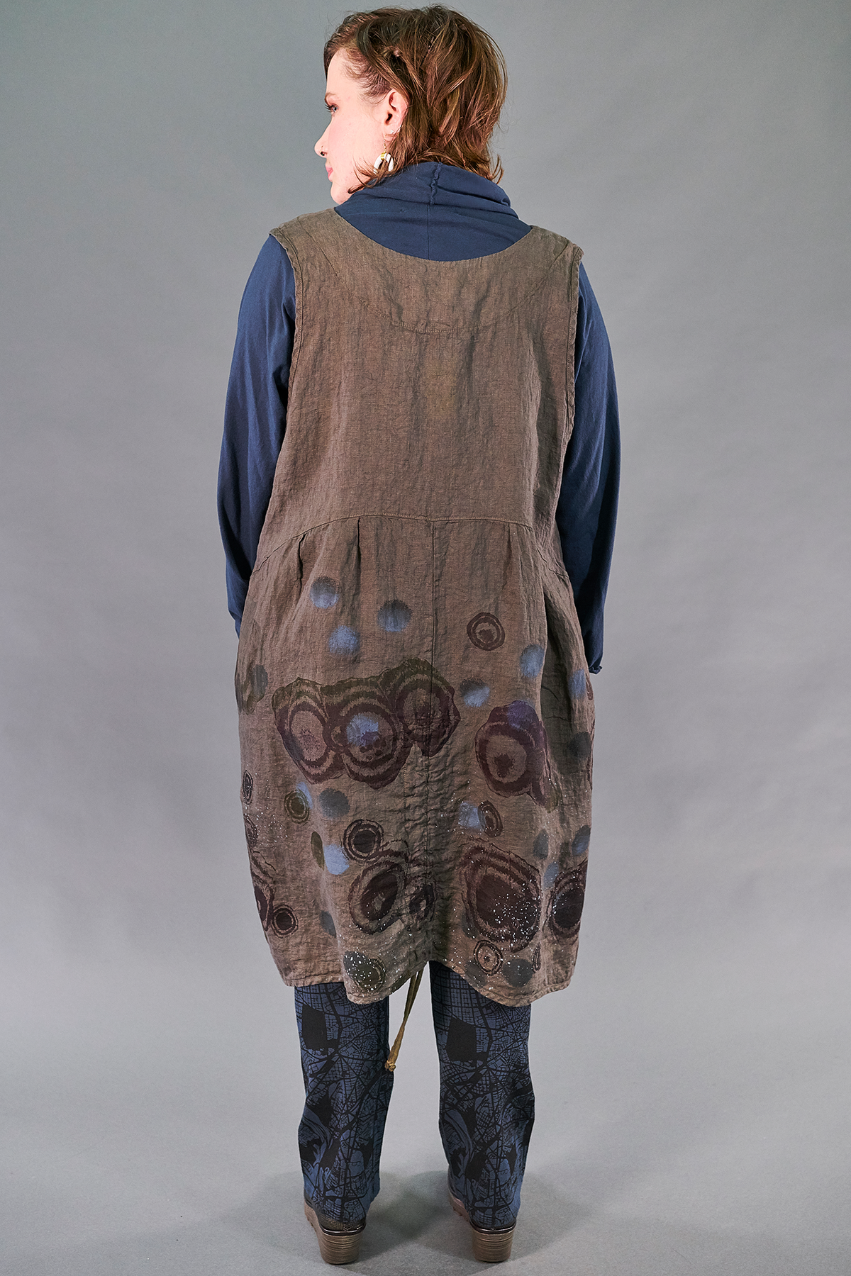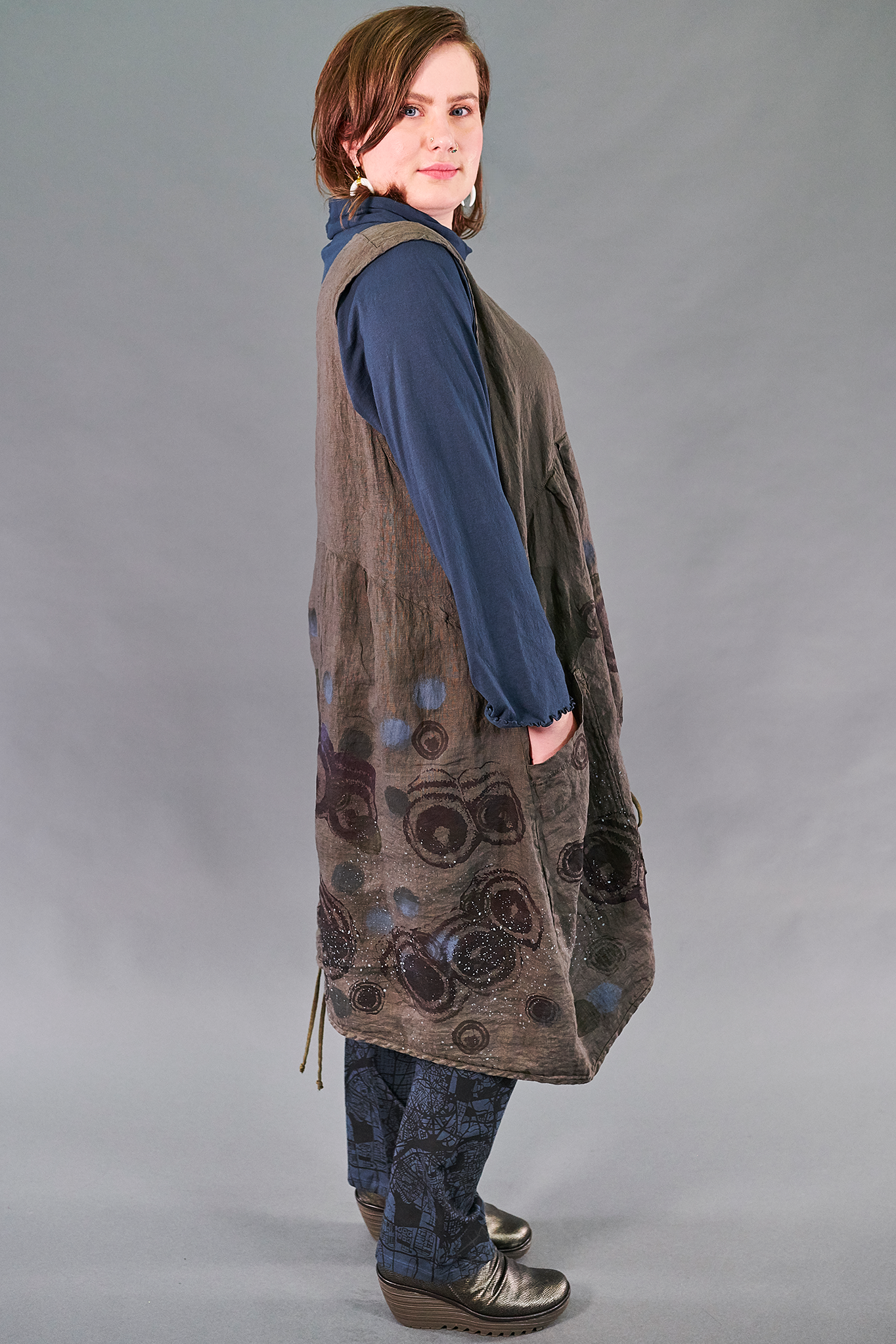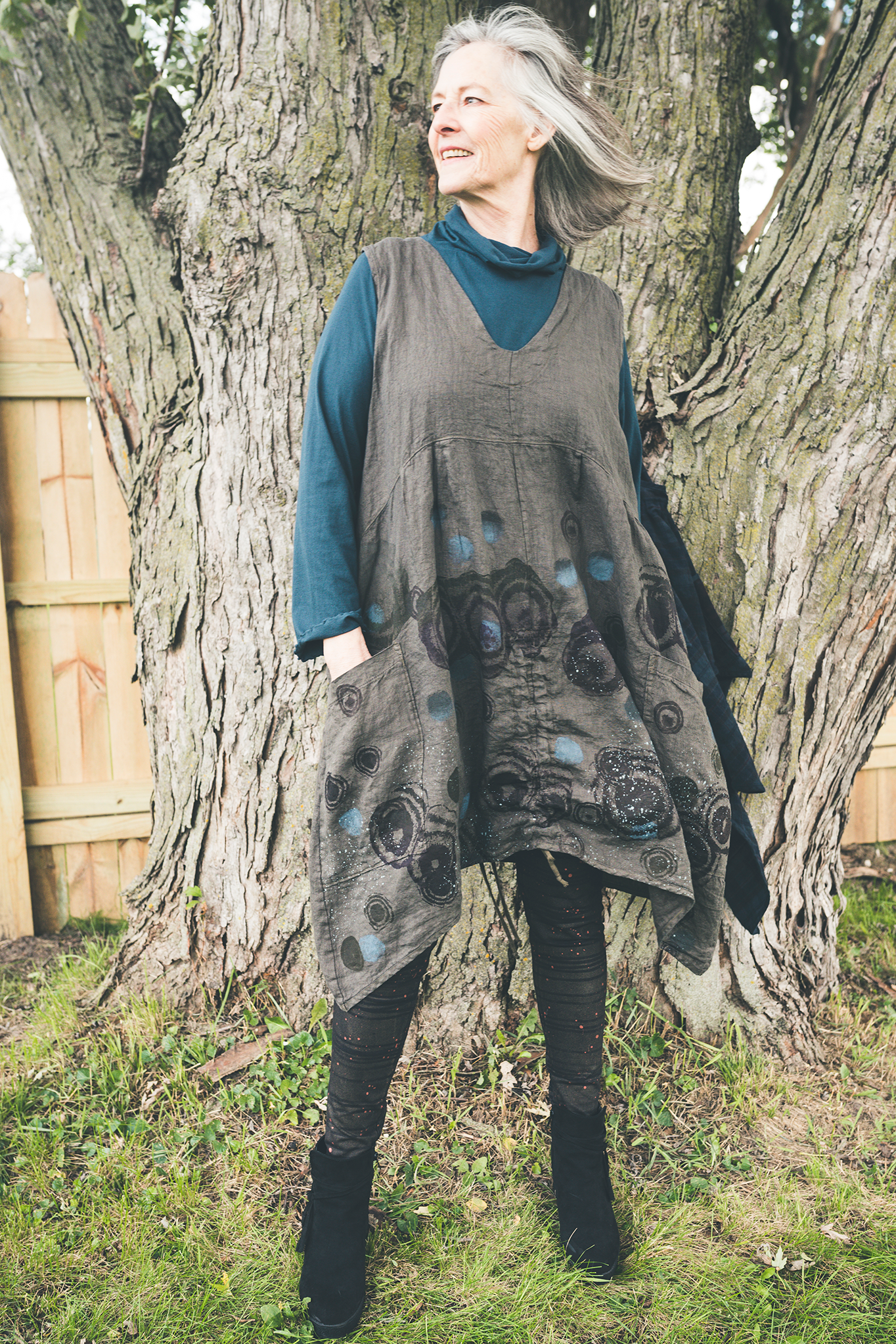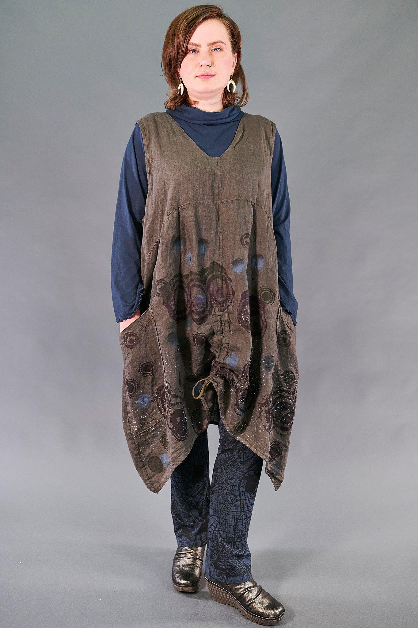 Deconstructed moth wings flutter across our wood nymph shift, creating a whimsical spotted pattern. A favorite year round color in a mid-weight linen jumper to dress up any outfit. Detailed pinches, curved hemline, and deep pockets add to the perfectly flattering A-line shape. Long in the front, and even longer in the back.