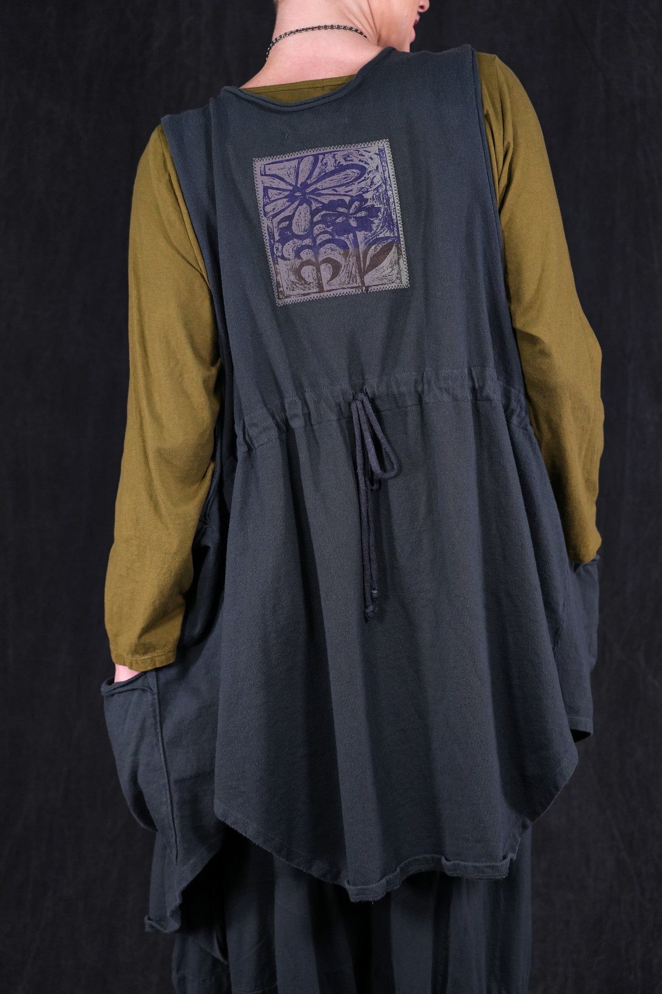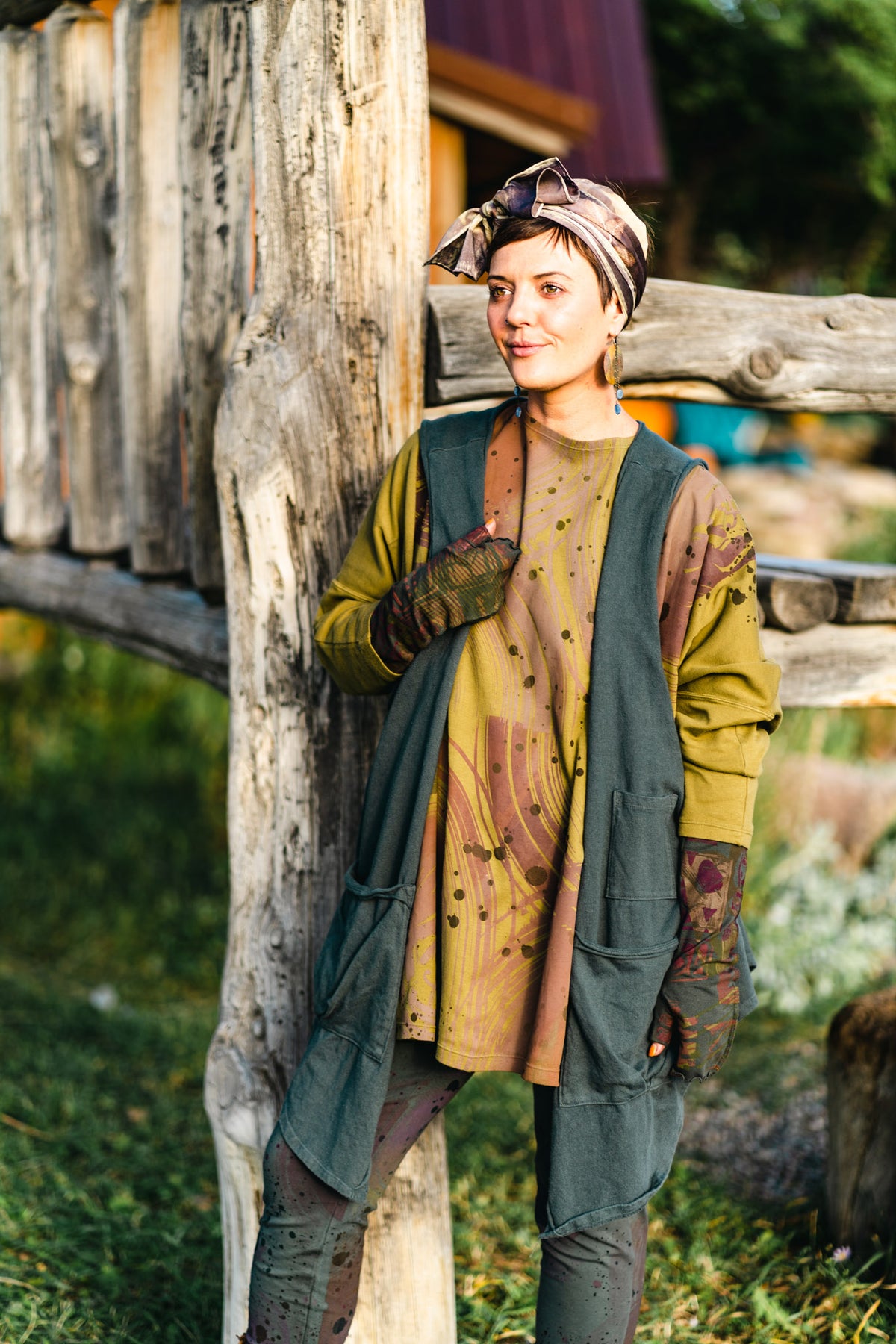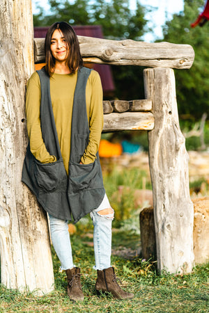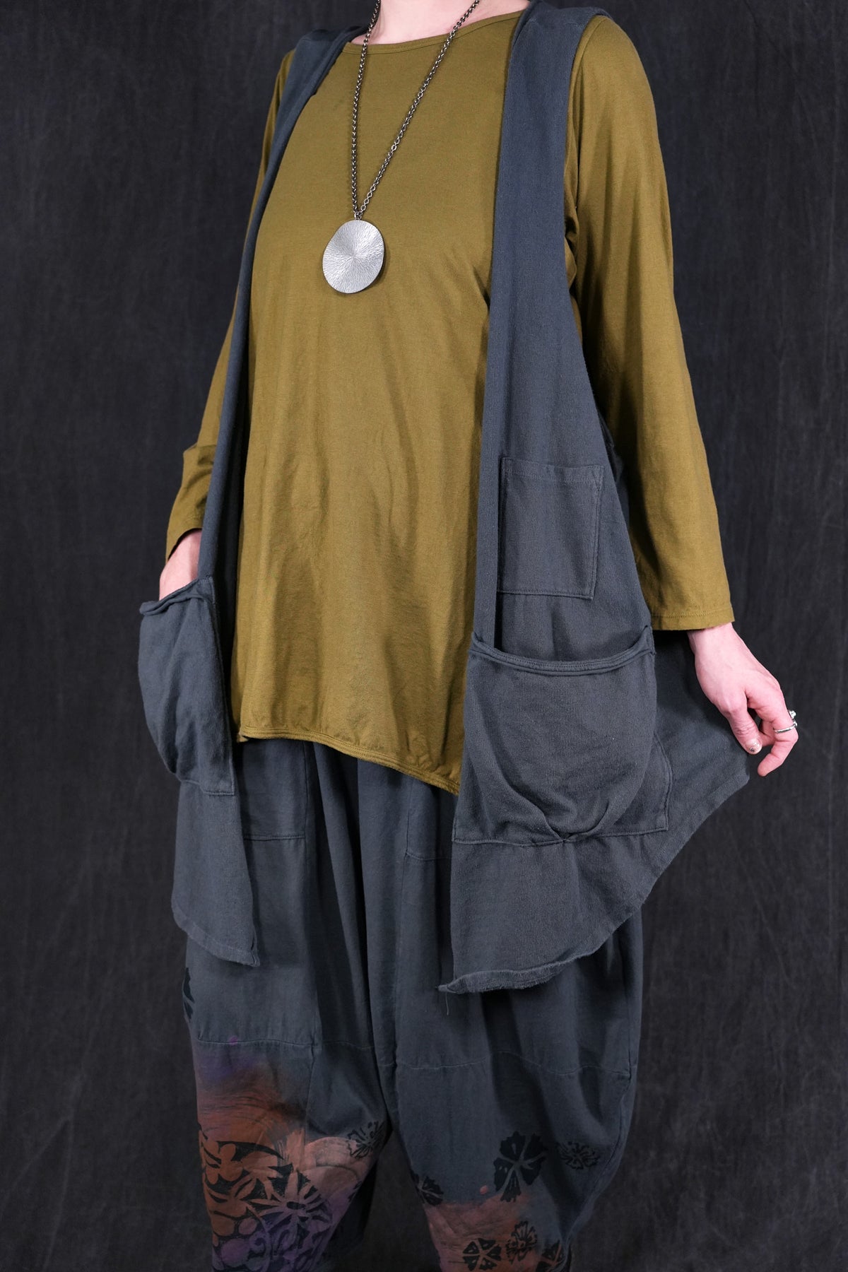 Made of soft organic reprocessed cotton. Wear it over anything and everything-tees, tanks, tunics and dresses. There is and an assortment of pockets making it perfect for travel. The drawcord in the back adjusts for all sizes and fits.
