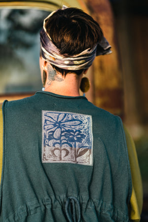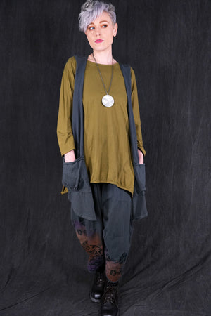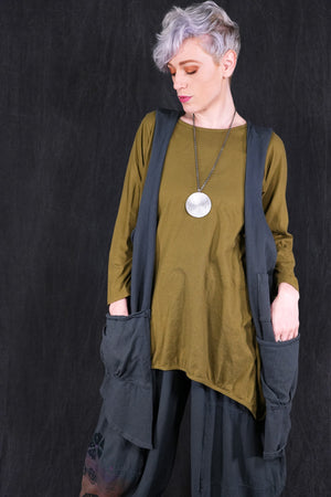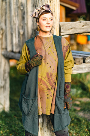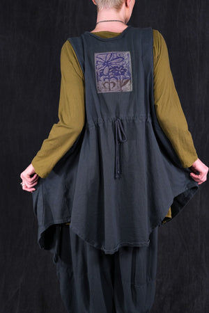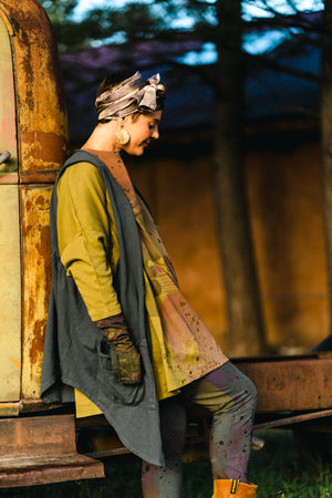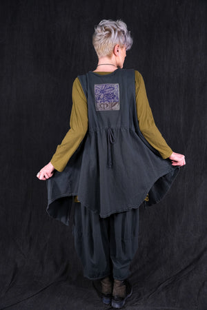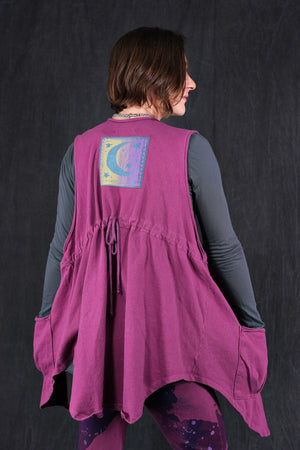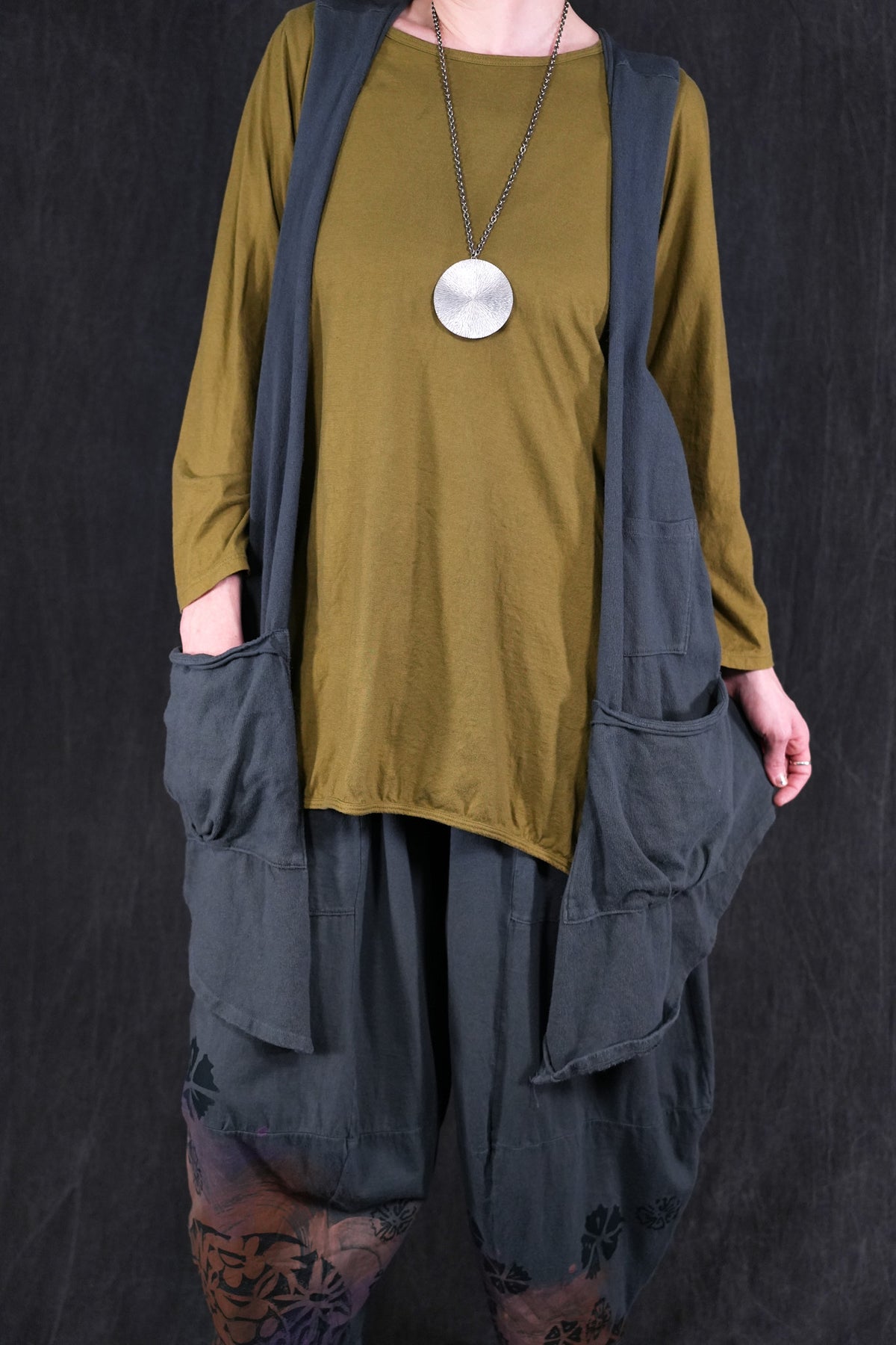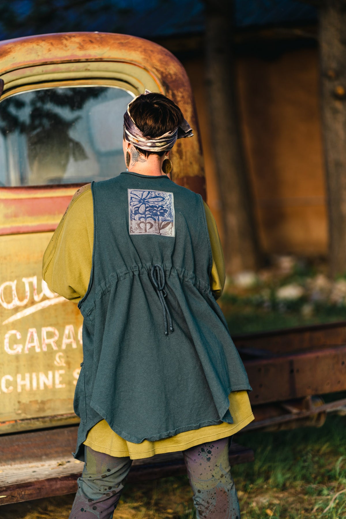 Made of soft organic reprocessed cotton. Wear it over anything and everything-tees, tanks, tunics and dresses. There is and an assortment of pockets making it perfect for travel. The drawcord in the back adjusts for all sizes and fits.
