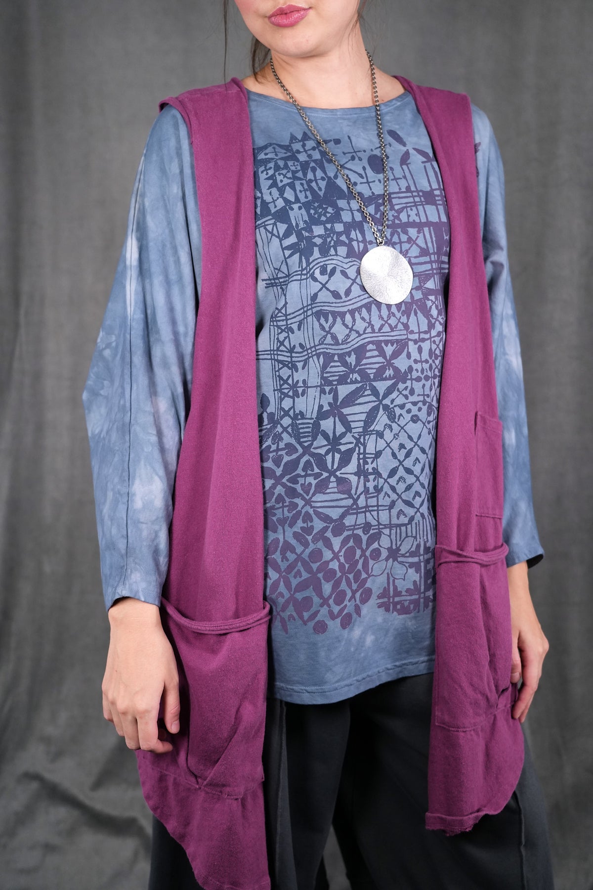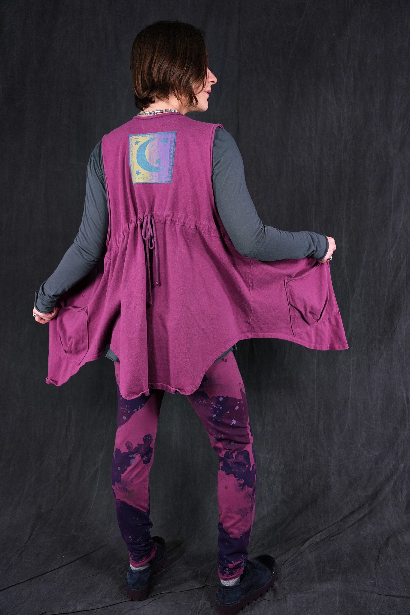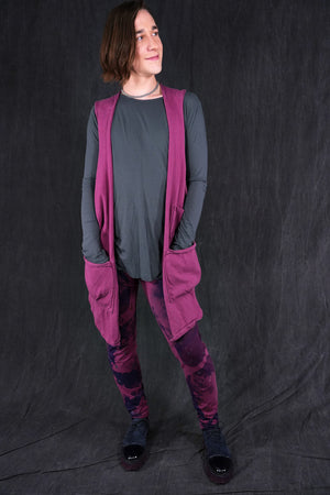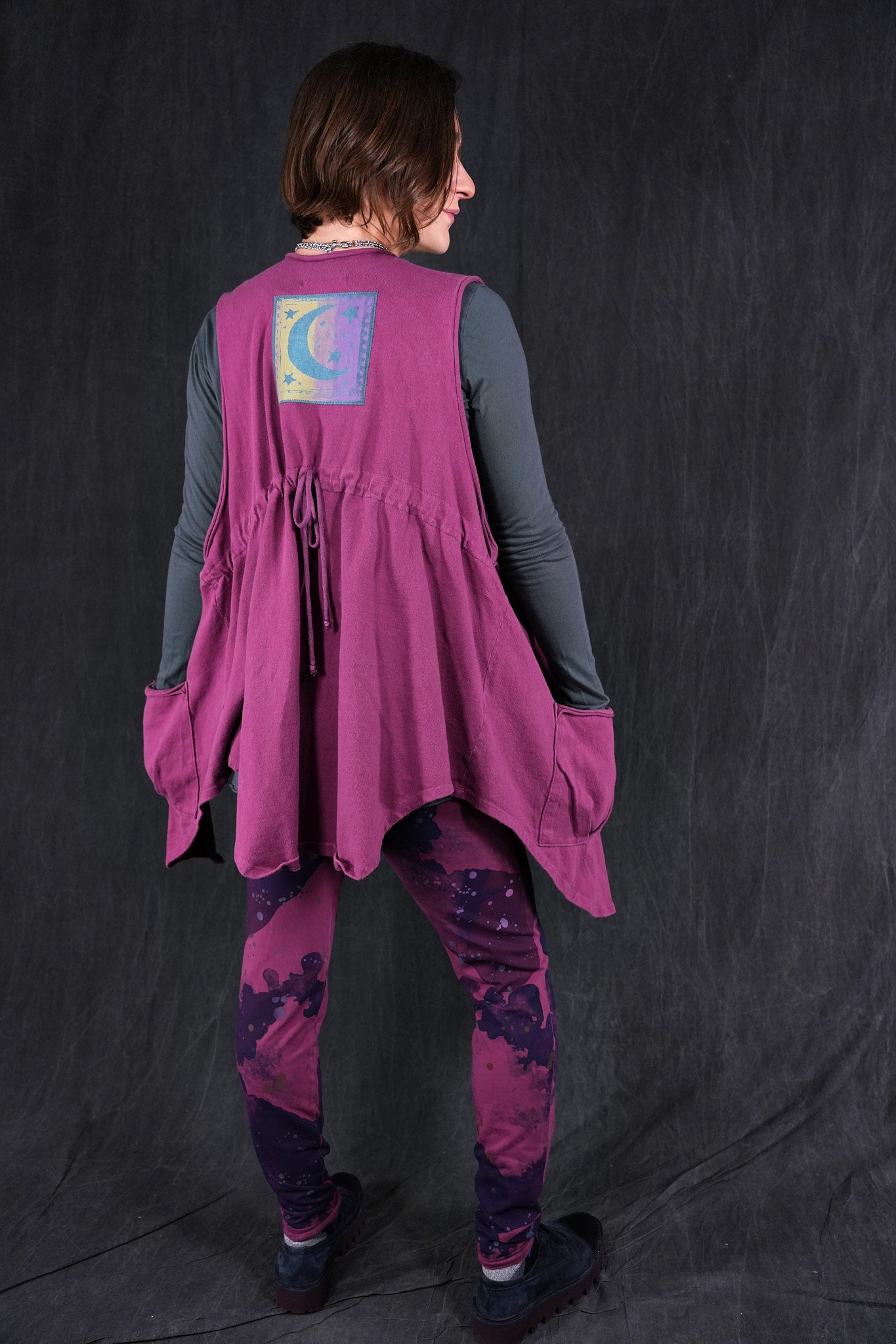 Made of soft organic reprocessed cotton. Wear it over anything and everything-tees, tanks, tunics and dresses. There is and an assortment of pockets making it perfect for travel. The drawcord in the back adjusts for all sizes and fits.