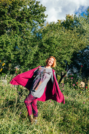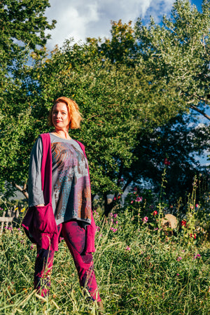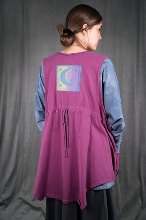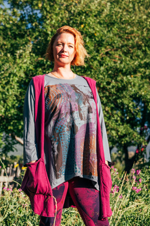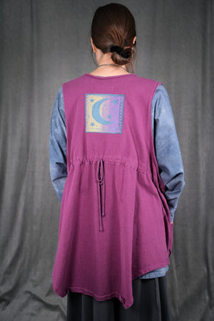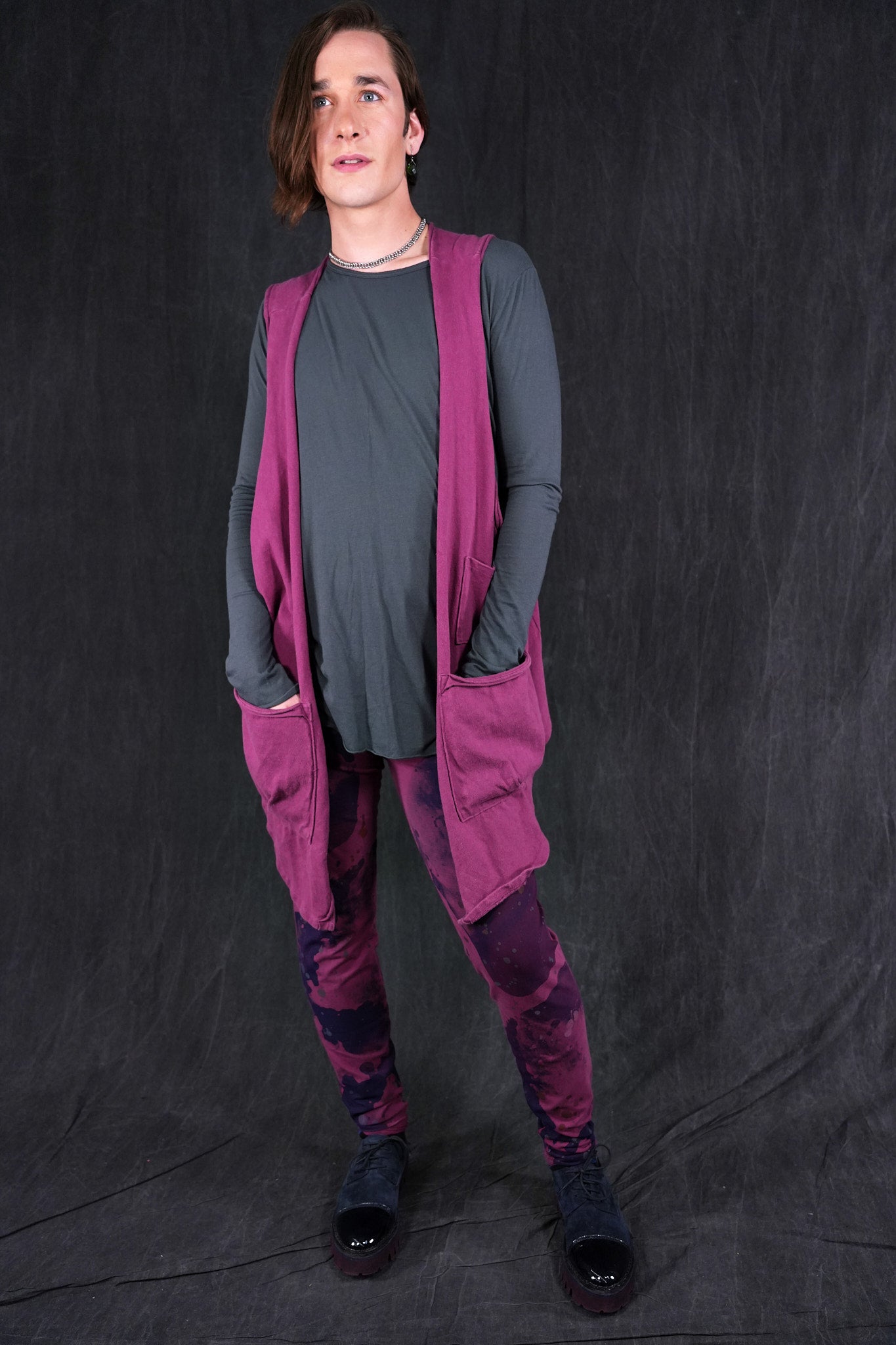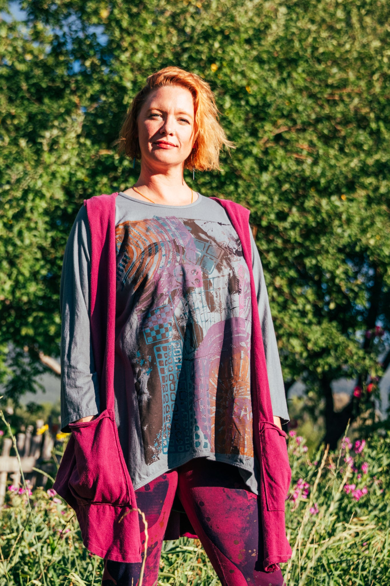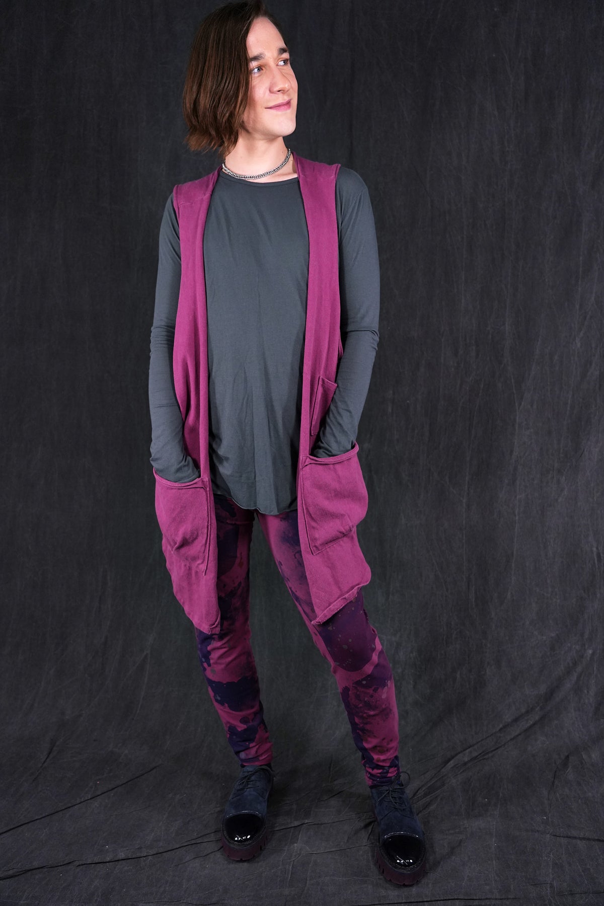 Made of soft organic reprocessed cotton. Wear it over anything and everything-tees, tanks, tunics and dresses. There is and an assortment of pockets making it perfect for travel. The drawcord in the back adjusts for all sizes and fits.