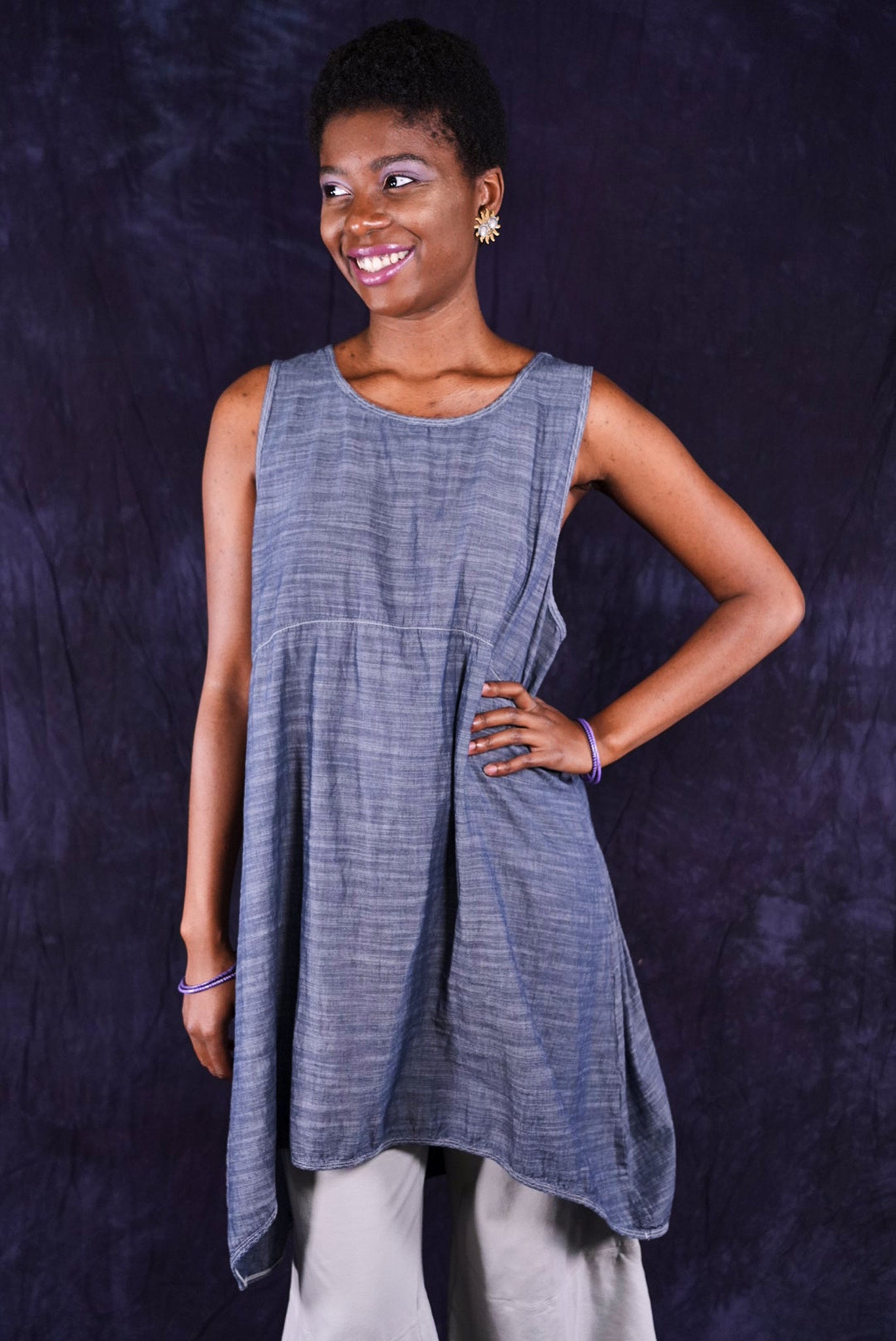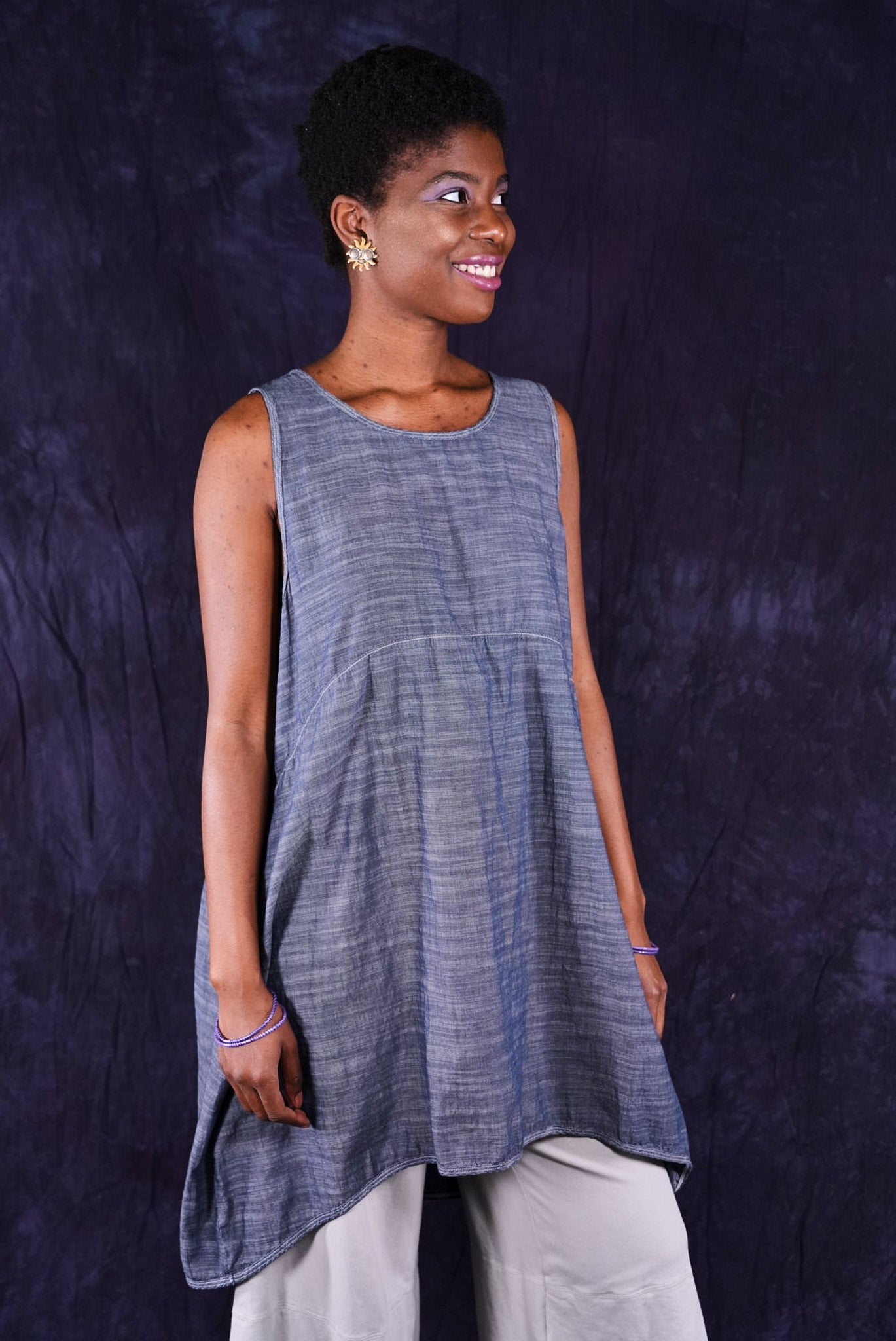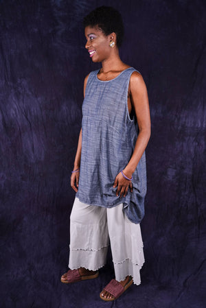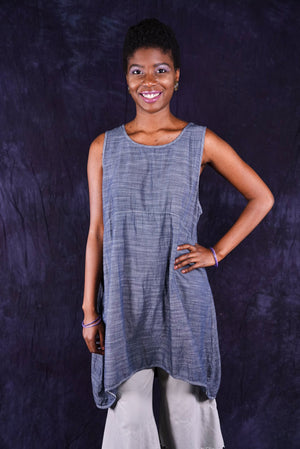 Beautiful, light-weight mid-layer with a subtle stripe. Will keep you cool all season long. Wear alone or layer with ANYTHING! A tee, linen dress, tunic or a cardigan or sweatshirt for warmth. Looks great over pants or skirts. The binding around the neckline and armholes adds to the styling.