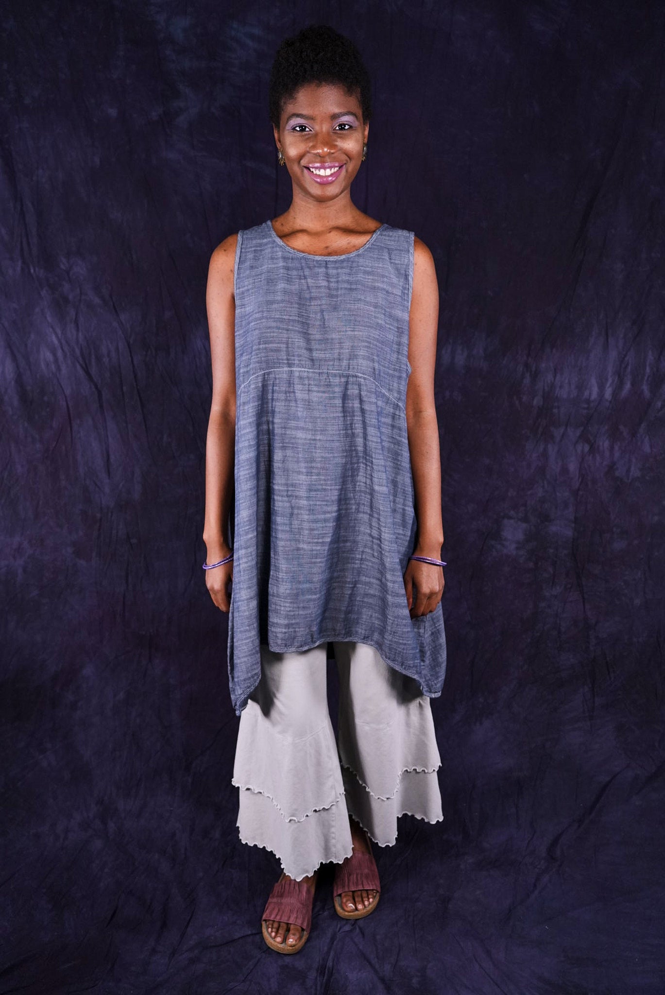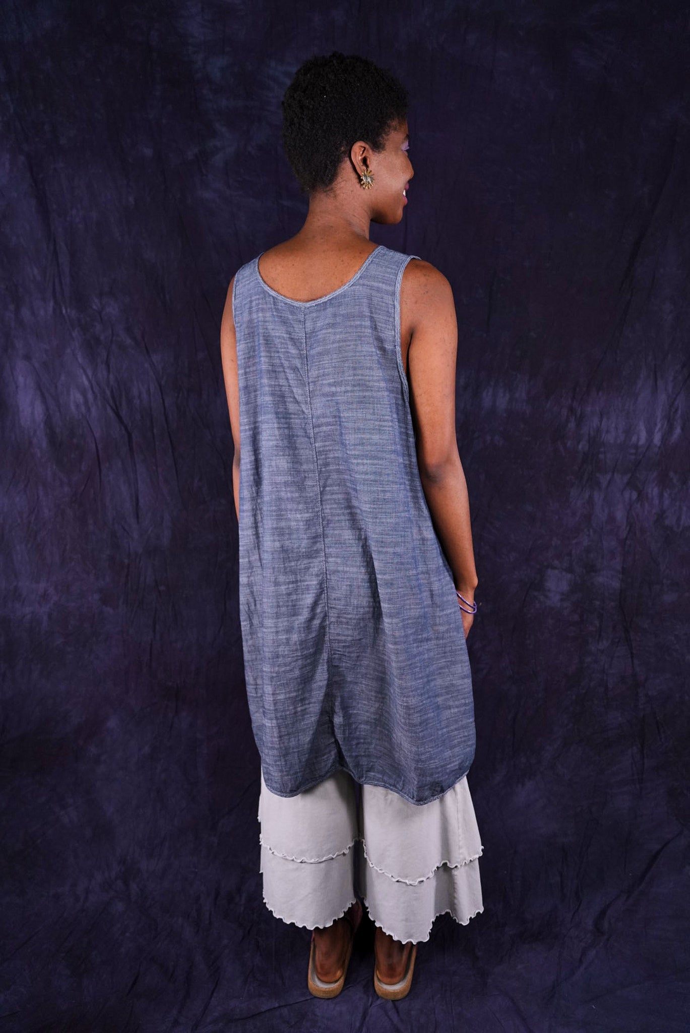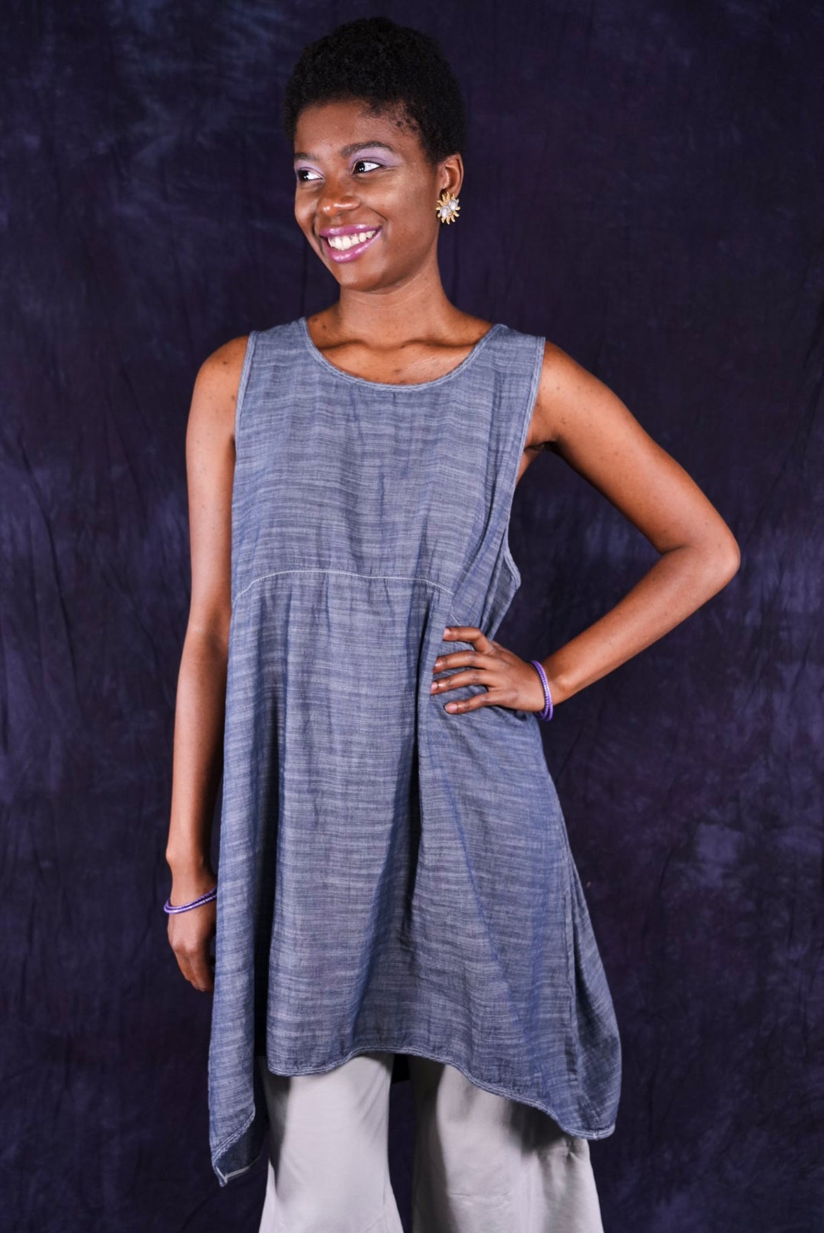 Beautiful, light-weight mid-layer with a subtle stripe. Will keep you cool all season long. Wear alone or layer with ANYTHING! A tee, linen dress, tunic or a cardigan or sweatshirt for warmth. Looks great over pants or skirts. The binding around the neckline and armholes adds to the styling.