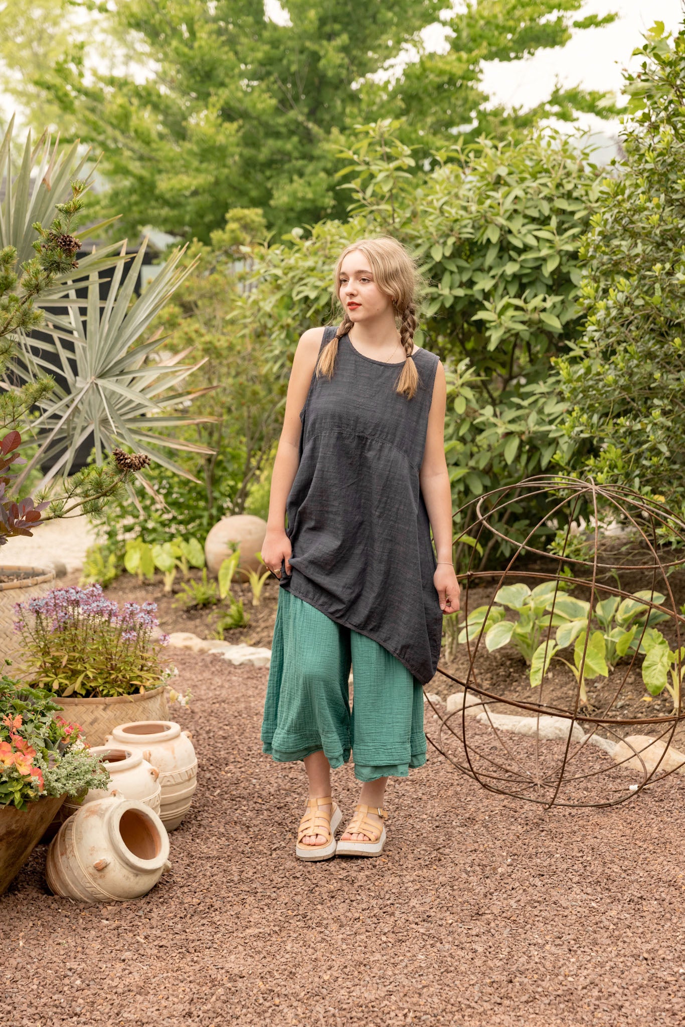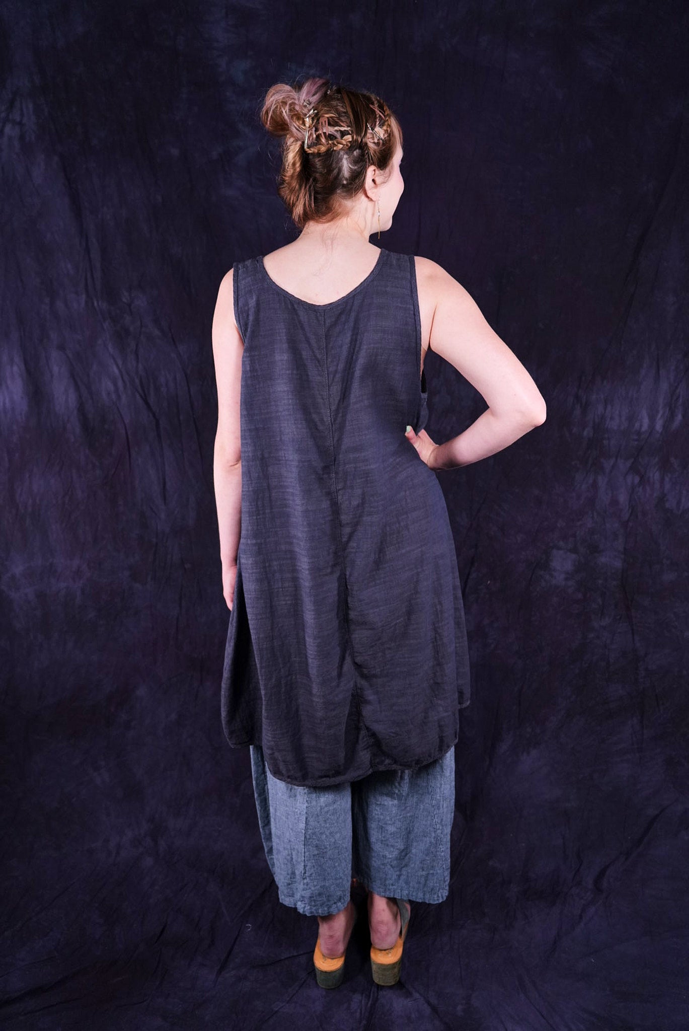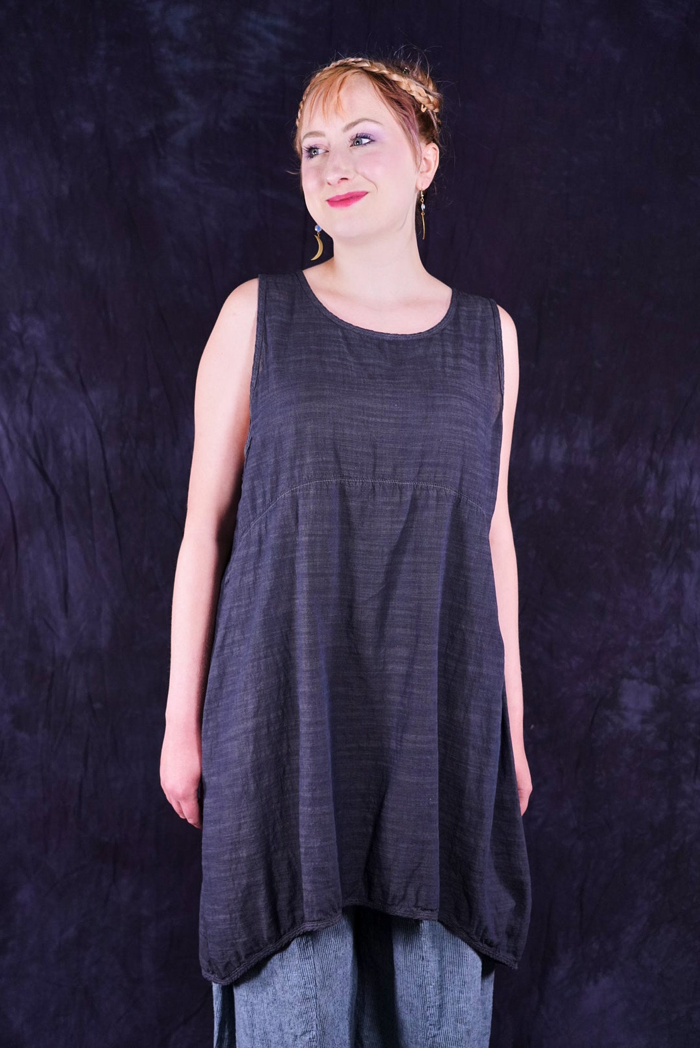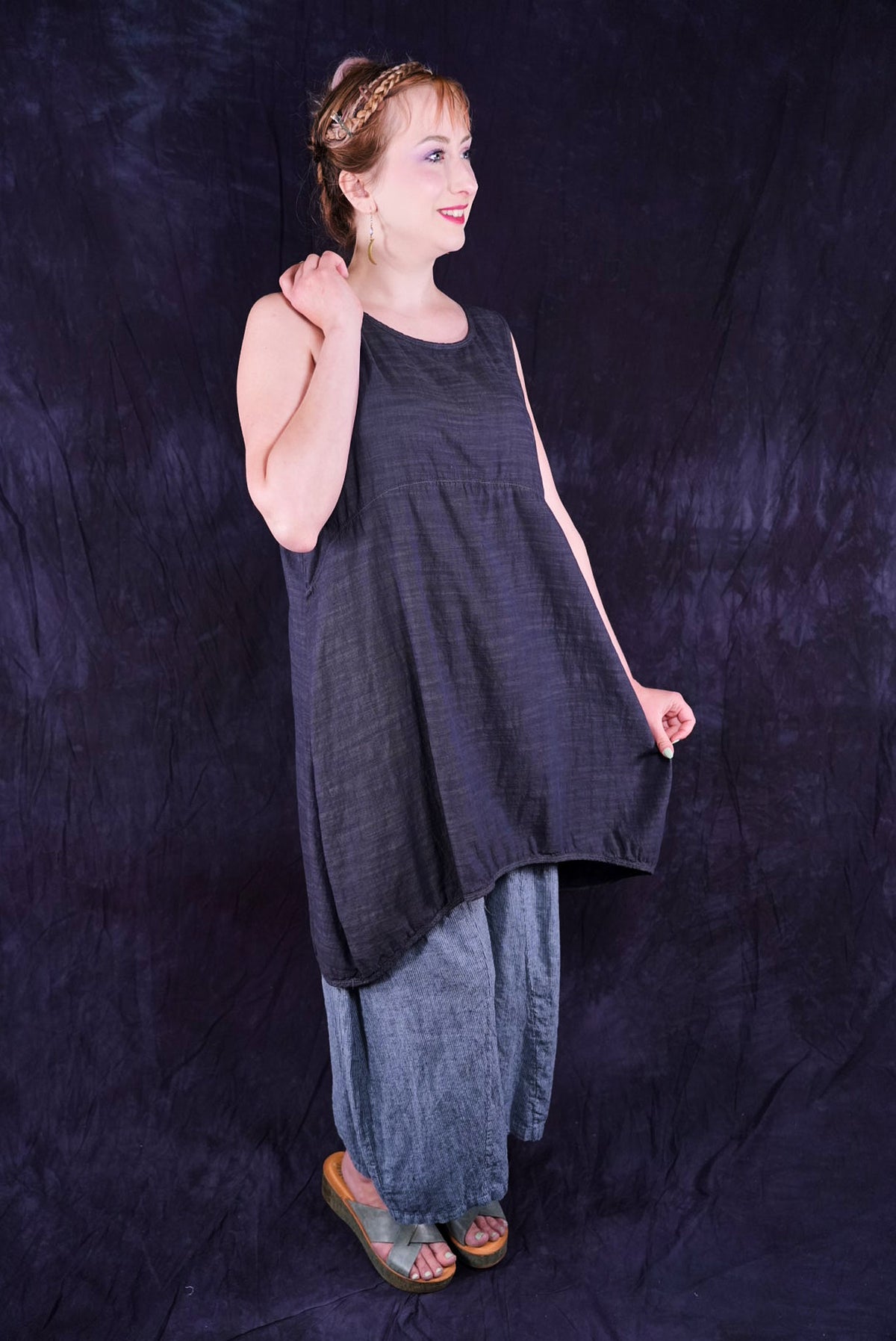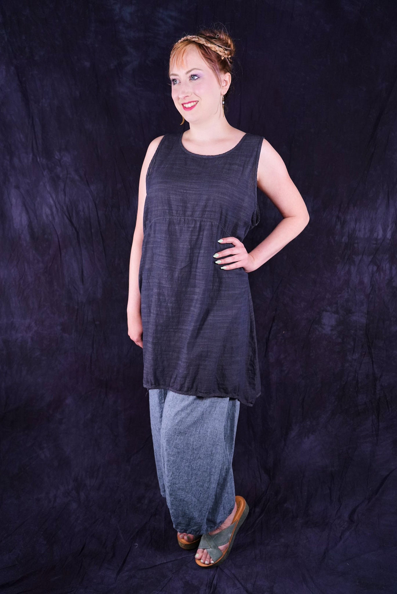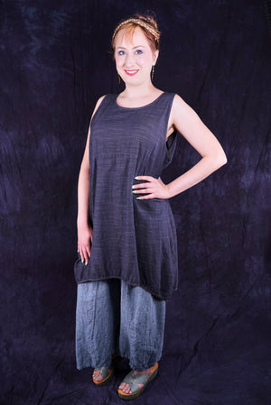 Beautiful, light-weight mid-layer with a subtle stripe. Will keep you cool all season long. Wear alone or layer with ANYTHING! A tee, linen dress, tunic or a cardigan or sweatshirt for warmth. Looks great over pants or skirts. The binding around the neckline and armholes adds to the styling.