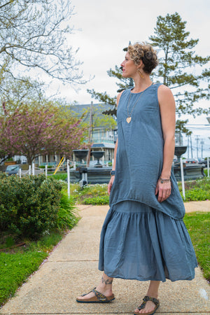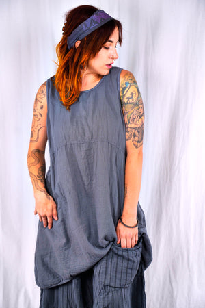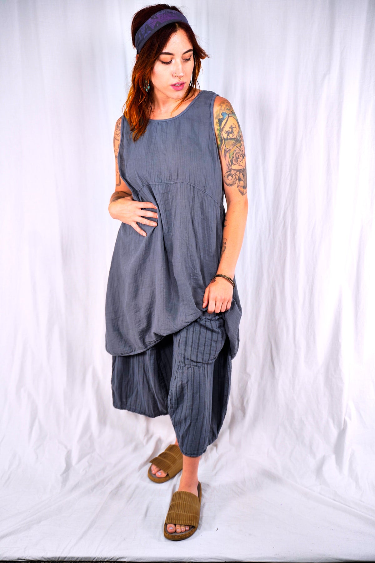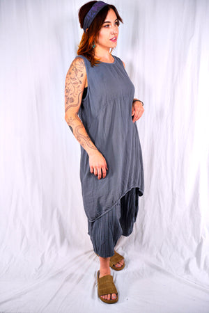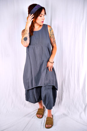 Most versatile midlayer made of 100% light and cool, floaty textured cotton. Edged at neck and hem in organic cotton, this piece is cut a little higher in front and longer in the back. Wear it alone as a sundress or layer with pants, cardigan, layering tank, or shirt. Endless possiblities! Nice longer tank for wearing under a cardi.