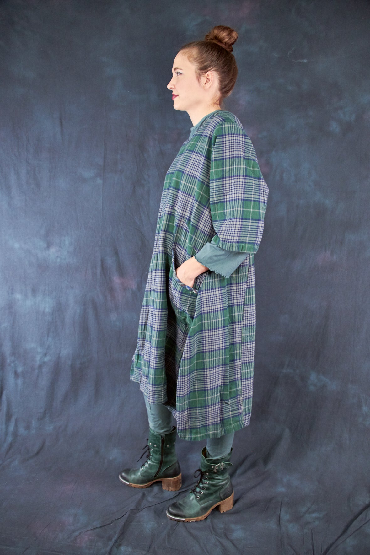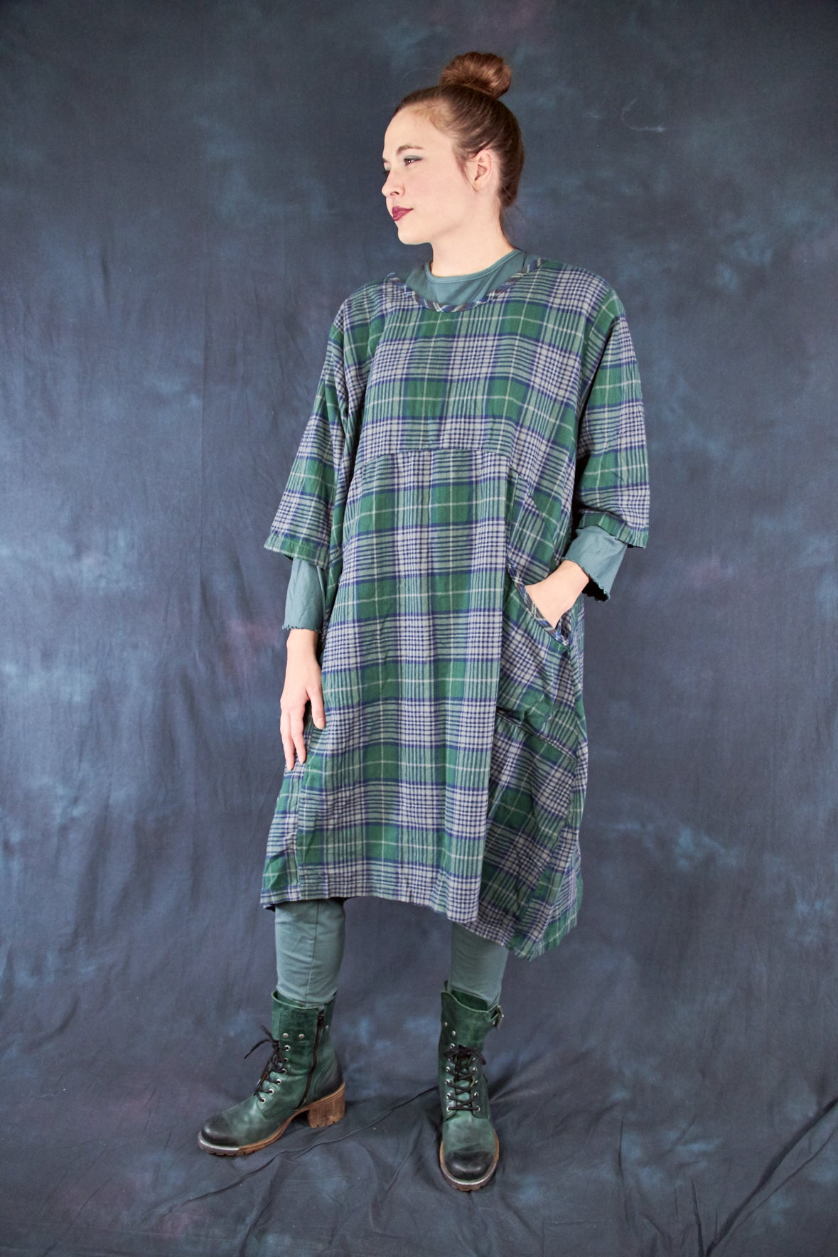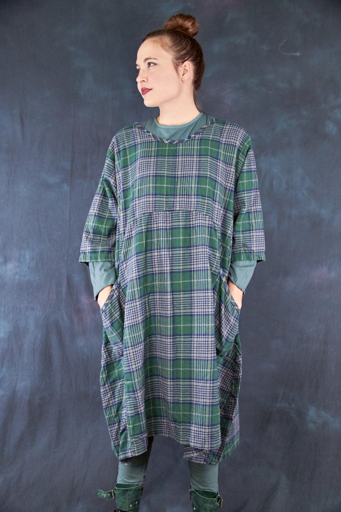 A gorgeously draping tunic dress for any occasion. Trimmed in slightly contrasting cotton plaid at the neck, arms and hem, with a widely scooped hem, this flannel tunic is a Blue Fish classic.