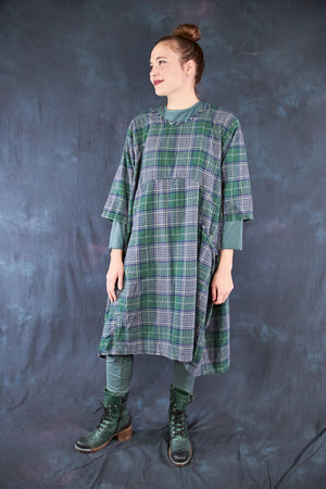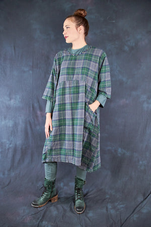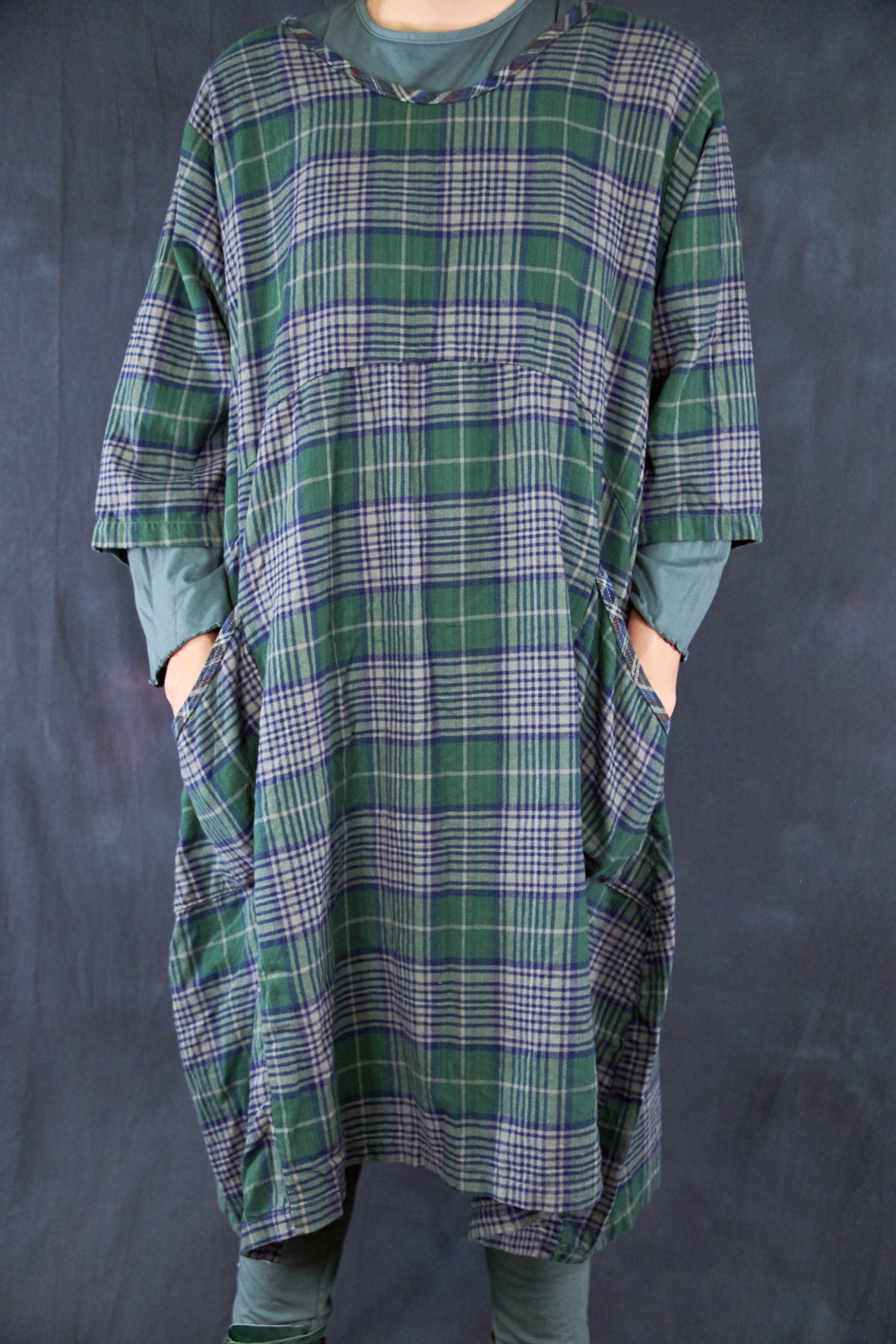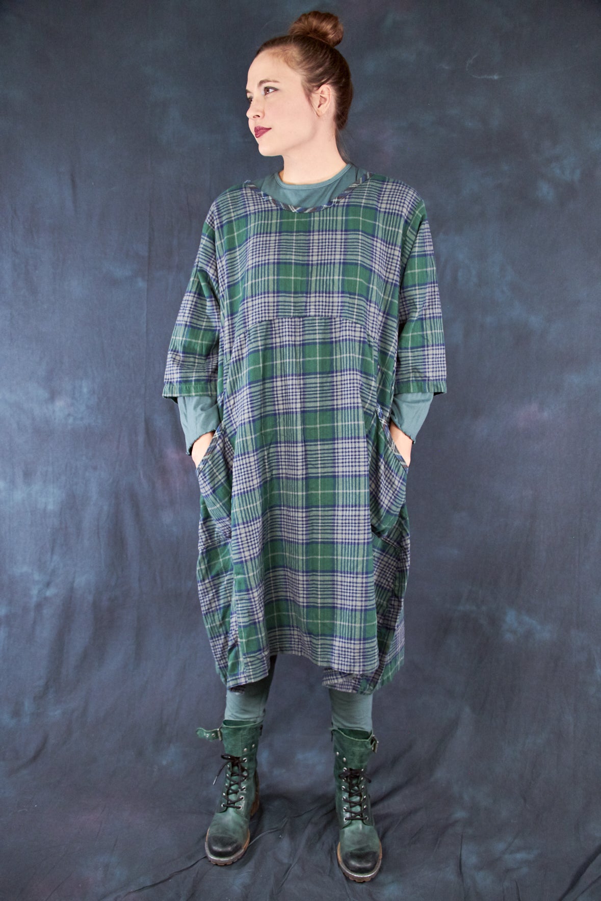 A gorgeously draping tunic dress for any occasion. Trimmed in slightly contrasting cotton plaid at the neck, arms and hem, with a widely scooped hem, this flannel tunic is a Blue Fish classic.
