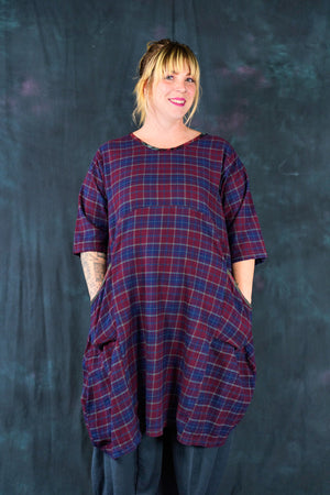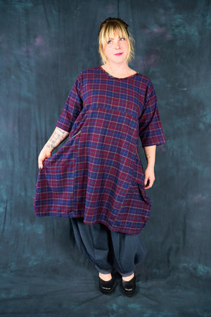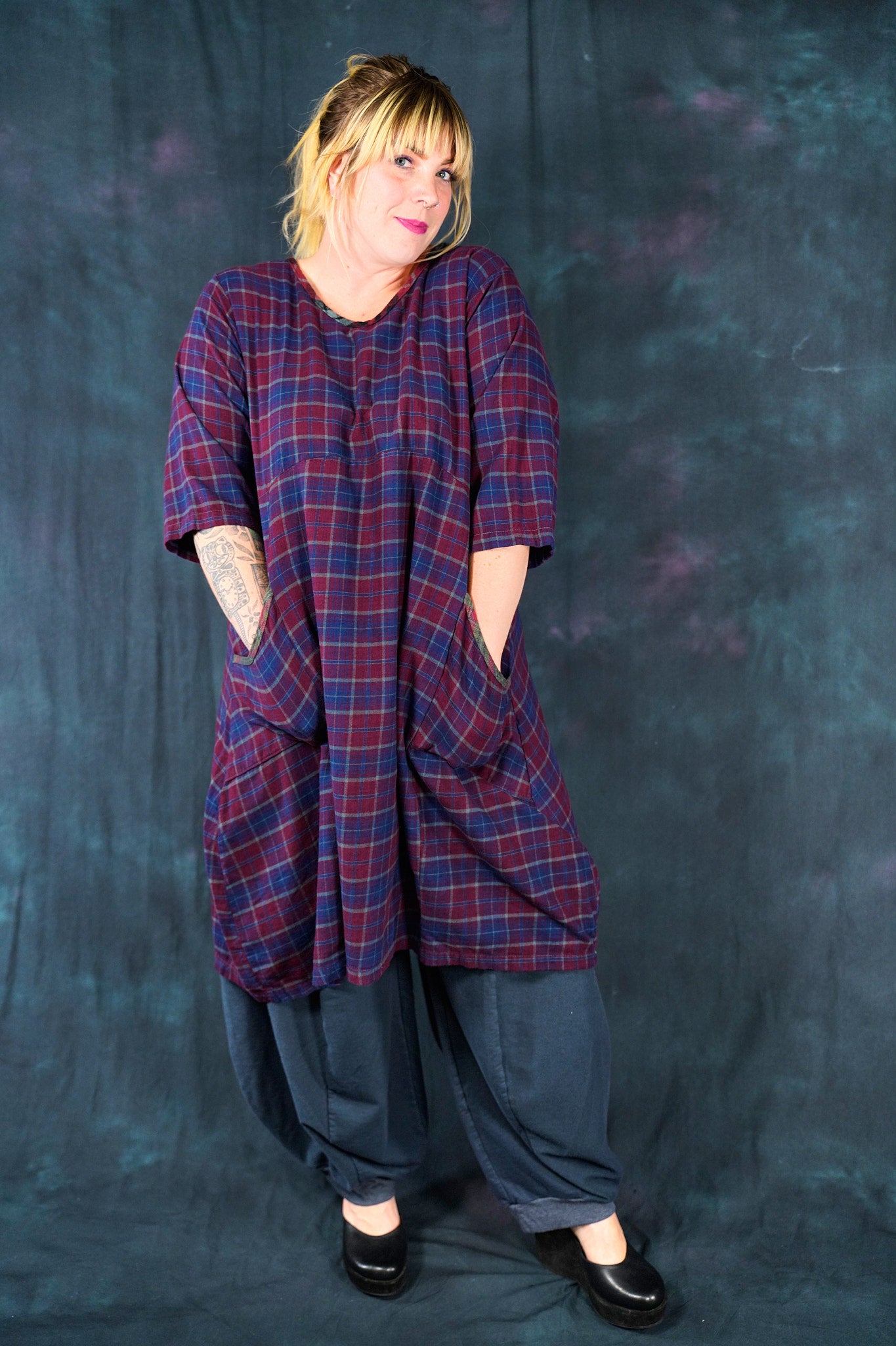 A gorgeously draping tunic dress for any occasion. Trimmed in slightly contrasting cotton plaid at the neck, arms and hem, with a widely scooped hem, this tunic is a Blue Fish classic. Burgundy and blues in soft and warm cotton flannel which we have over-dyed.