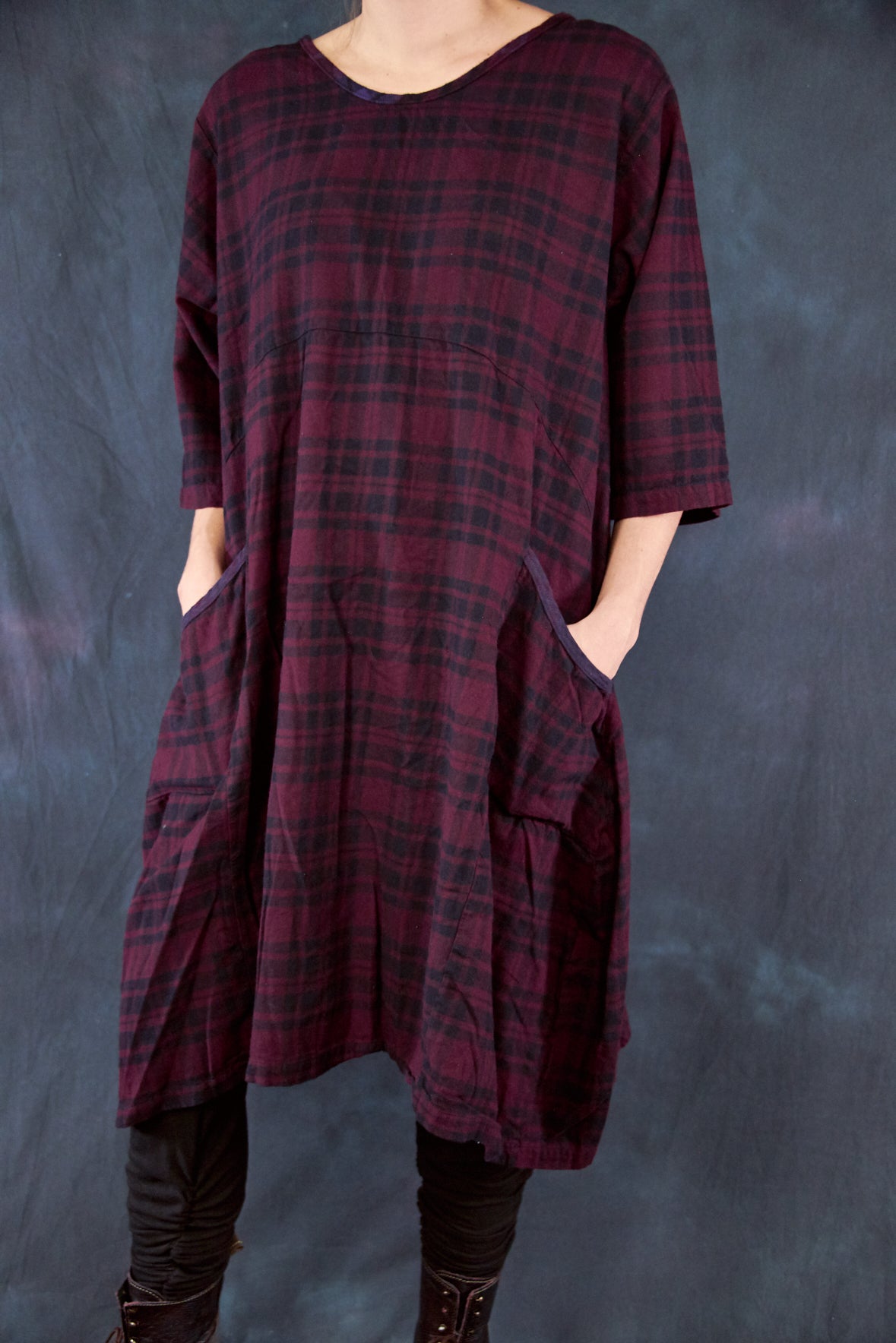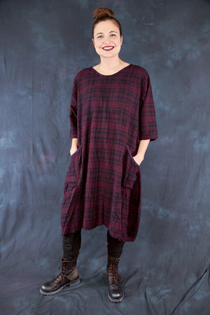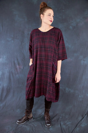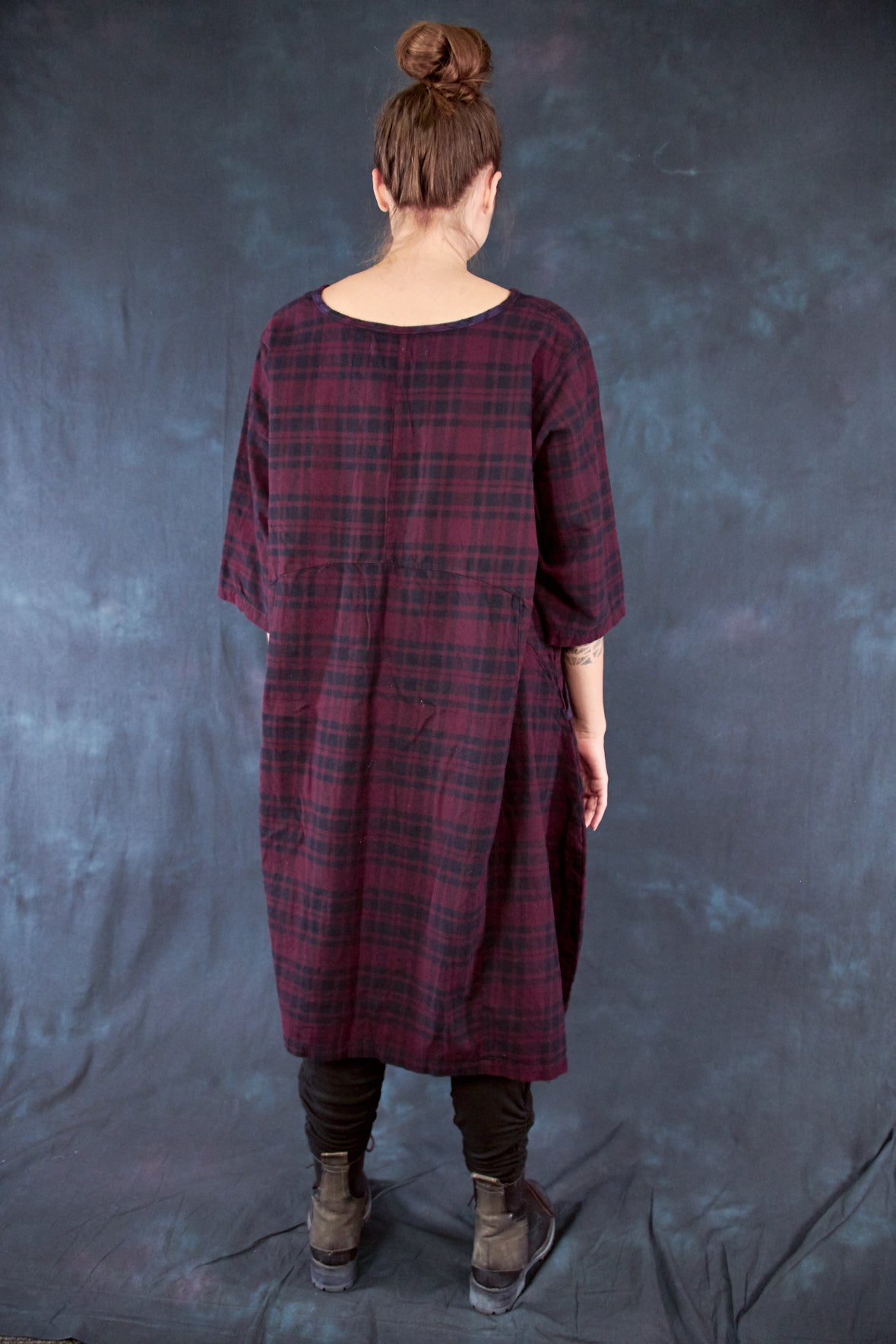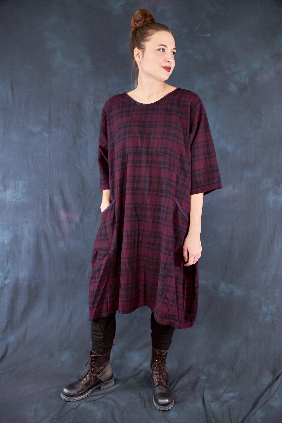 A gorgeously draping tunic dress for any occasion. Trimmed in slightly contrasting cotton plaid at the neck, arms and hem, with a widely scooped hem, this flannel tunic is a Blue Fish classic. Layer under a #5142 Hoodie as shown in thumbnail photos.