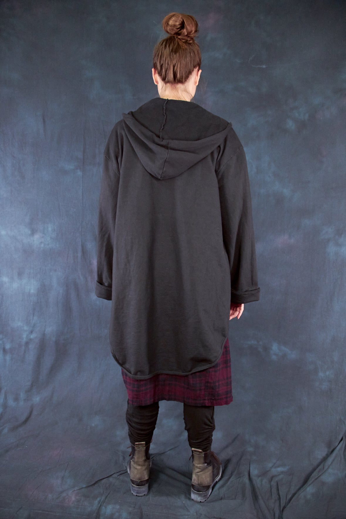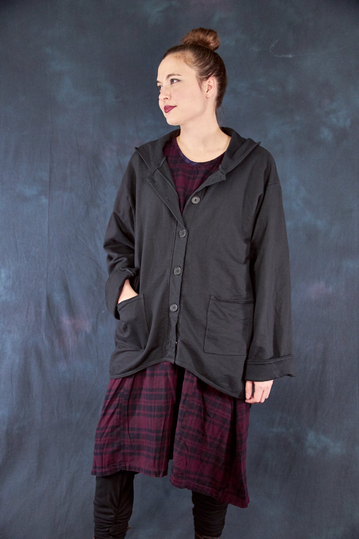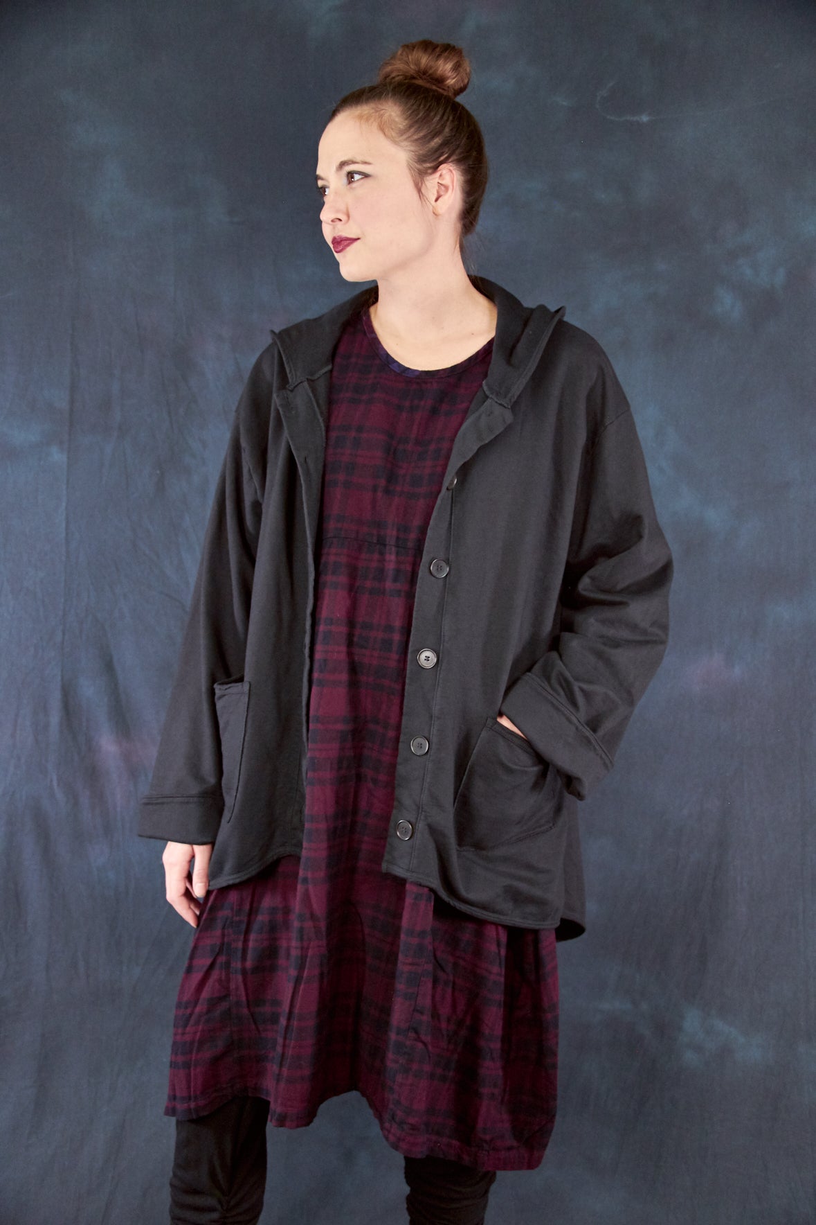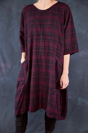 A gorgeously draping tunic dress for any occasion. Trimmed in slightly contrasting cotton plaid at the neck, arms and hem, with a widely scooped hem, this flannel tunic is a Blue Fish classic. Layer under a #5142 Hoodie as shown in thumbnail photos.