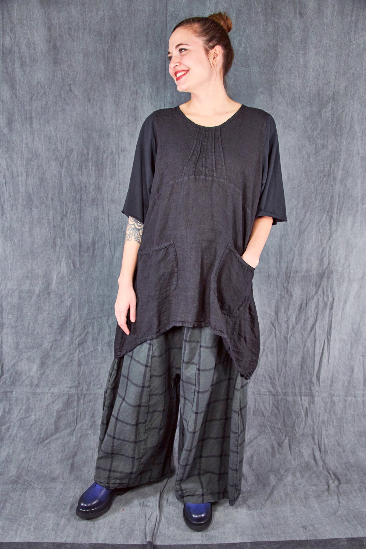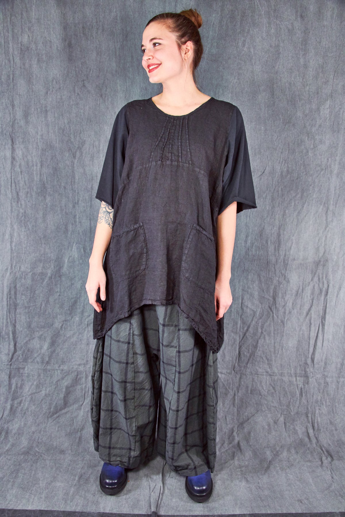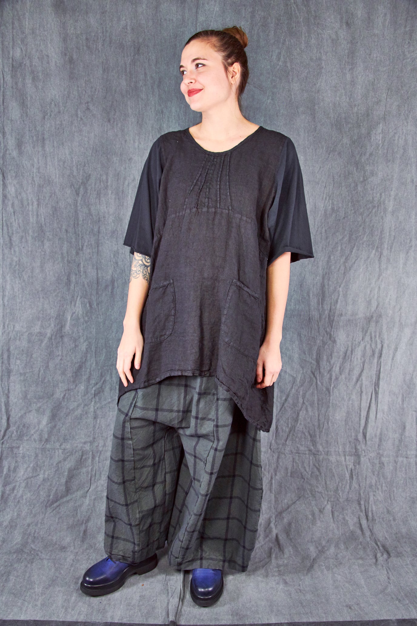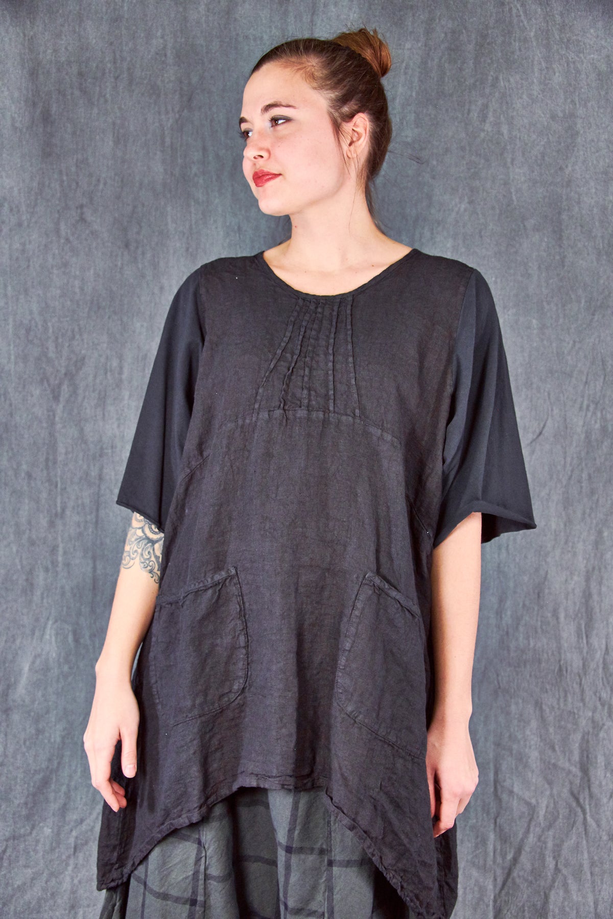 Every detail of this piece is classic Blue Fish! This unique style functions as a dress or tunic, depending on your height. We love how easy it is to wear... paired with your favorite pants, the curved shape creates an unforgettable silhouette. This one is unprinted, making it the perfect backdrop for jewelry or an easy companion to printed pants/leggings.