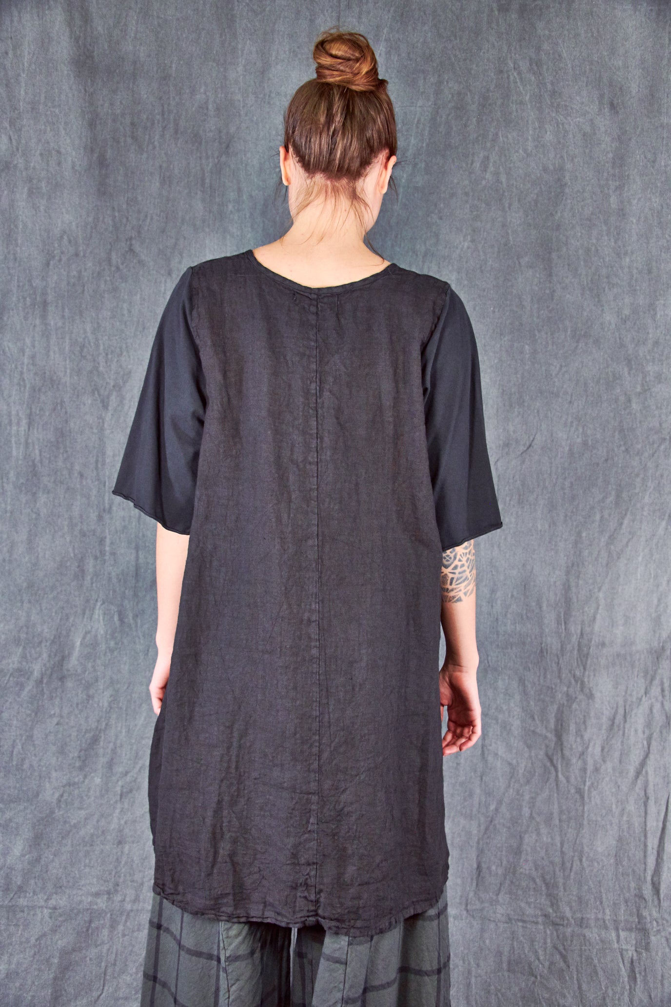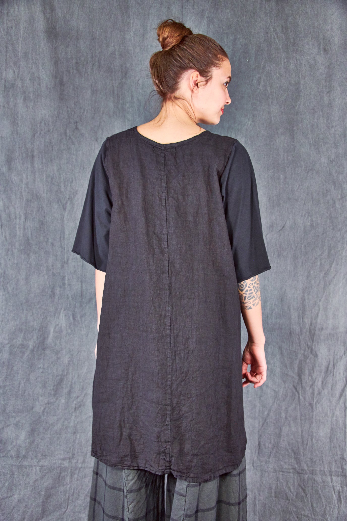 This mid-weight linen dress features a flattering a-line shape, pockets, generously cut organic cotton stretch sleeves, a pinched seam detail on the bodice, & a hemline five inches longer in the back. Zoom to see all of the wonderful details.