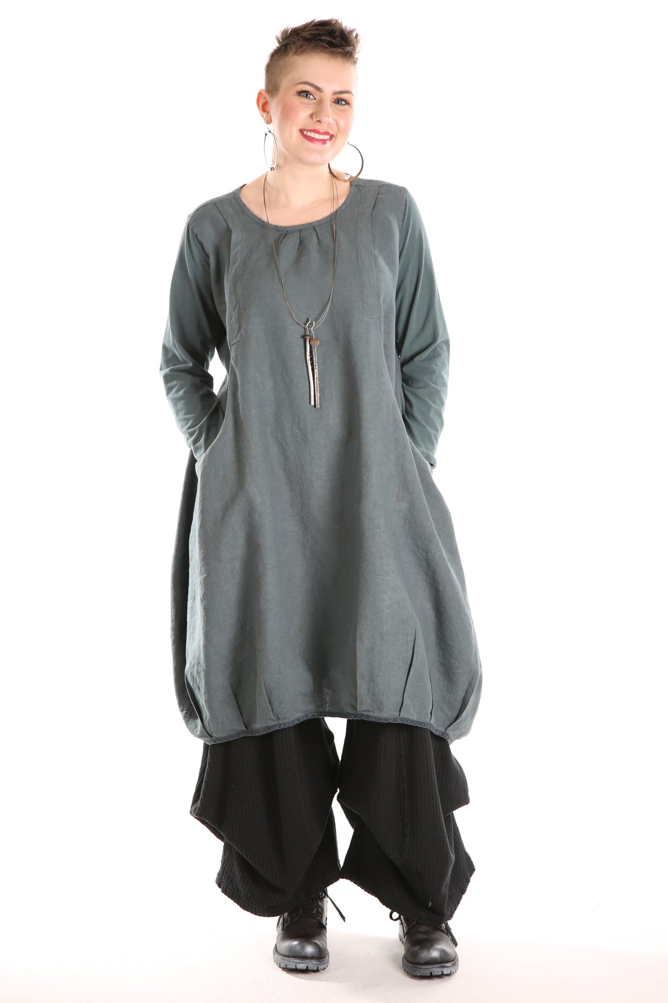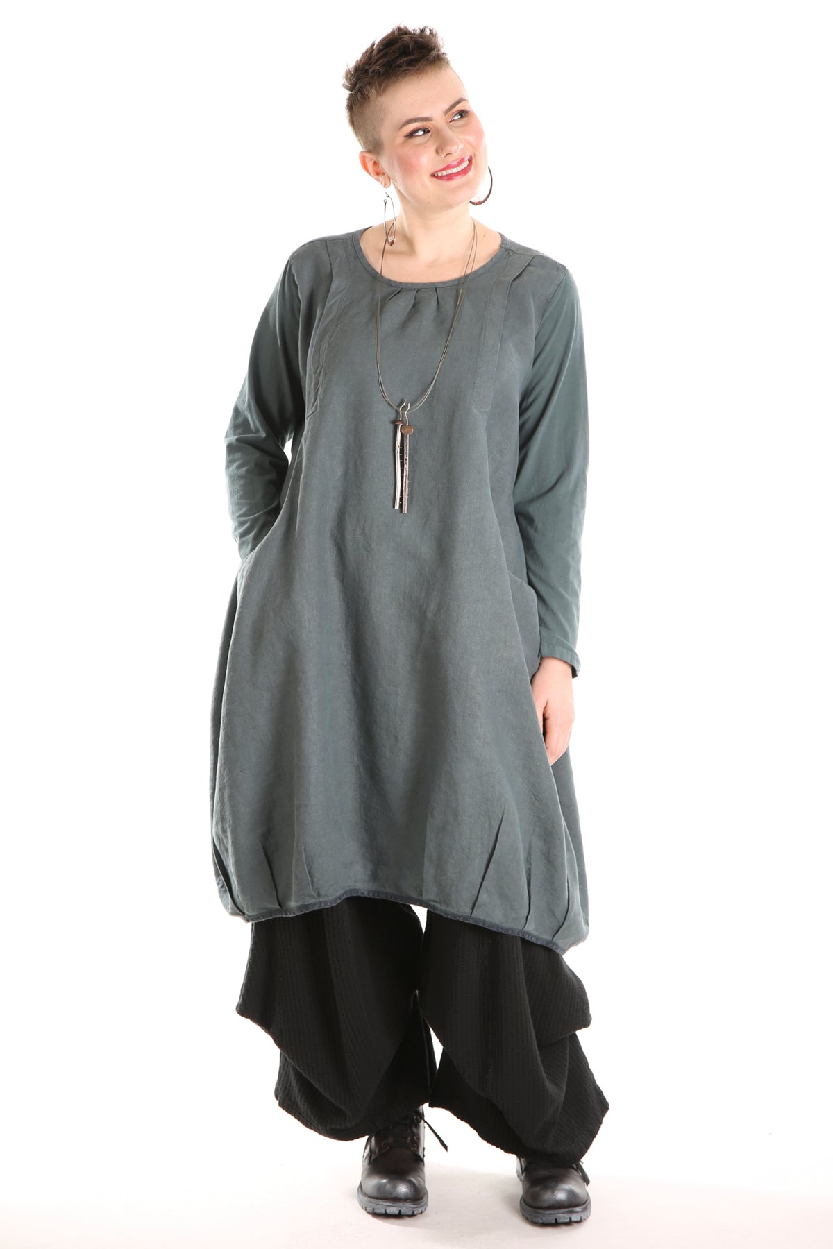 Flattering shape is enhanced by tucks placed around the hemline. Wonderful large pockets which are designed into the dress. Sure to be a favorite! Wear over tights or leggings, or over a long skirt or wide legged pants such as the Klee Pant.