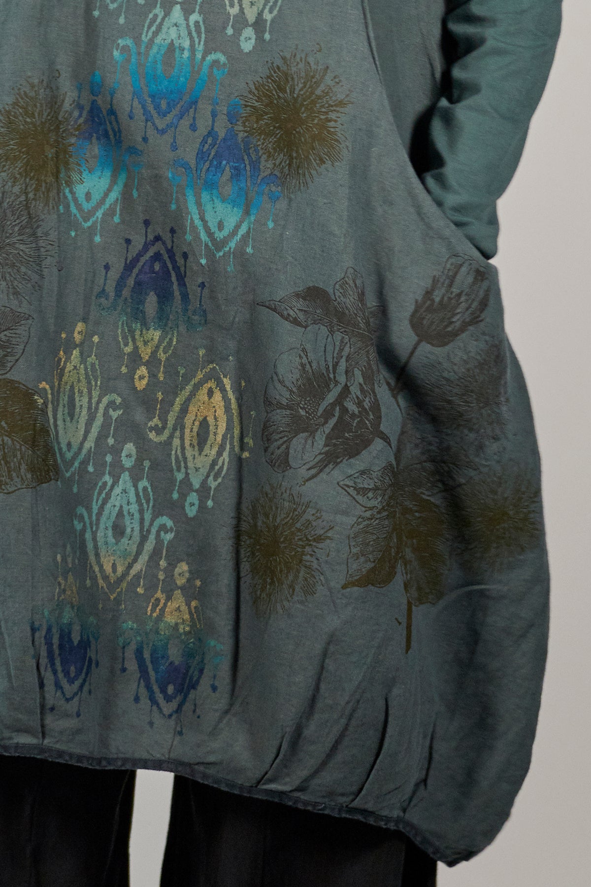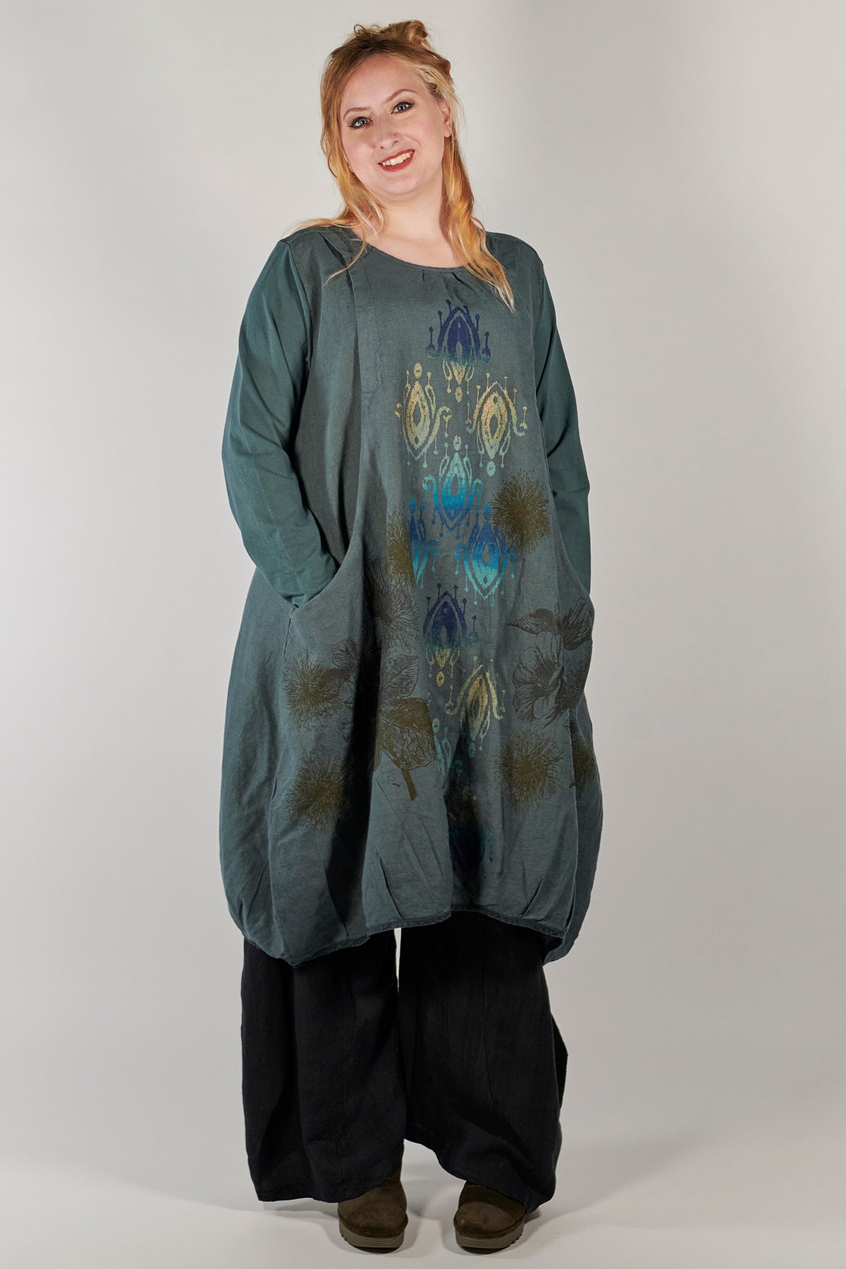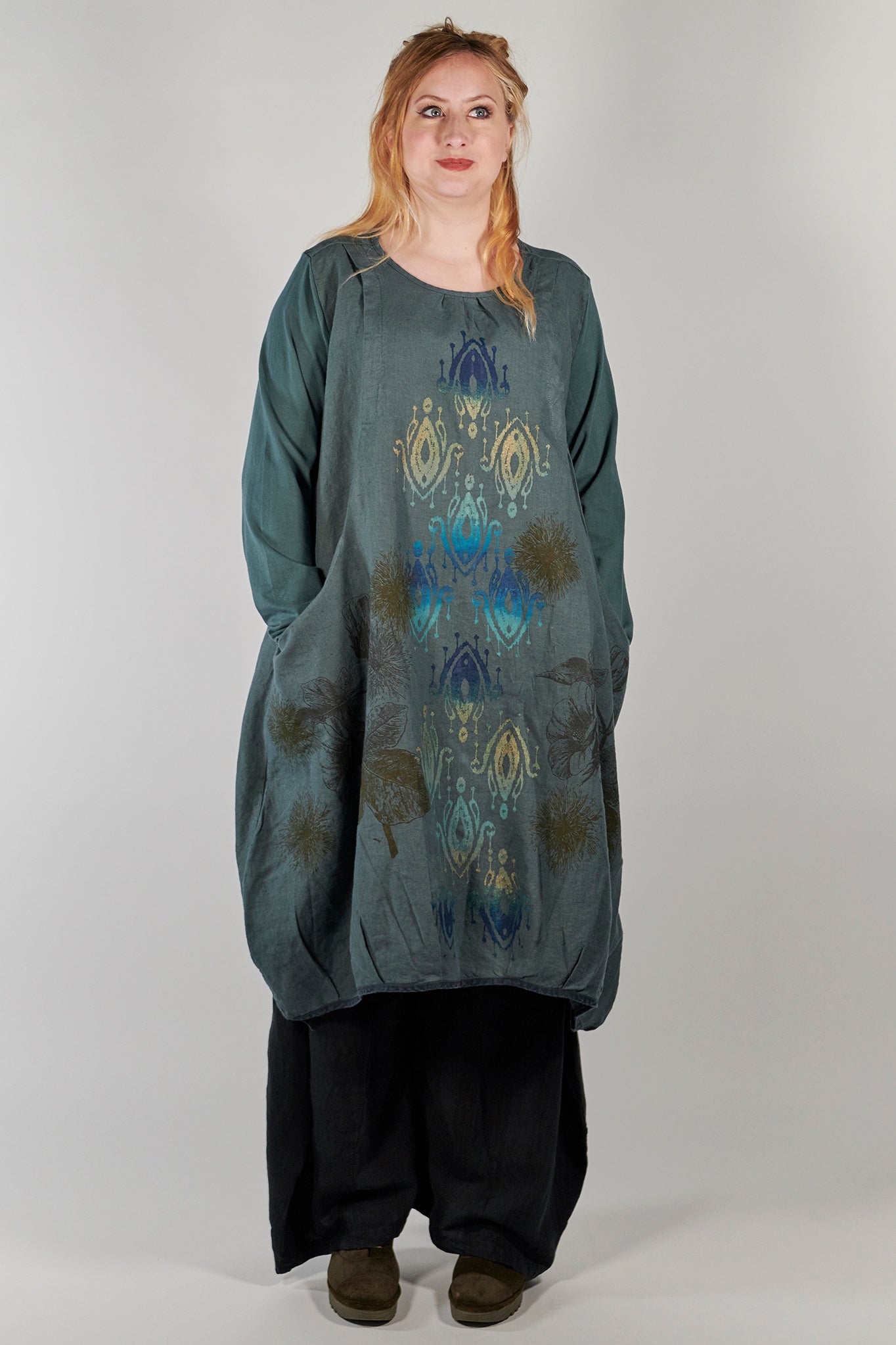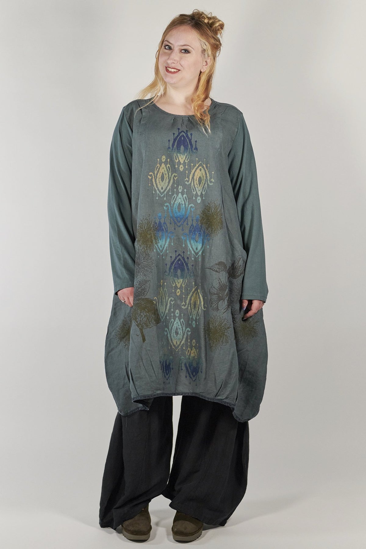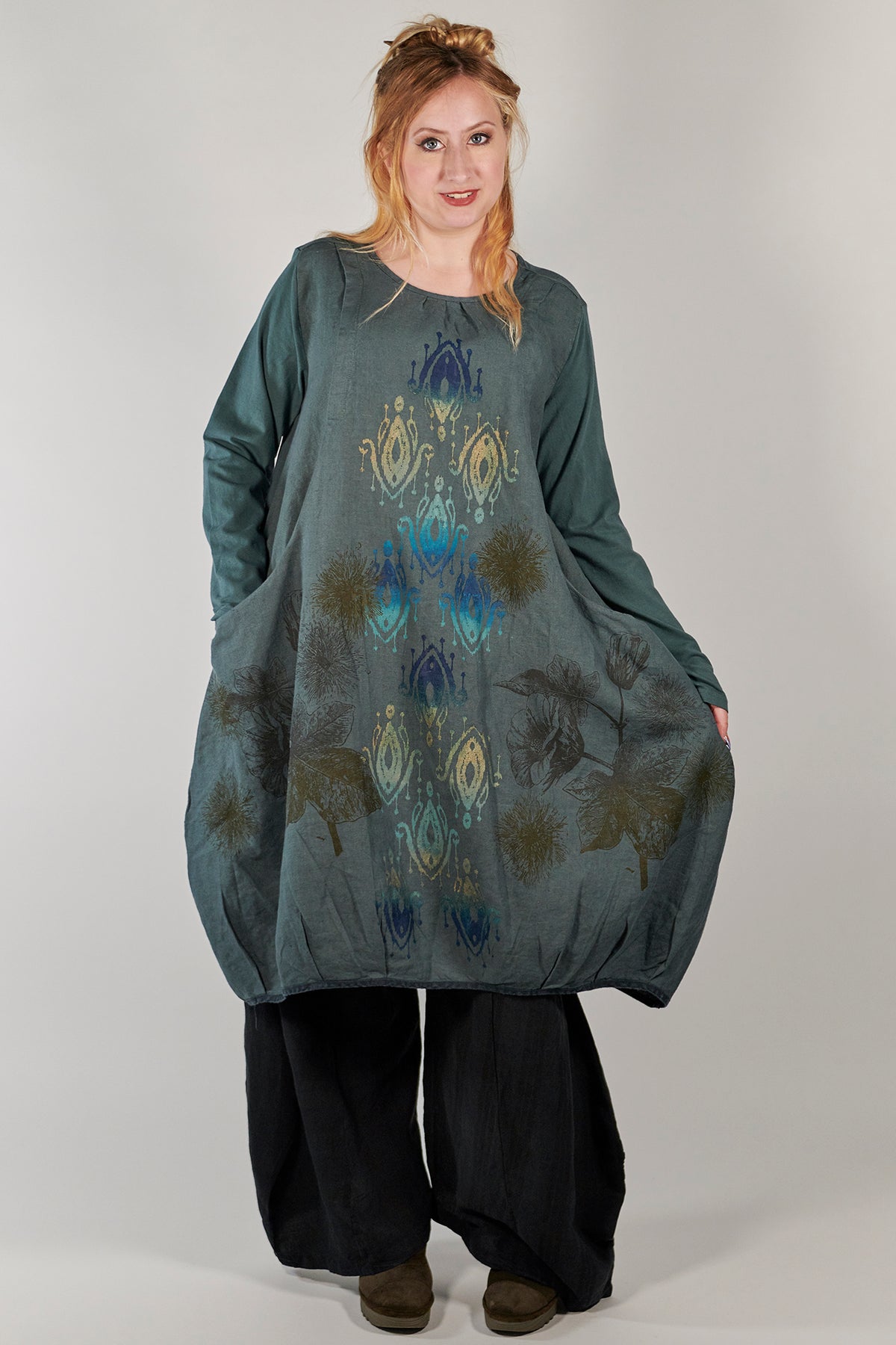 Flattering shape is enhanced by tucks placed around the hemline. Wonderful large pockets which are designed into the dress. Sure to be a favorite! Wear over tights or leggings, or over a long skirt or wide legged pants such as the Klee Pant.