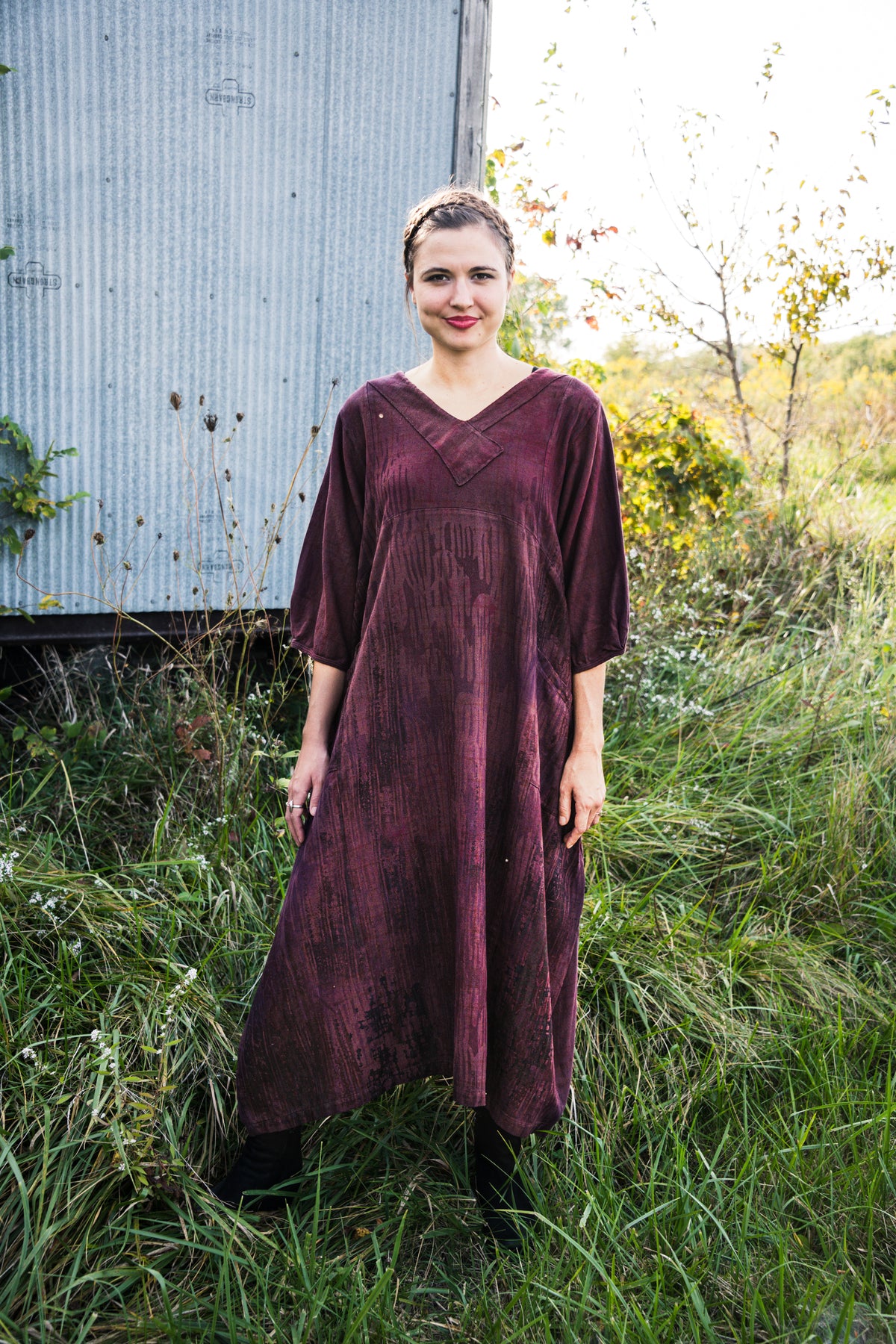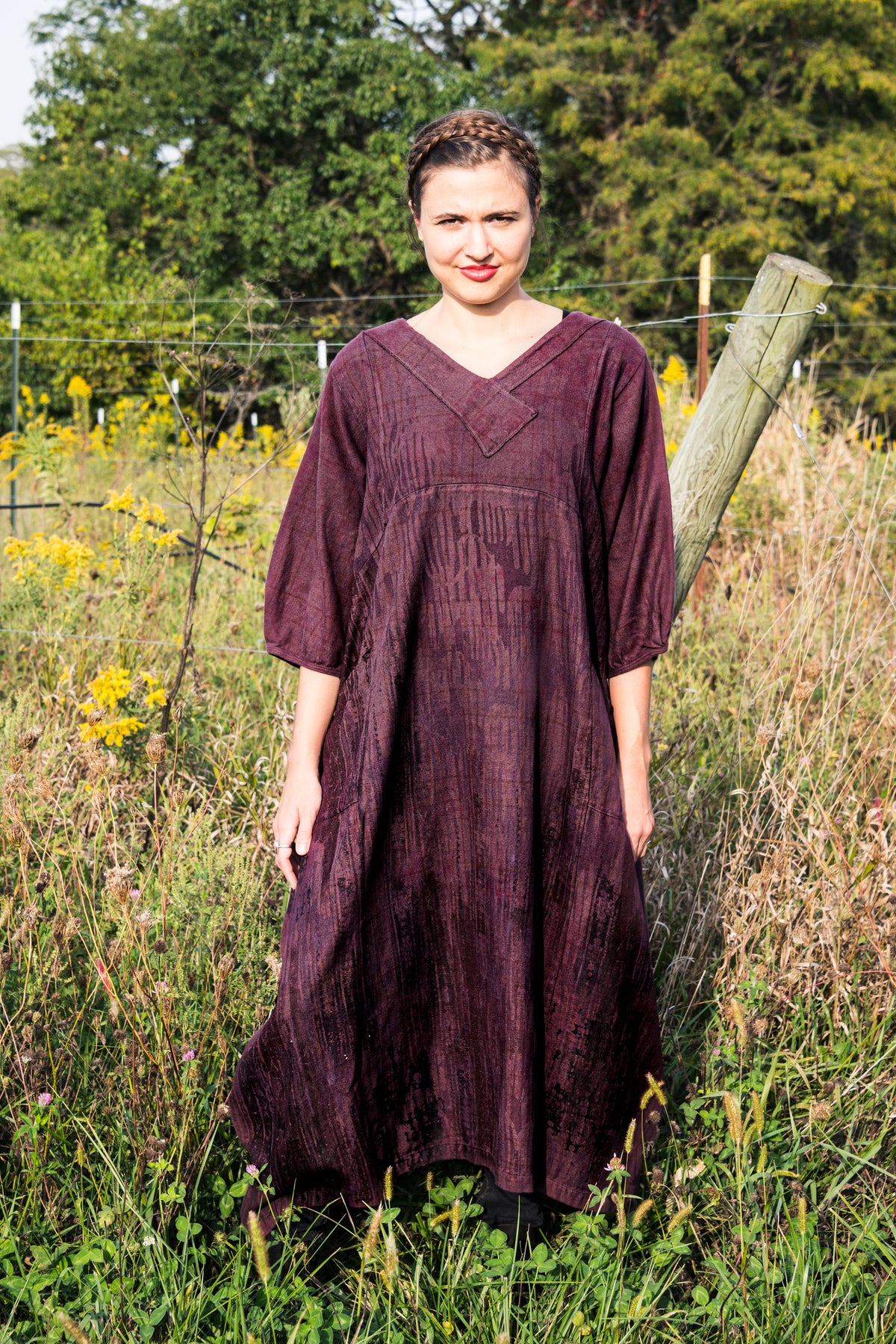When I first saw them, I thought- 'these dresses are blue moon dresses'... they are rare and gorgeous. We have crafted them in the USA from a perfect-weight brushed cotton plaid which we have dyed several times by hand, then hand printed on the front with subtle textures & tones. Each is unique. The style is perfect, a favorite lengthened to 50" which flatters us all whether shorter or taller. Lovely detailed crossover neckline. Made in extremely limited quantities. A dress to fall in love with.