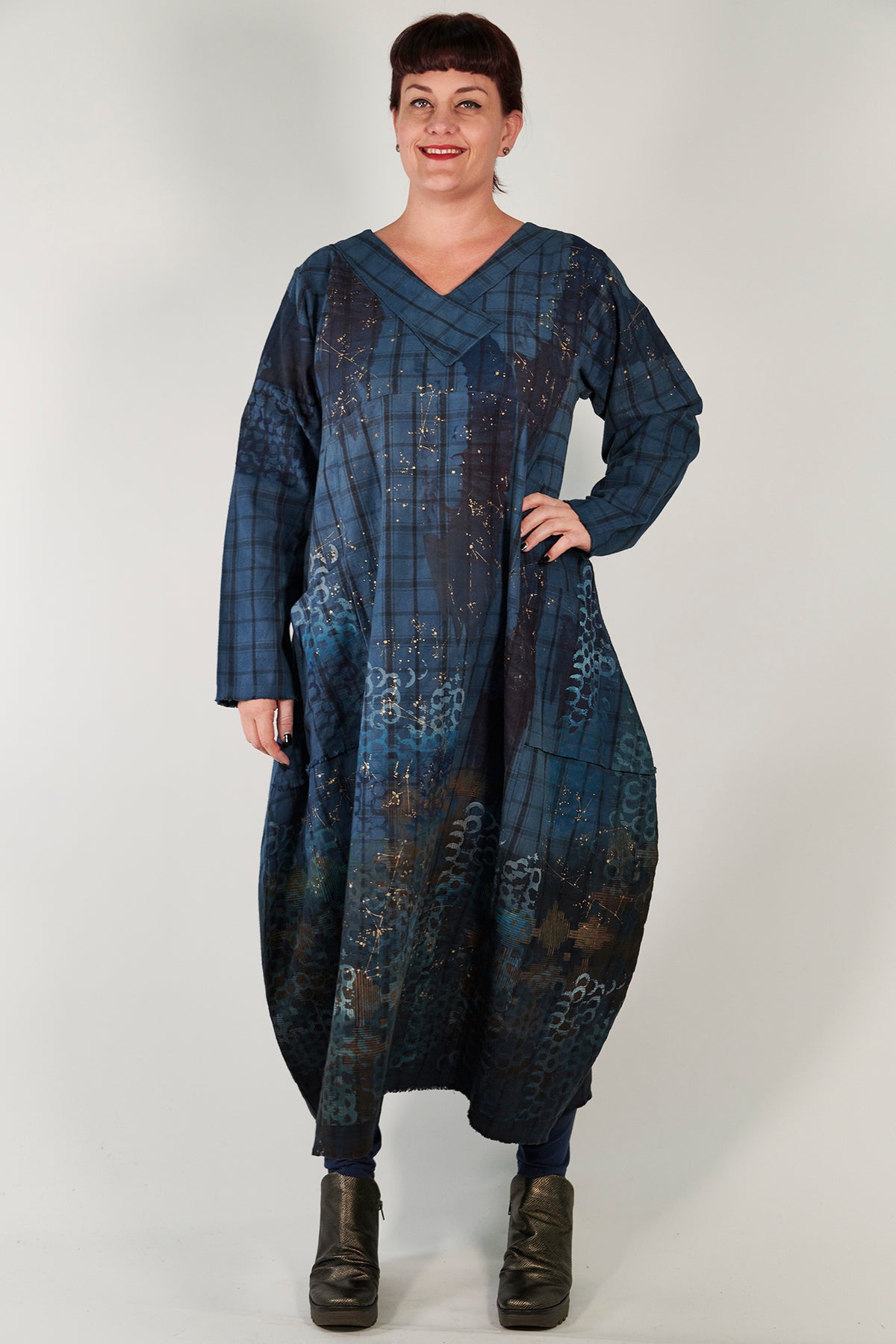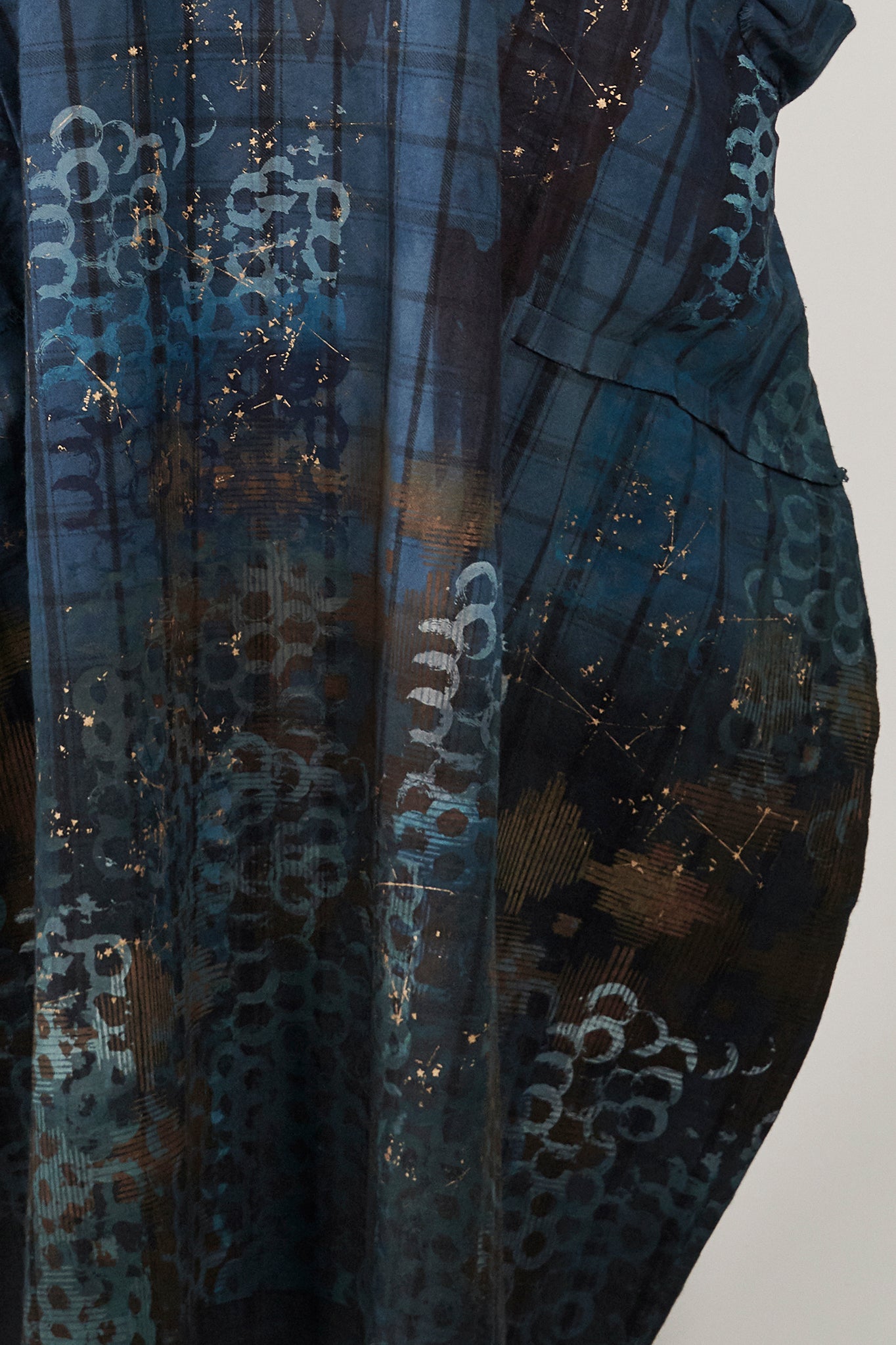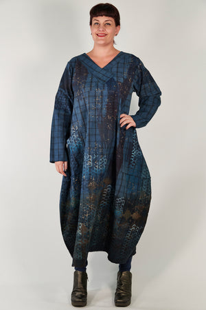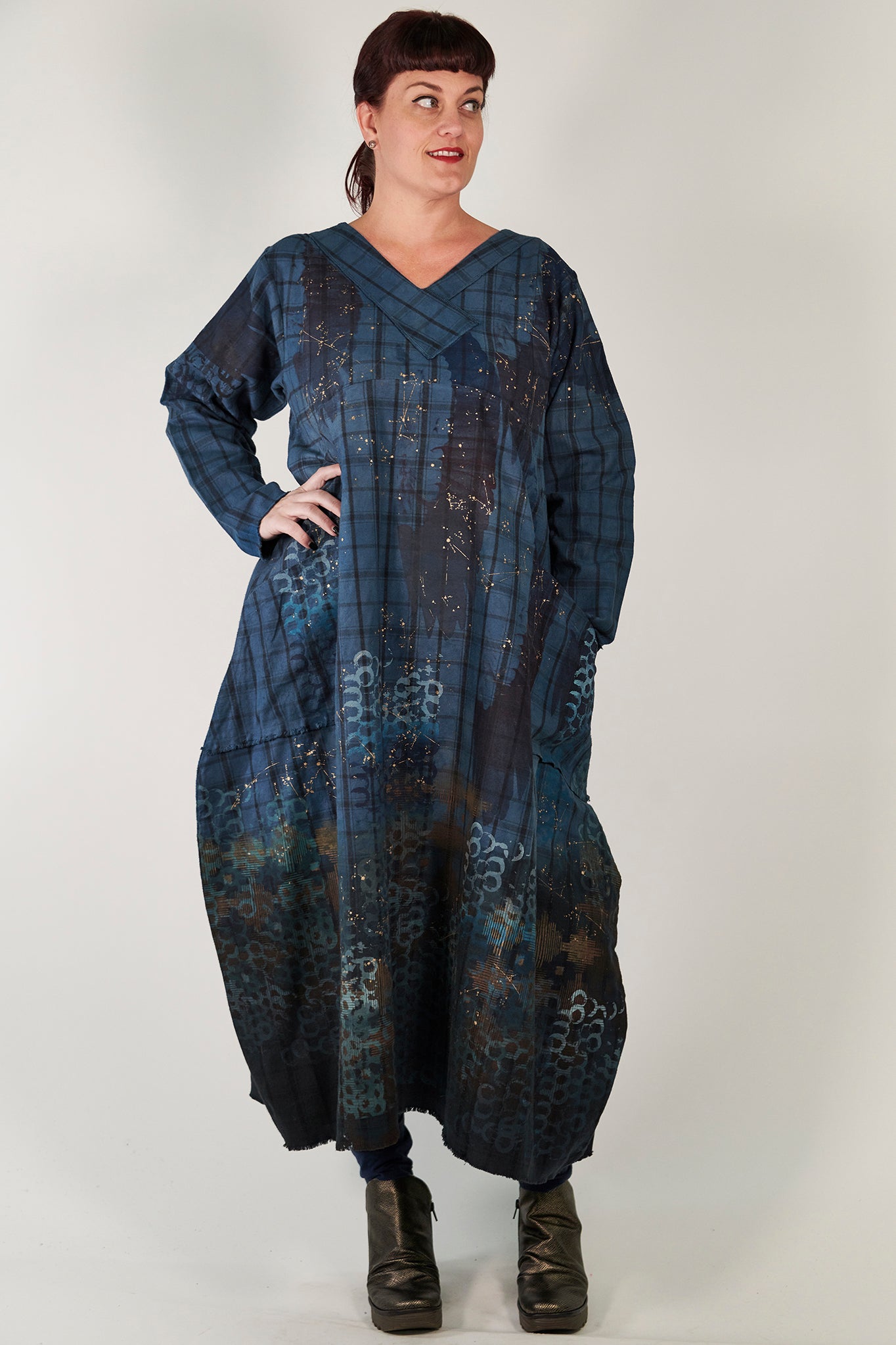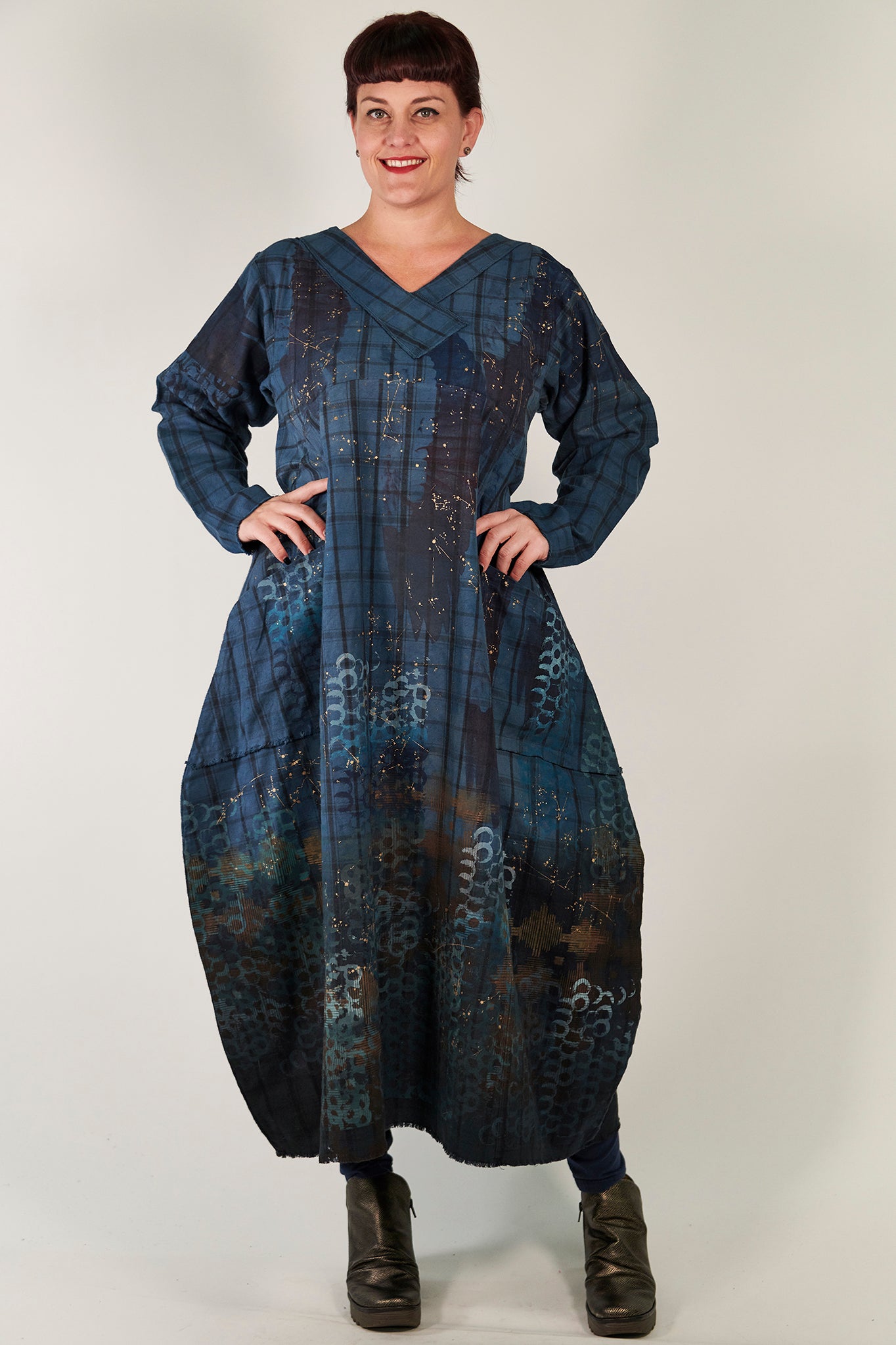 When I first saw them, I thought- 'these dresses are blue moon dresses'... they are rare and gorgeous. We have crafted them in the USA from a perfect-weight brushed cotton plaid which we have dyed several times by hand, and hand printed in intricate layers of shade, design, and texture. Each is unique. The style is perfect, a favorite lengthened to 50" which flatters us all whether shorter or taller. Lovely detailed crossover neckline. Made in extremely limited quantities. A dress to fall in love with.