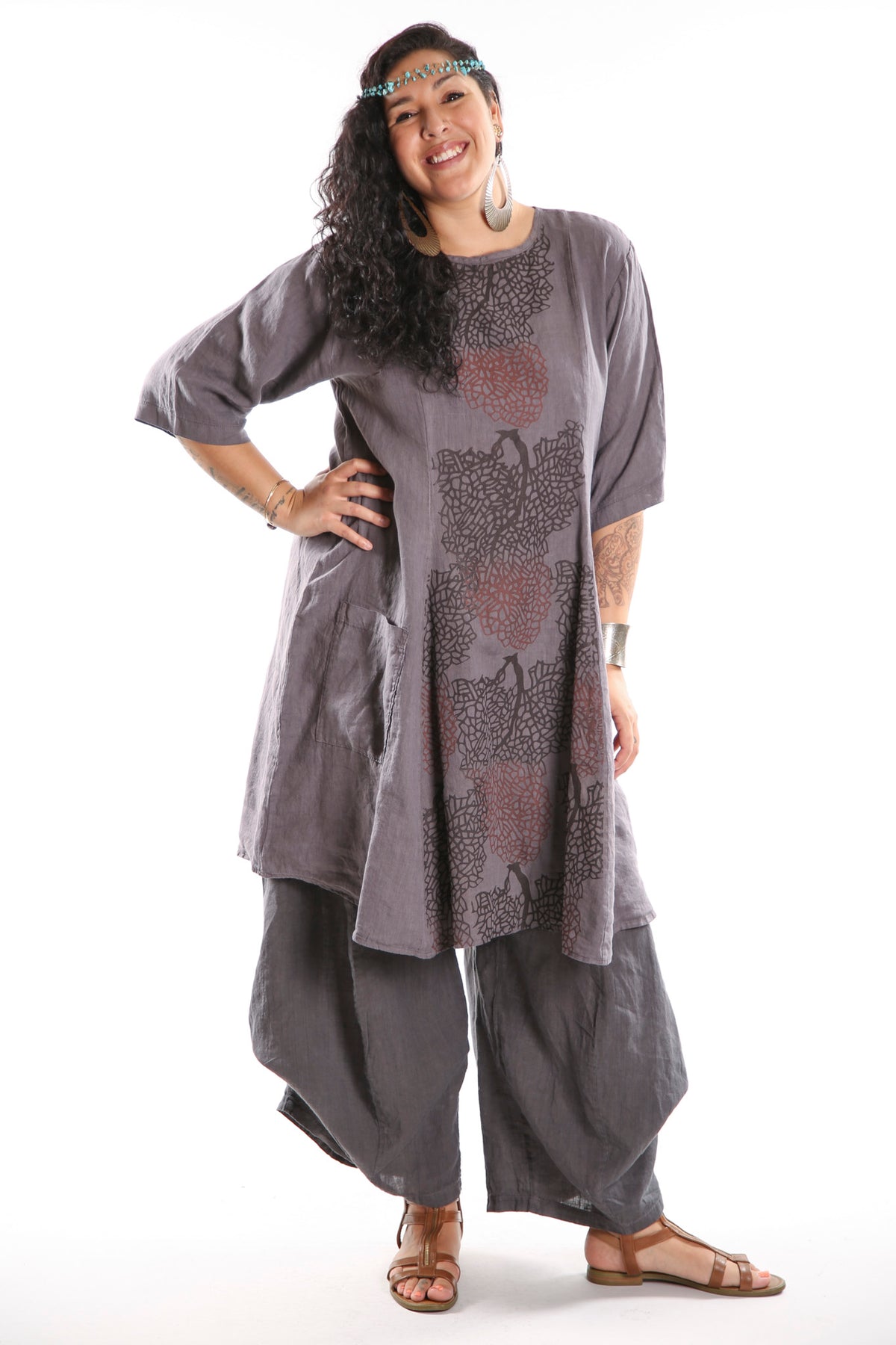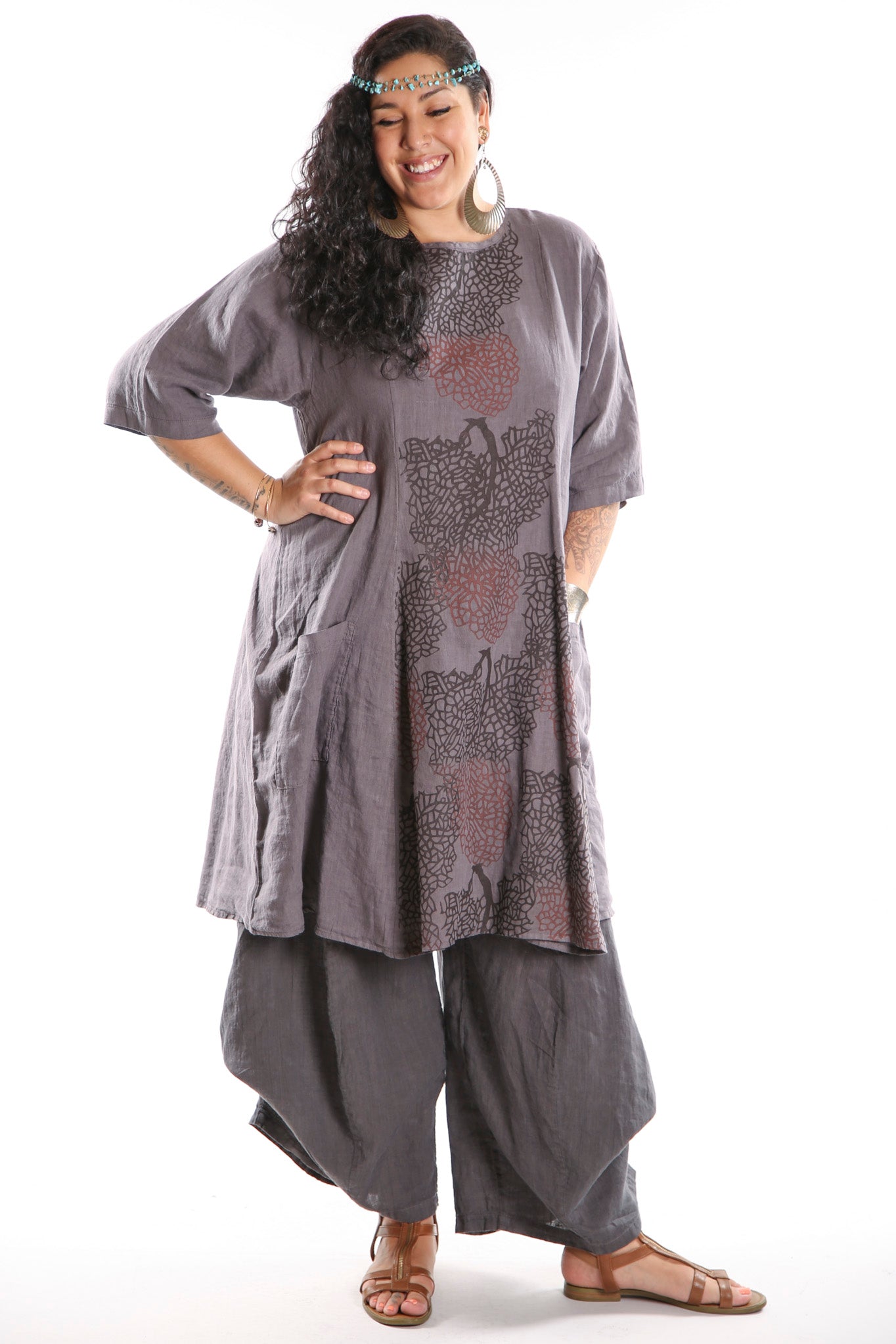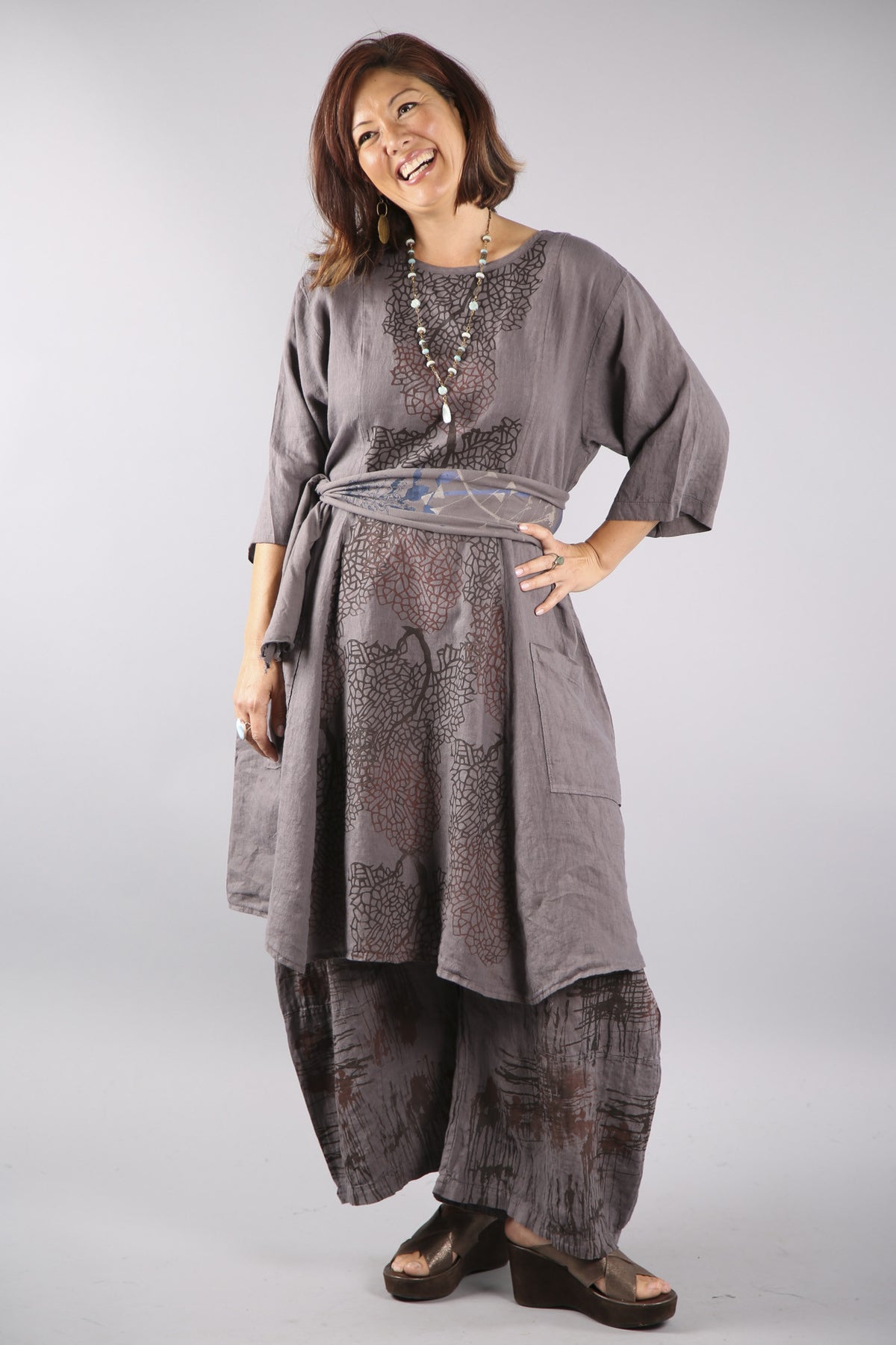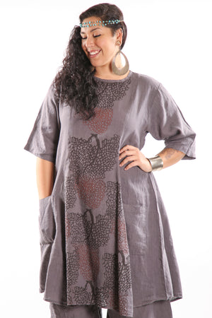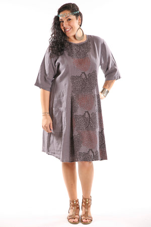 A flattering dress for those with curves. Panelled for shaping, yet the fit from waist to hem is quite generous. Length works well layered over leggings, or wide pants or a long skirt. Pockets, and gorgeous printed layered designs fill the front panel.