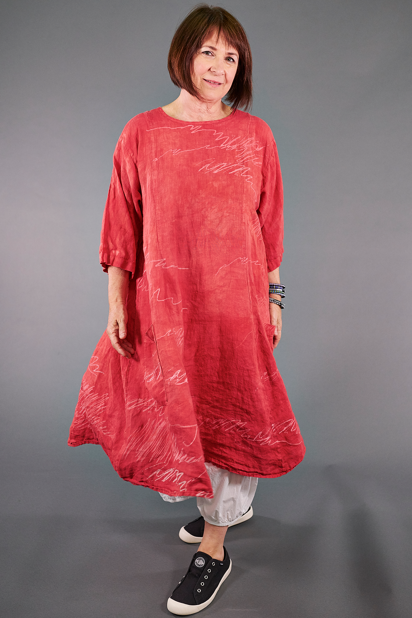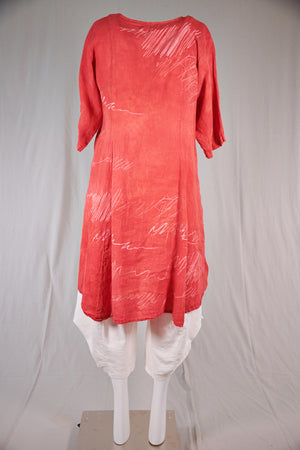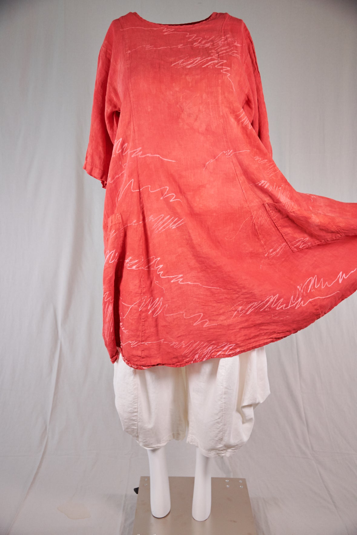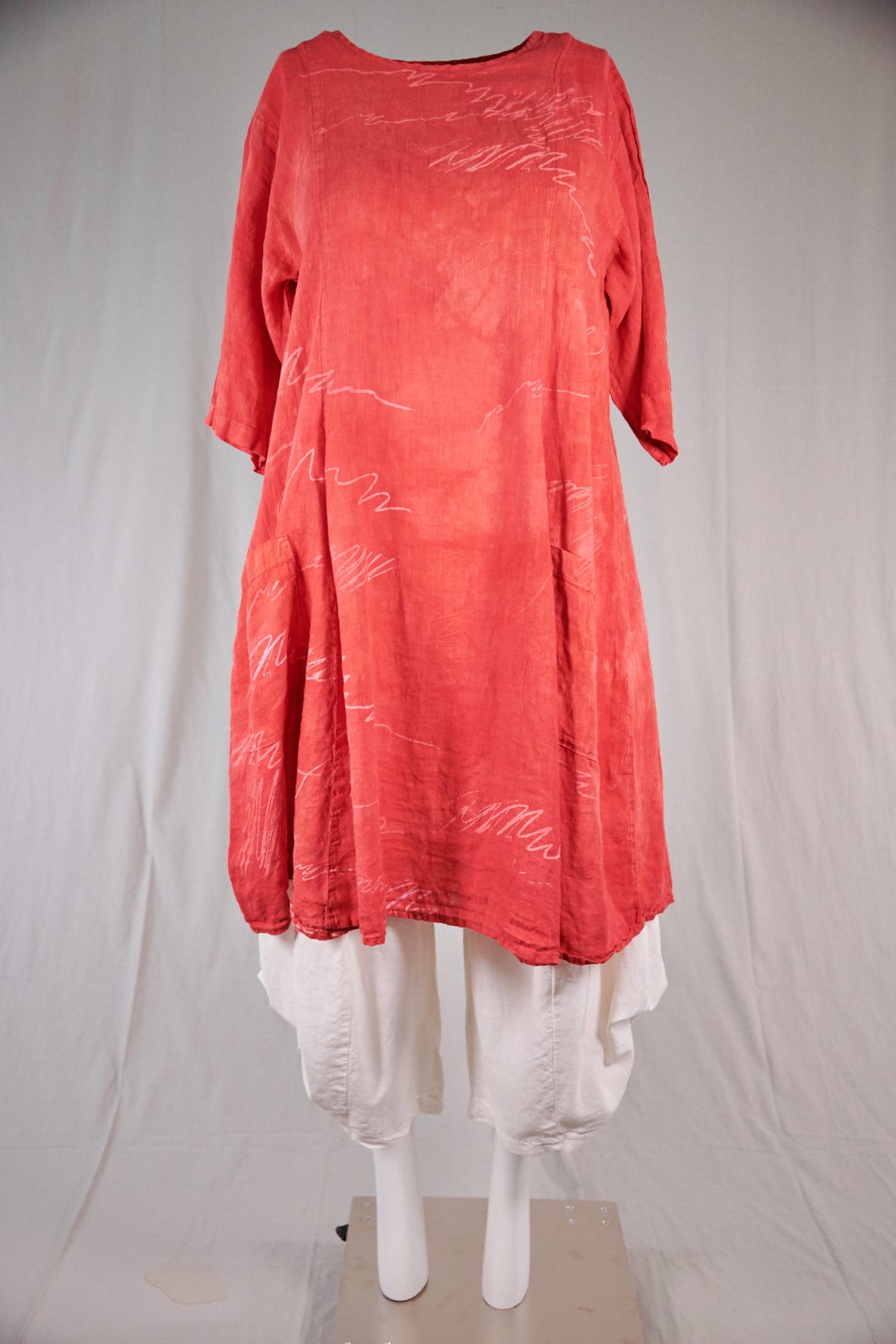A flattering dress for those with curves. Jen's son, Sam, hand dyed these with shades of brilliant coral. Our artists complimented this gentle variation with a subtle, abstract print on the front & back (zoom to see).