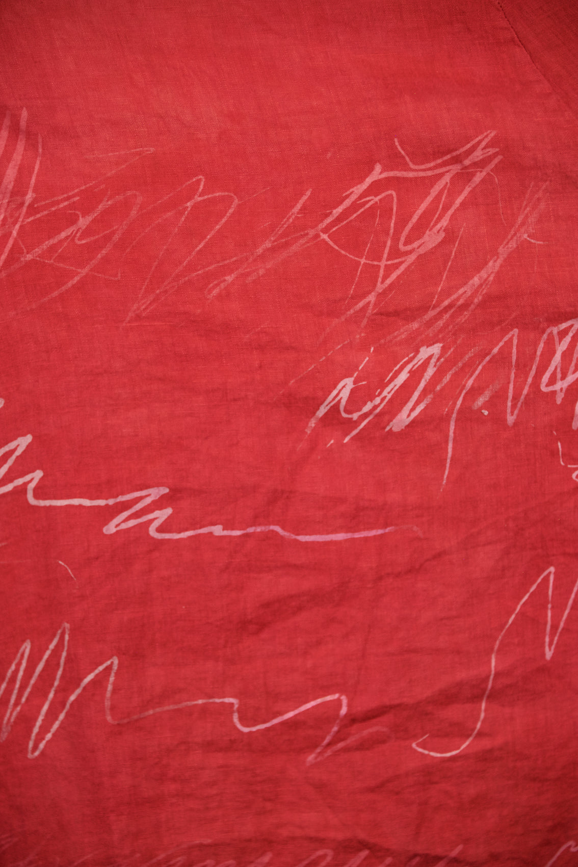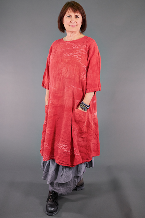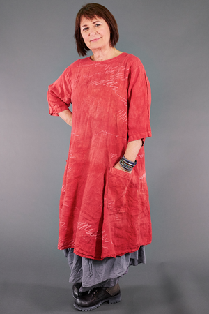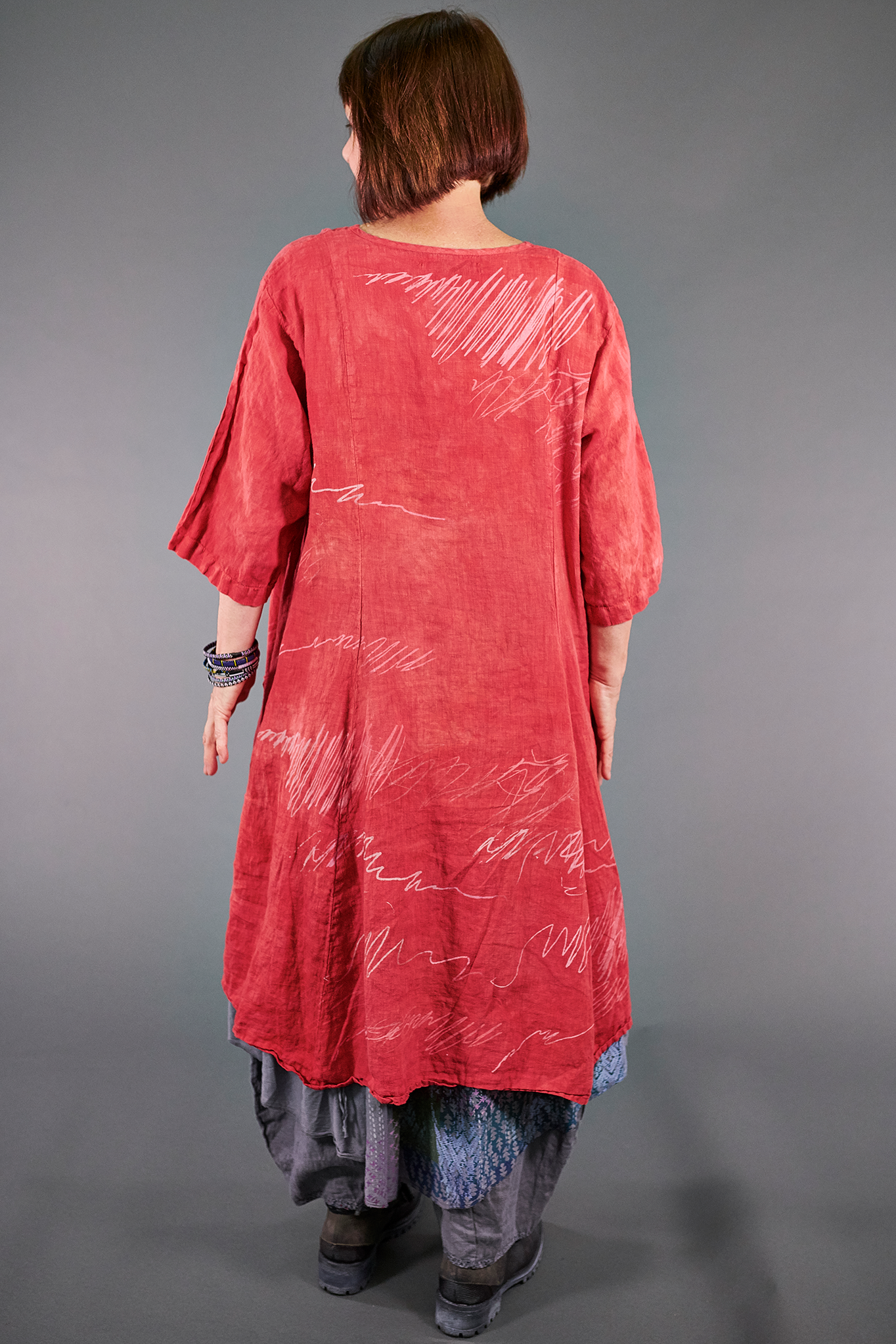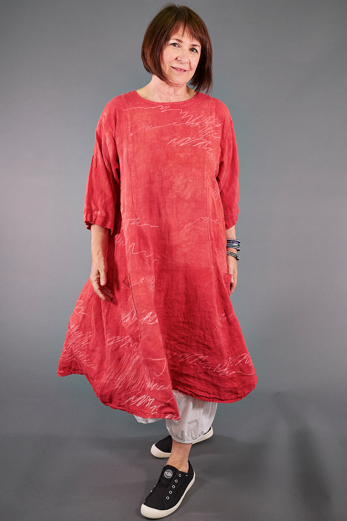 A flattering dress for those with curves. Jen's son, Sam, hand dyed these with shades of brilliant coral. Our artists complimented this gentle variation with a subtle, abstract print on the front & back (zoom to see).