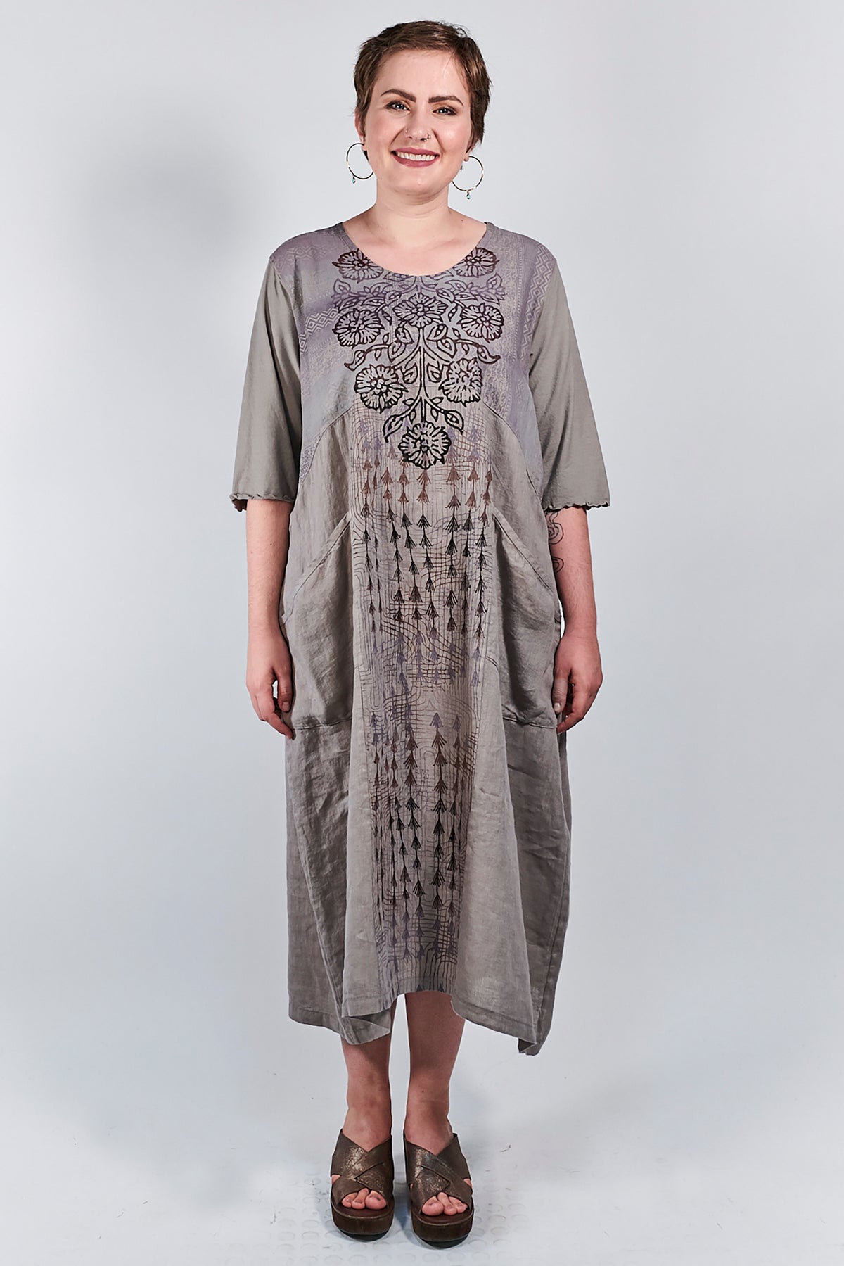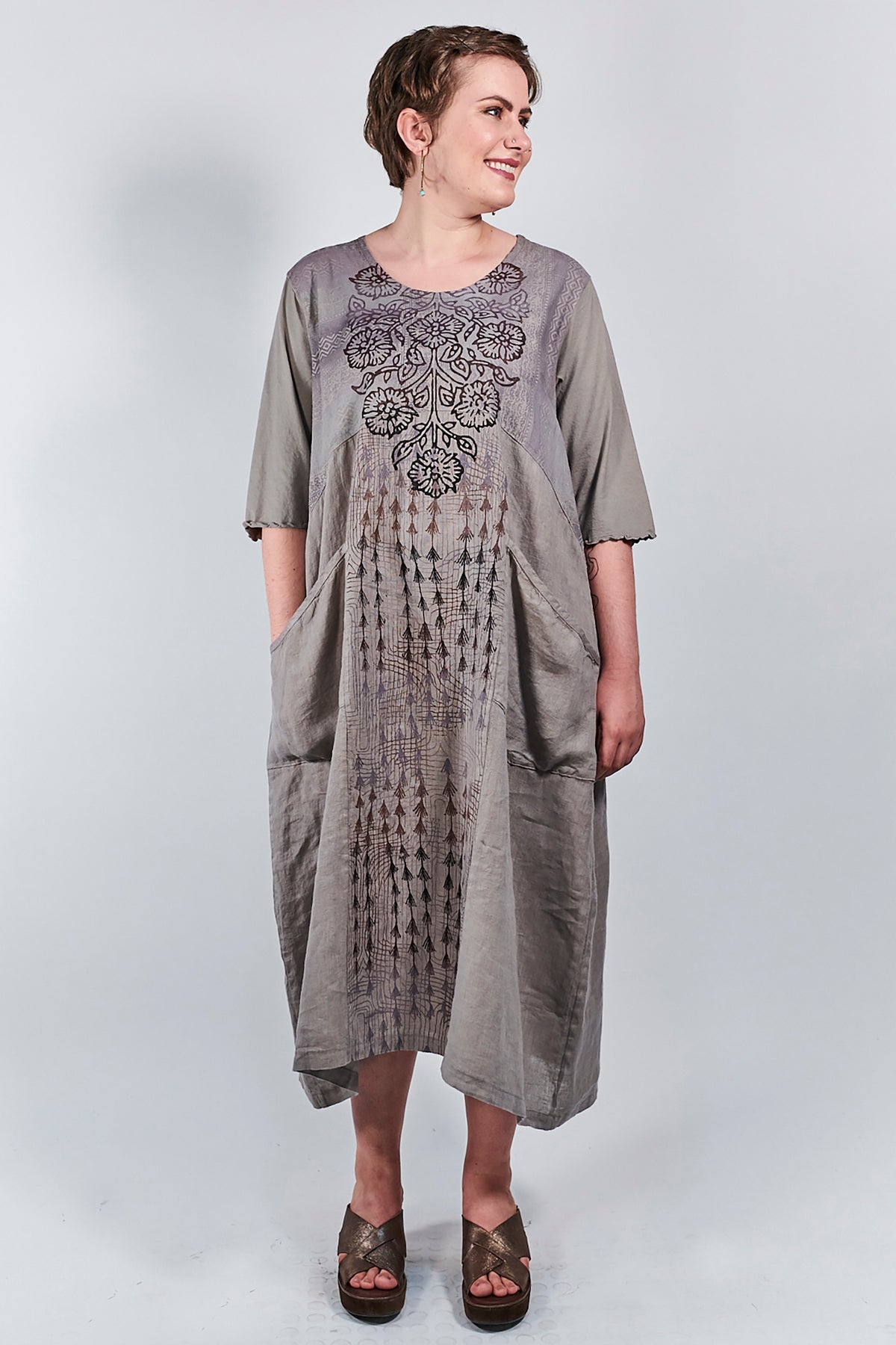 We love this elegant linen dress, timeless in its simplicity. Patch pockets add functionality, while the gently belled shape is perfectly flattering for every body. The inspired hand printed designs are .... Just beautiful!