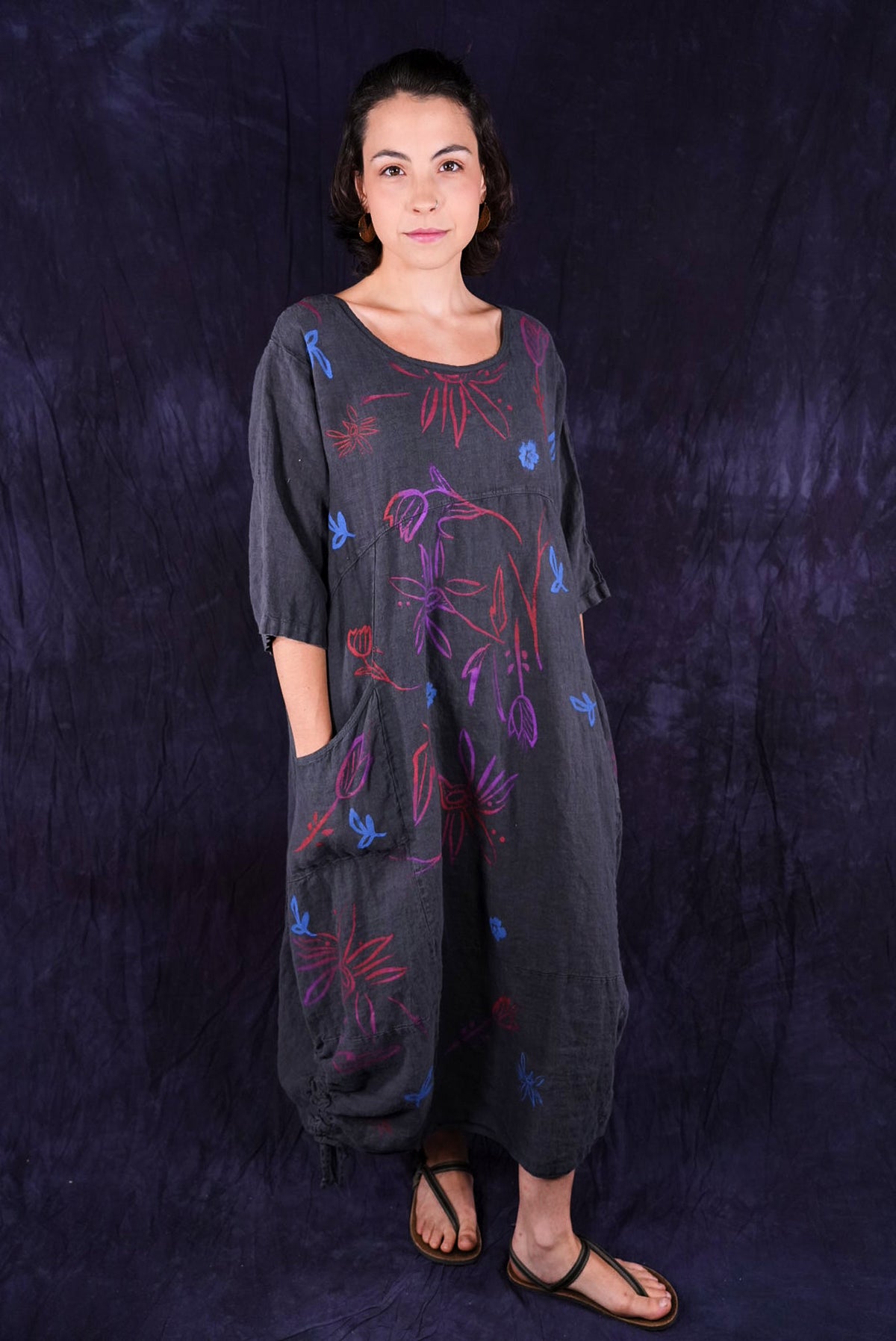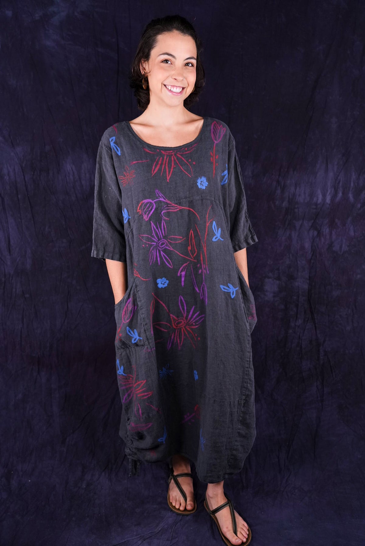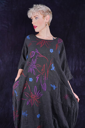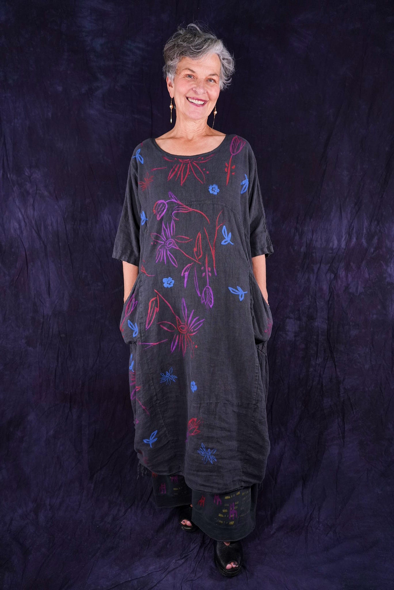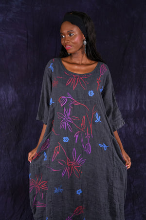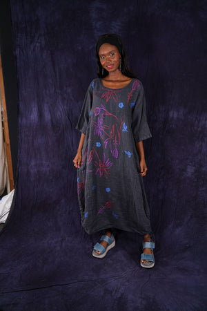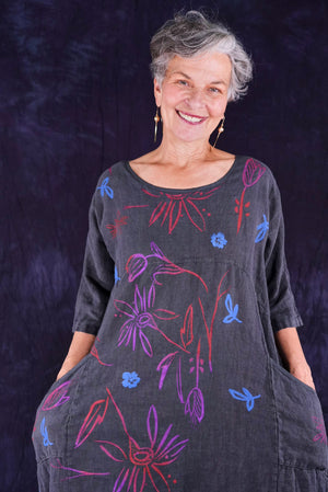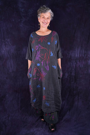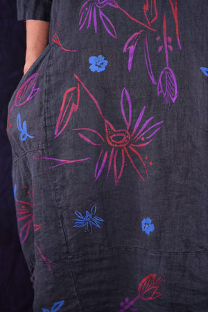 ONLY ONE MADE The last of the beautiful Blue Fish linen dresses... Perfect 50" length... The favorite spring/summer dress. Throw it on alone or layer over pants or skirts. Dress it up or down, and travel with it. The most versatile piece. Generous pockets and beautiful printing allover the front!