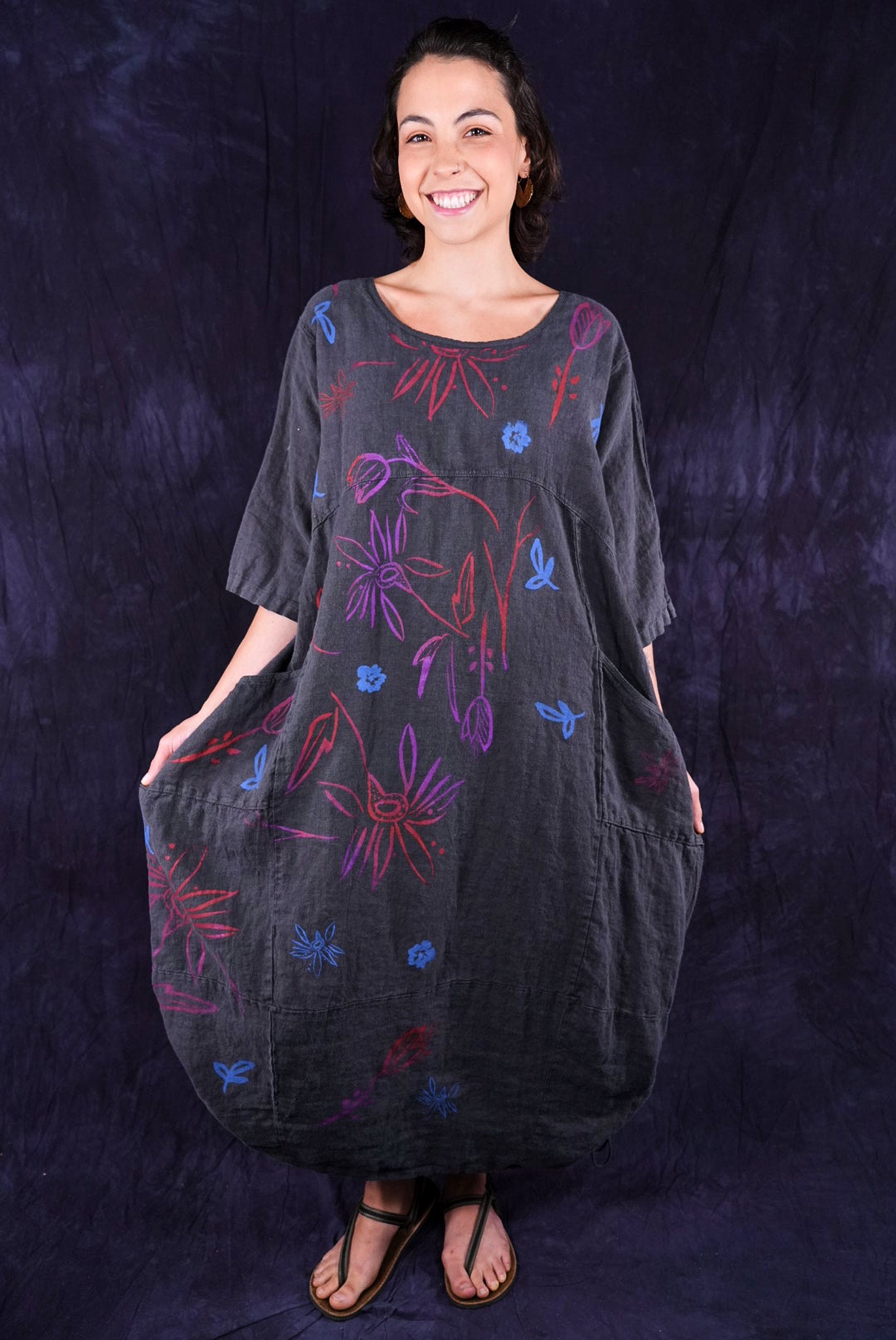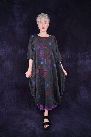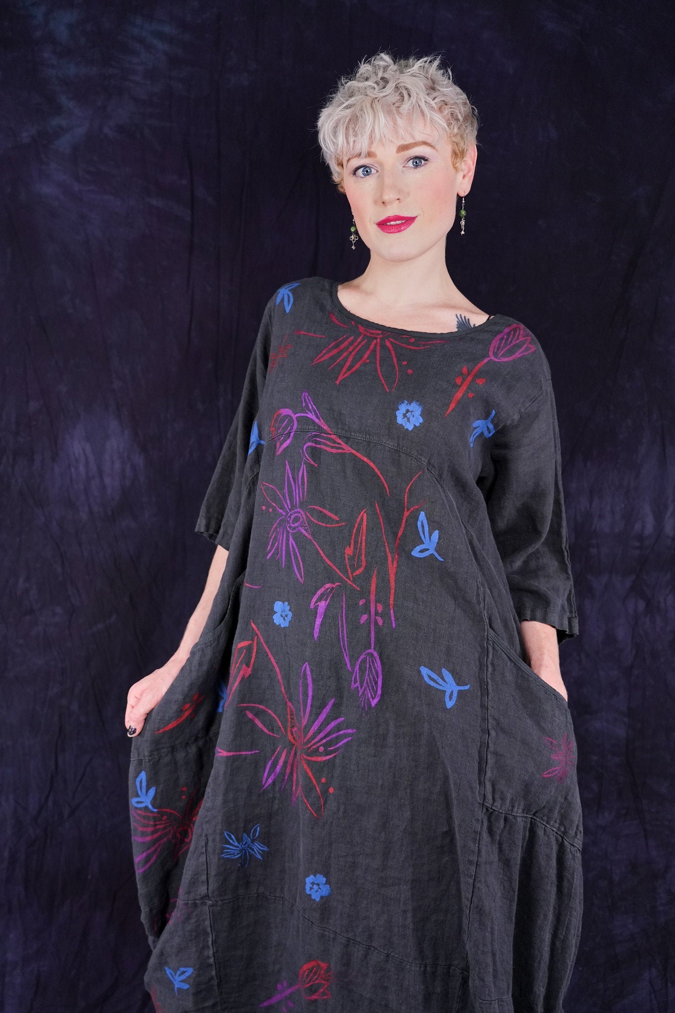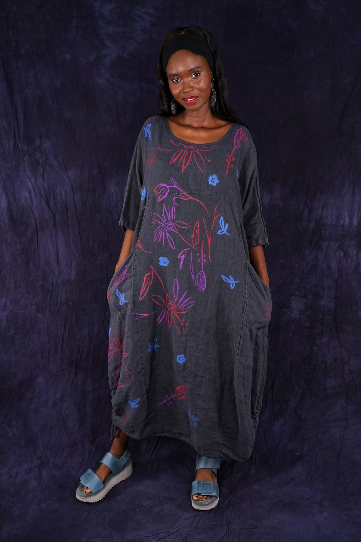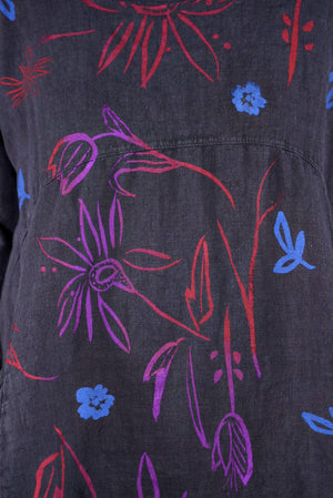 ONLY ONE MADE The last of the beautiful Blue Fish linen dresses... Perfect 50" length... The favorite spring/summer dress. Throw it on alone or layer over pants or skirts. Dress it up or down, and travel with it. The most versatile piece. Generous pockets and beautiful printing allover the front!