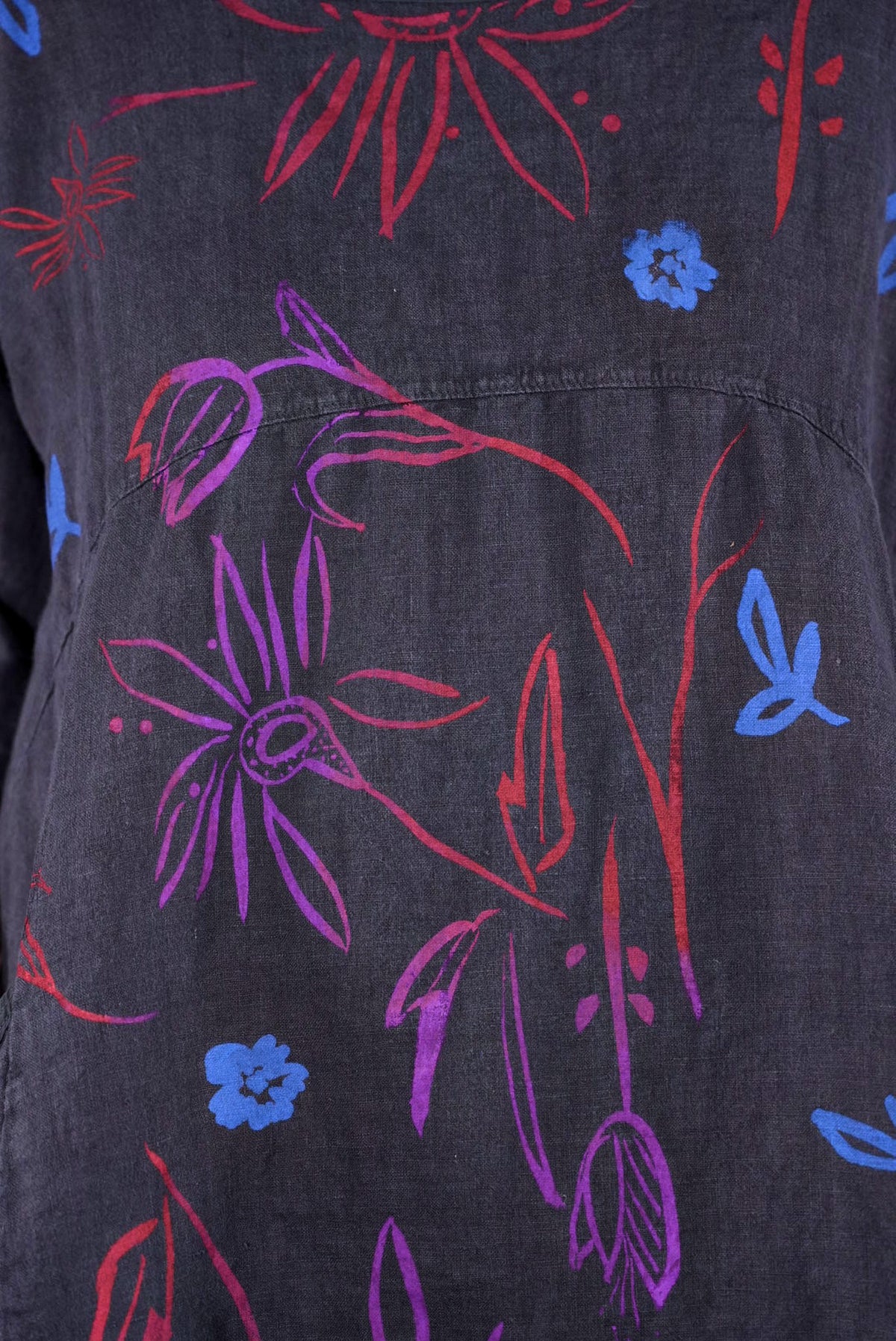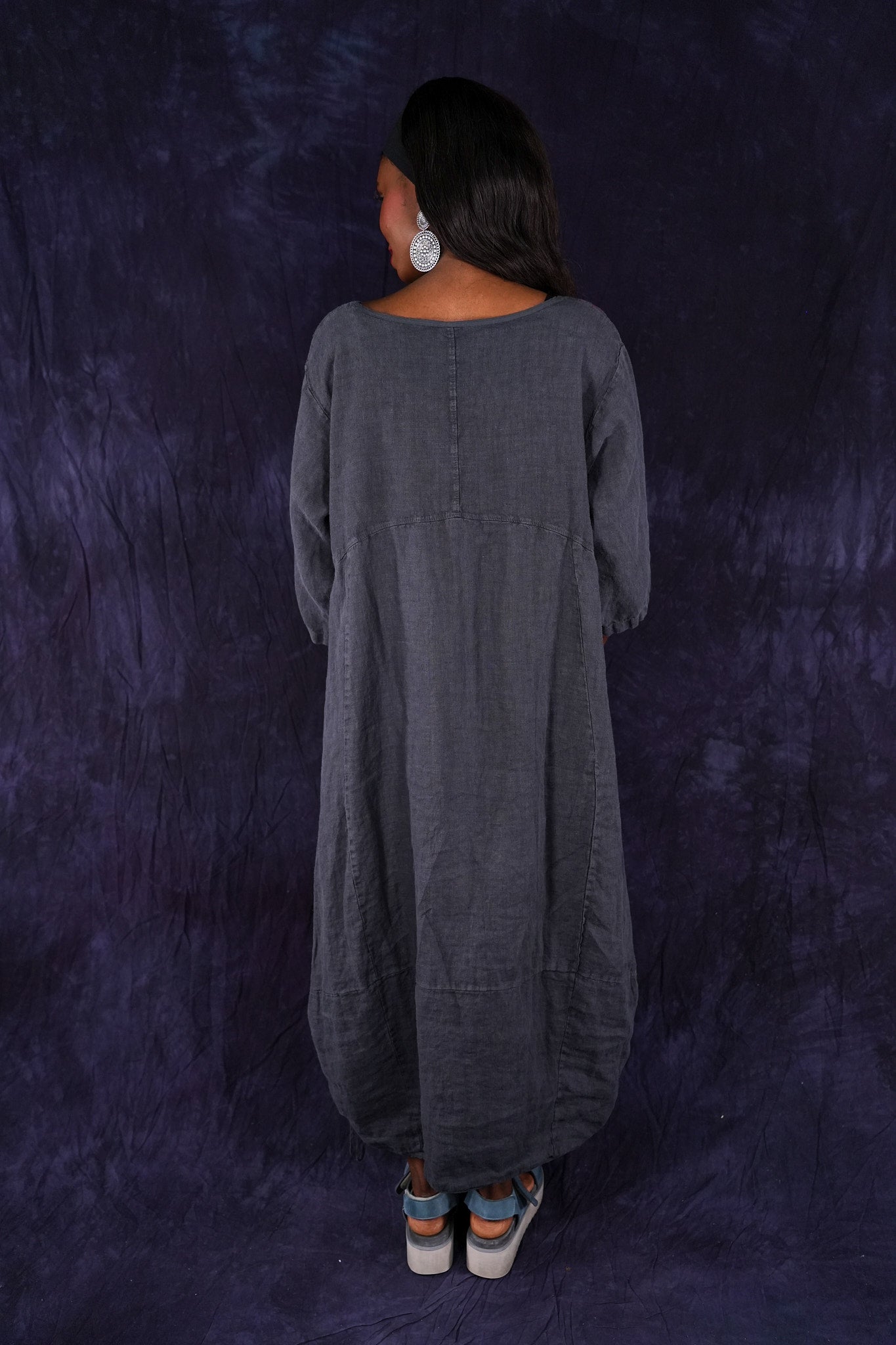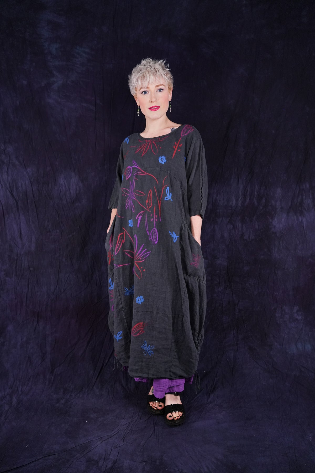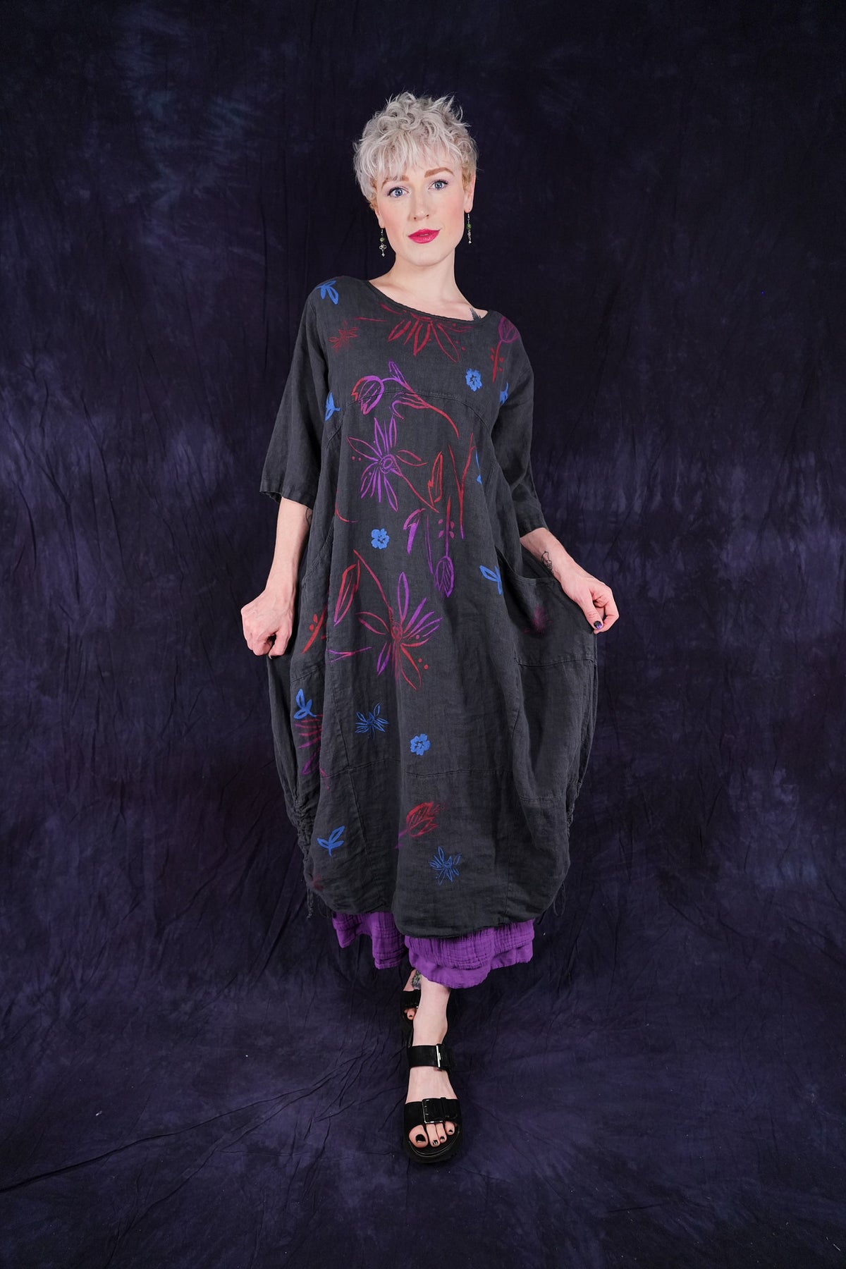ONLY ONE MADE The last of the beautiful Blue Fish linen dresses... Perfect 50" length... The favorite spring/summer dress. Throw it on alone or layer over pants or skirts. Dress it up or down, and travel with it. The most versatile piece. Generous pockets and beautiful printing allover the front!
