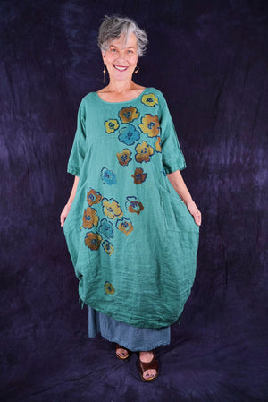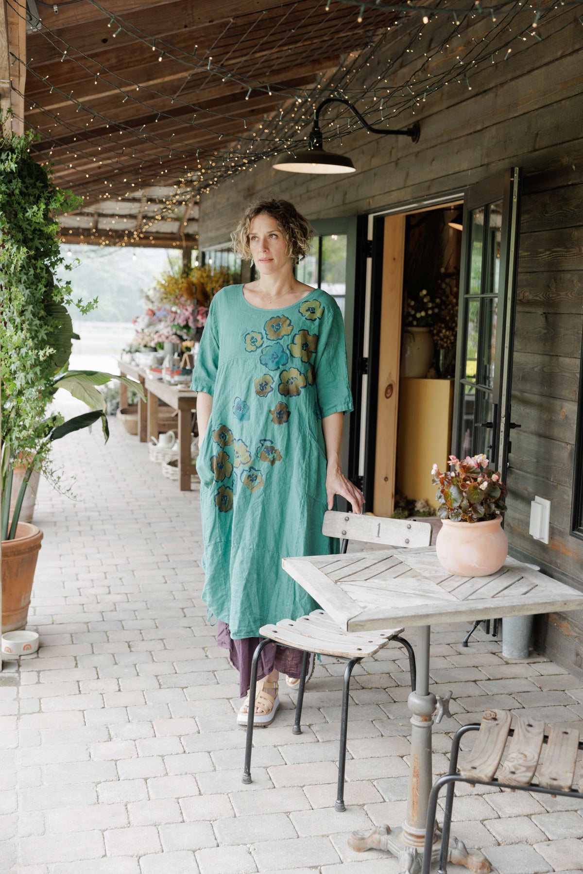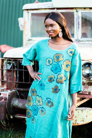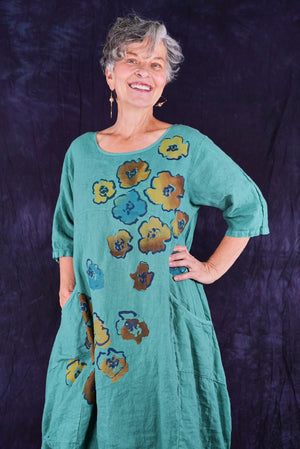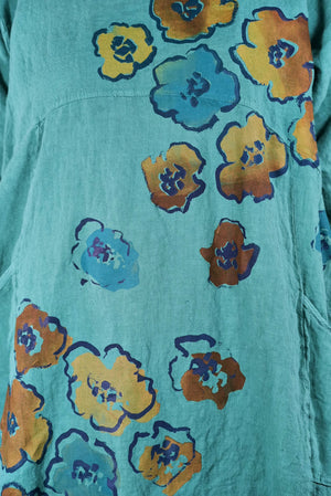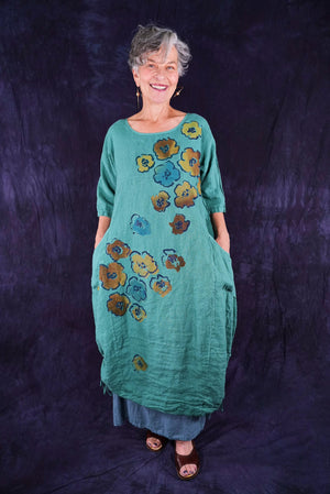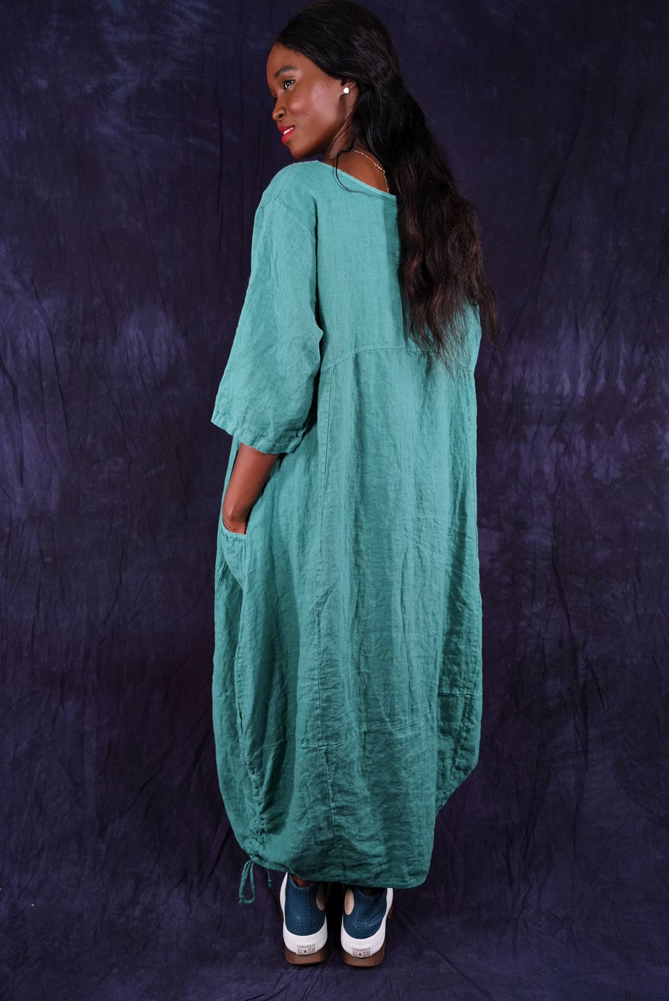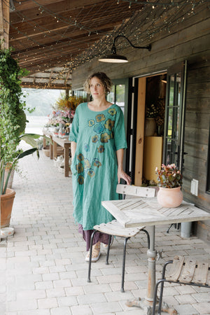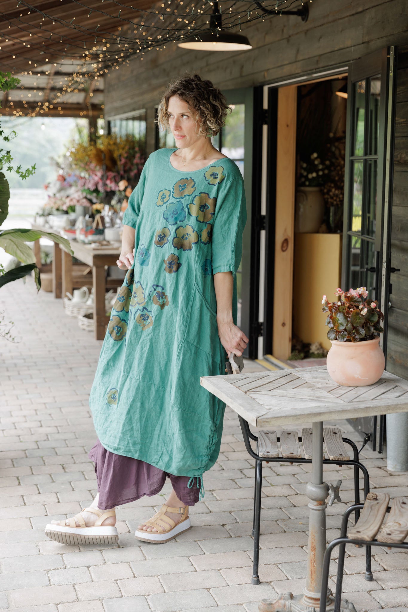 LAST ONE Color is Jade, a rich, saturated, greener turquoise tone, indoor shoots are closest. The last of the beautiful Blue Fish linen dresses... Perfect 50" length...Drawcords on the lower sides for shaping...a belled, flattering shape. The favorite spring/summer dress. Throw it on alone or layer over pants or skirts. Dress it up or down, and travel with it. The most versatile piece. Generous pockets and beautiful printing allover the front!