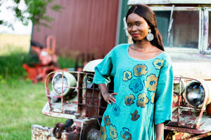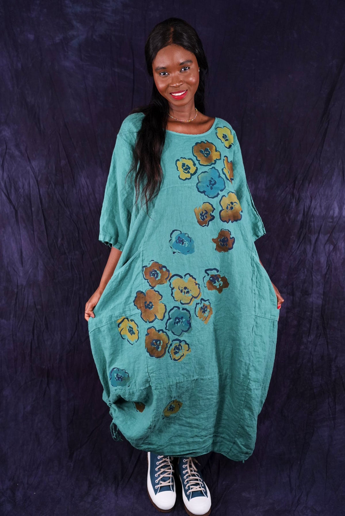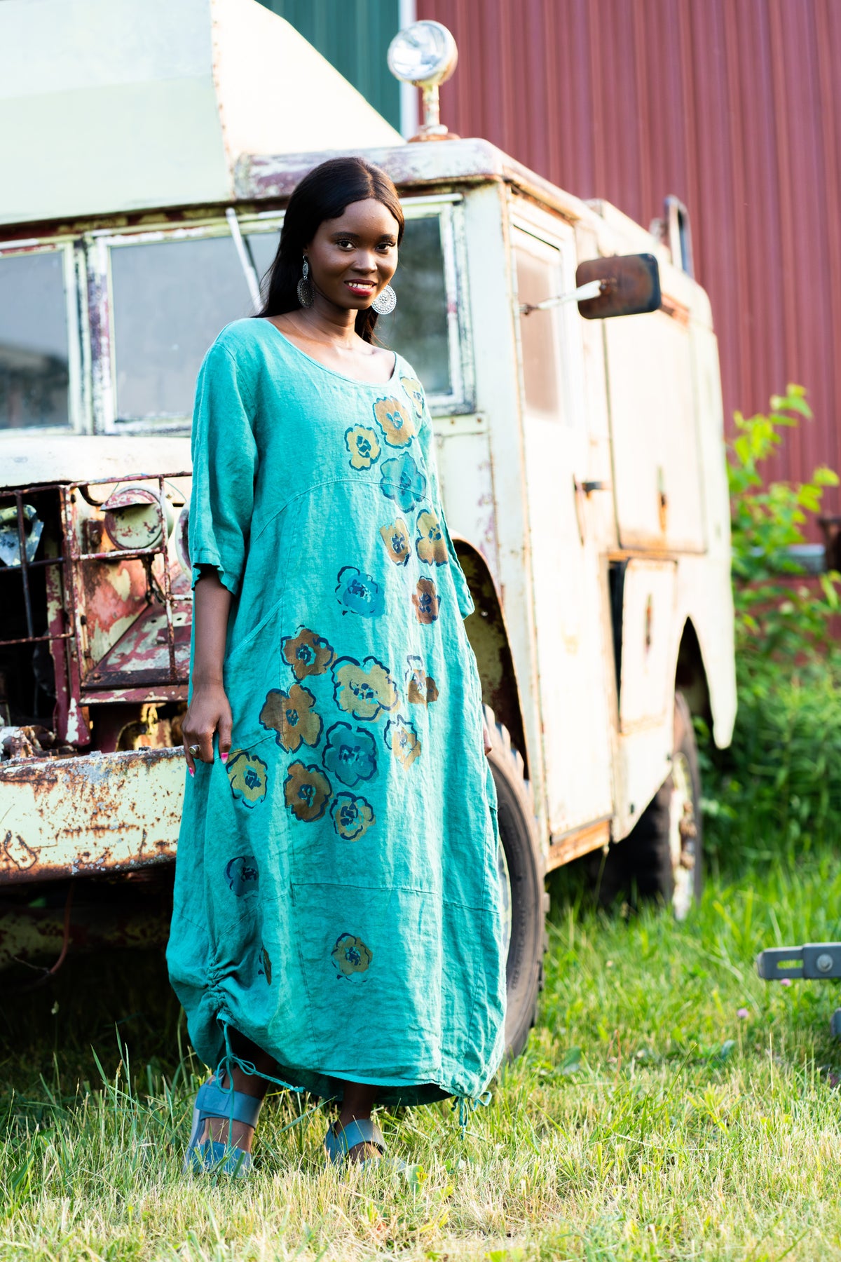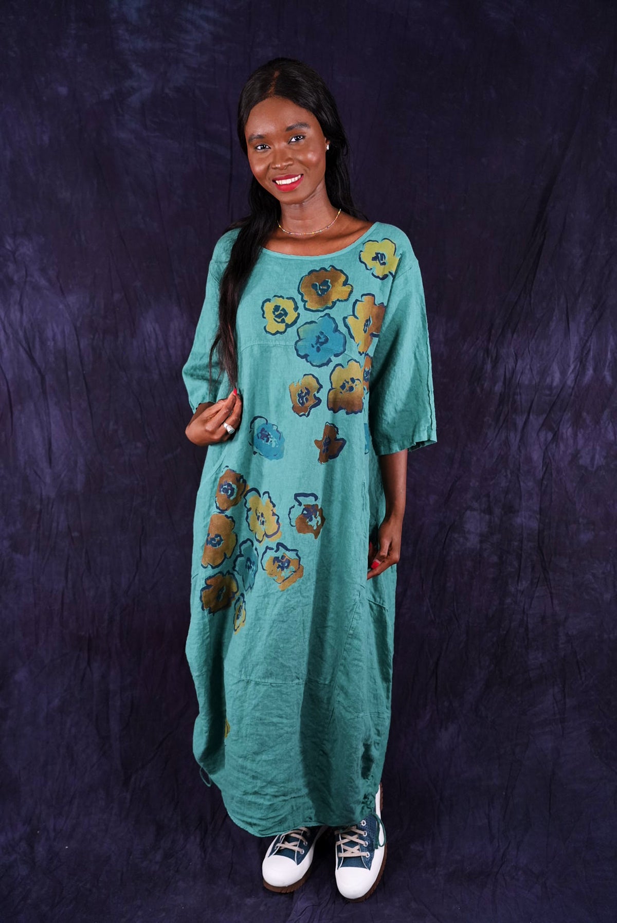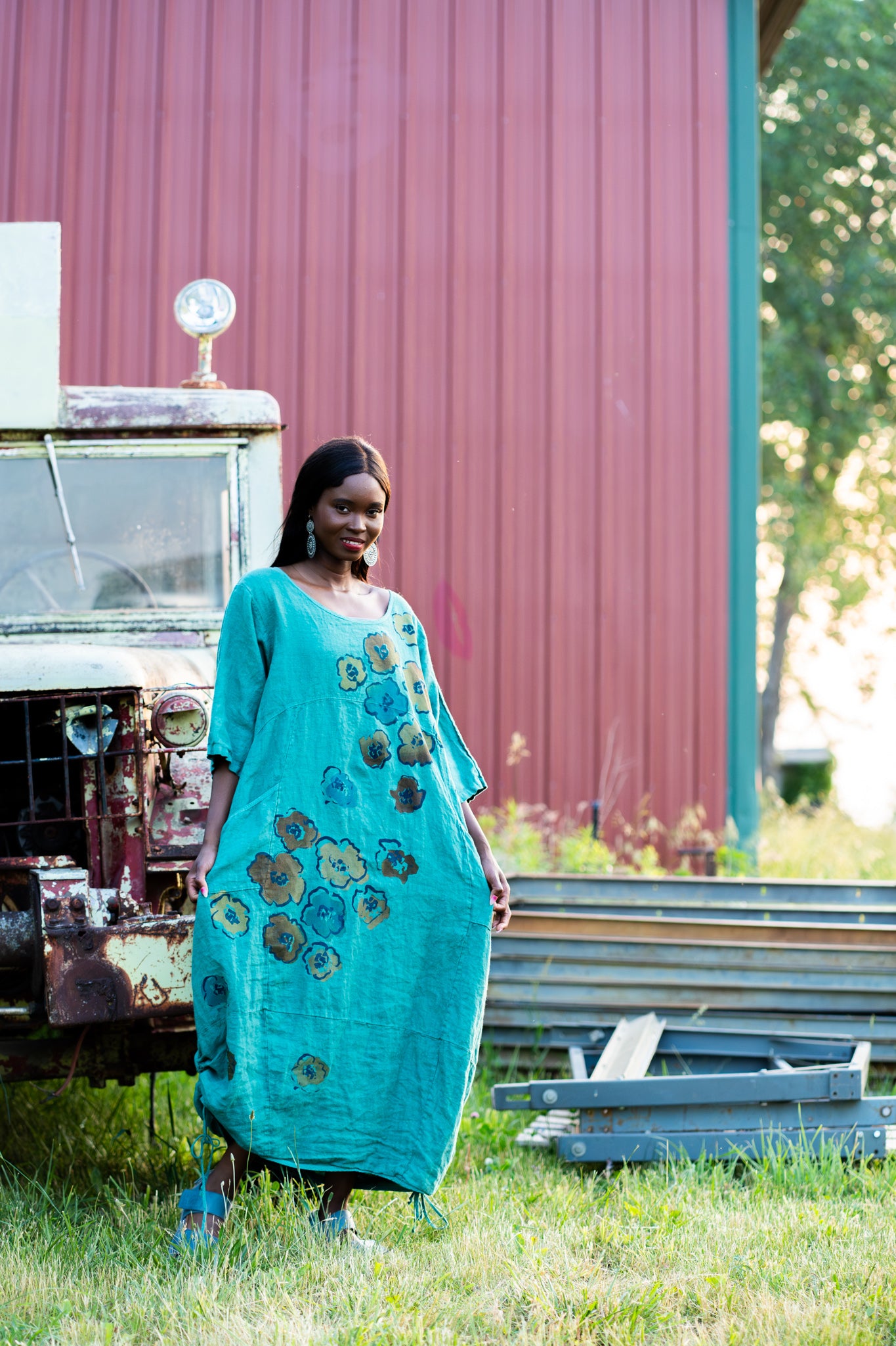 LAST ONE Color is Jade, a rich, saturated, greener turquoise tone, indoor shoots are closest. The last of the beautiful Blue Fish linen dresses... Perfect 50" length...Drawcords on the lower sides for shaping...a belled, flattering shape. The favorite spring/summer dress. Throw it on alone or layer over pants or skirts. Dress it up or down, and travel with it. The most versatile piece. Generous pockets and beautiful printing allover the front!