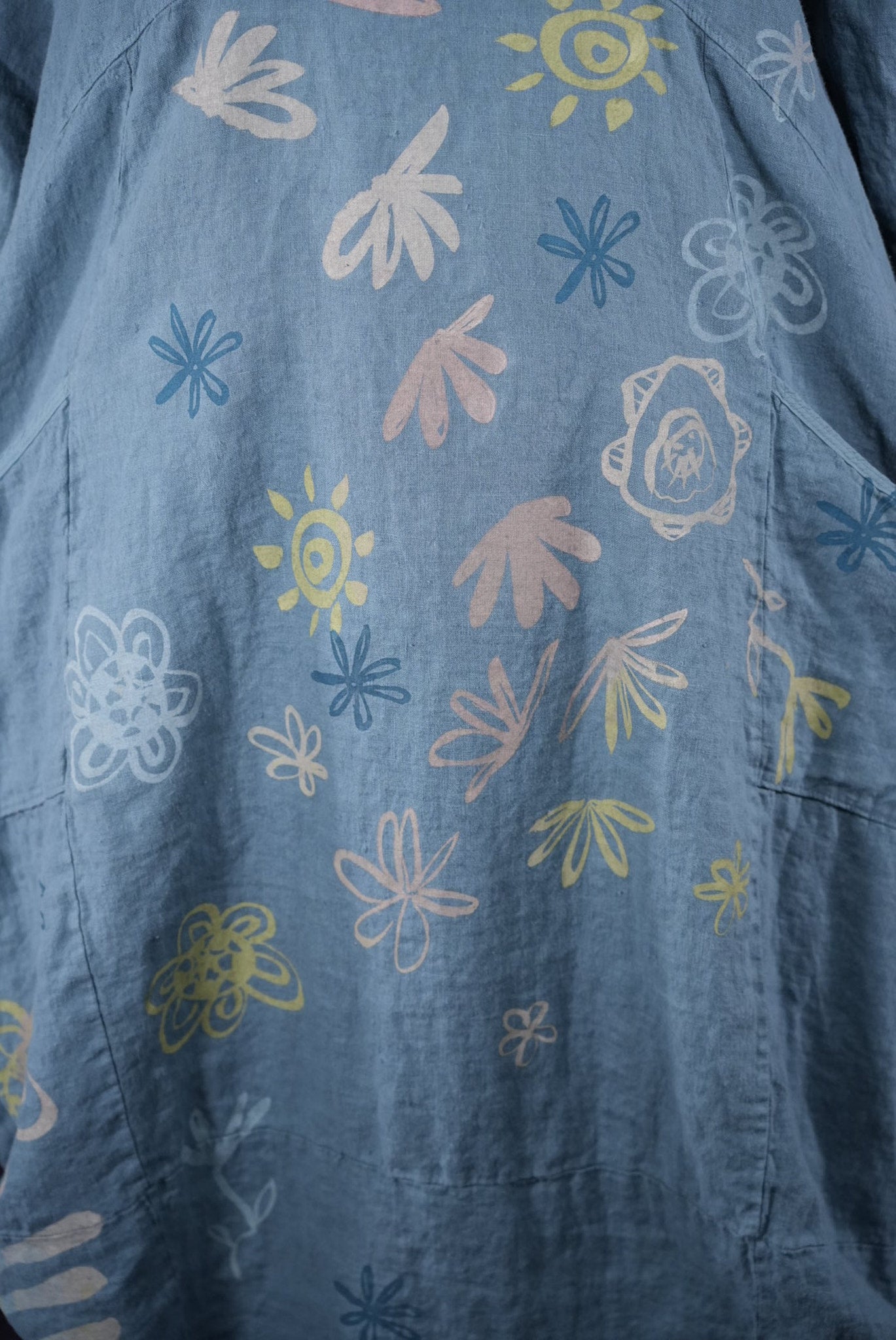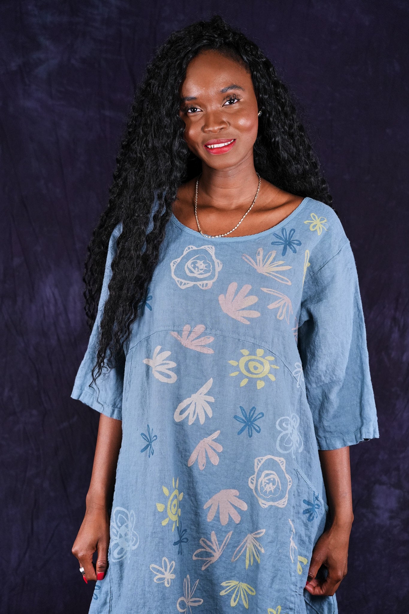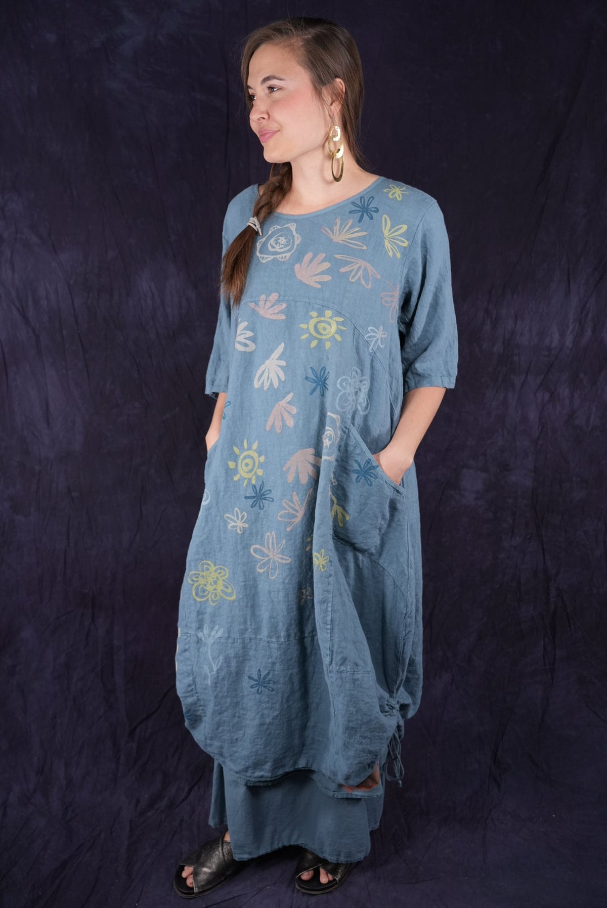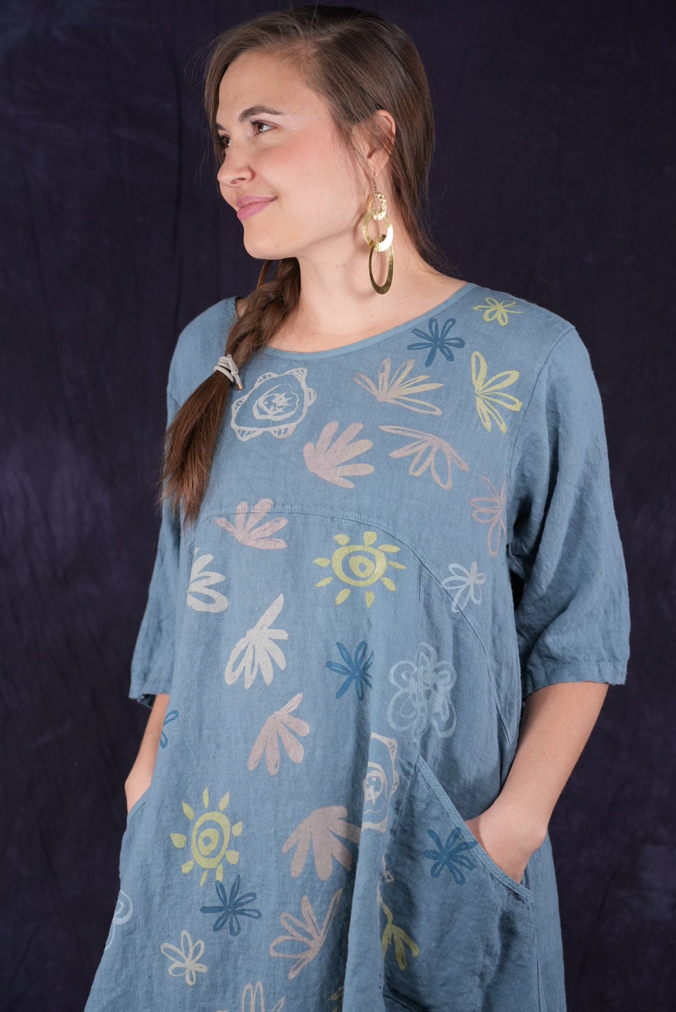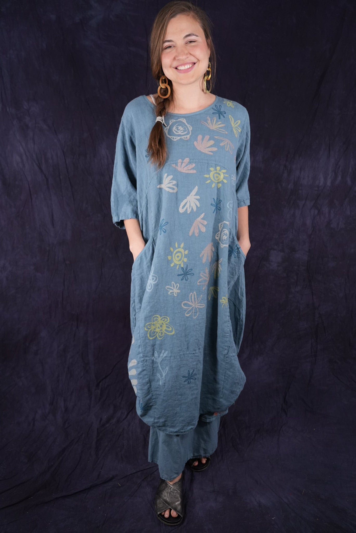 The last of these beautiful Blue Fish dresses in linen... The perfect spring/summer dress. Throw it on alone or layer over pants or skirts. Dress it up or down, and travel with it. The most versatile piece. Generous pockets and beautiful print in many shades allover the front!