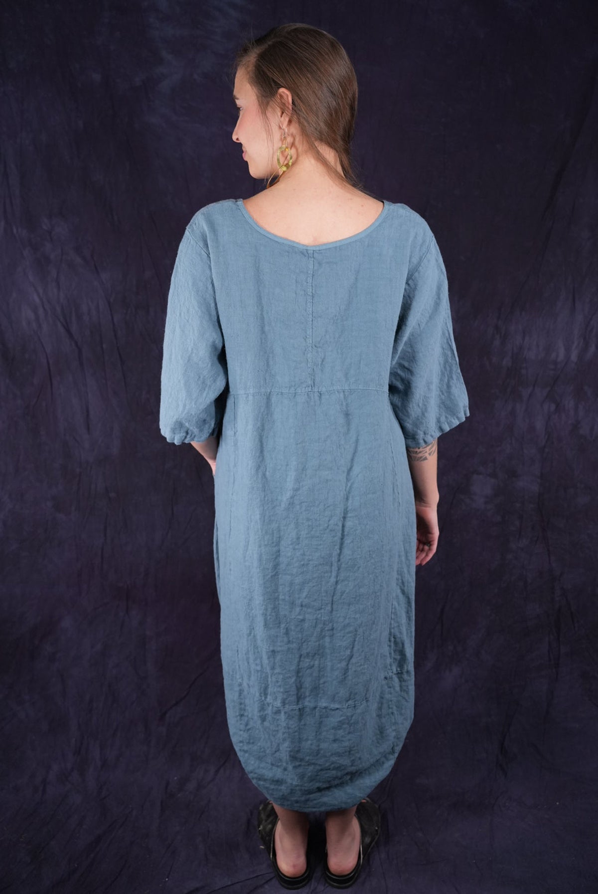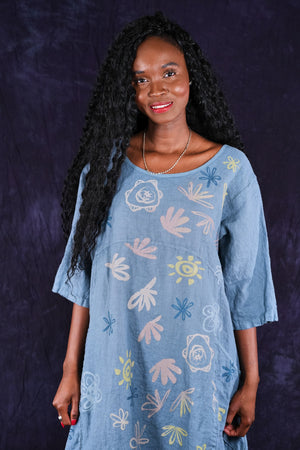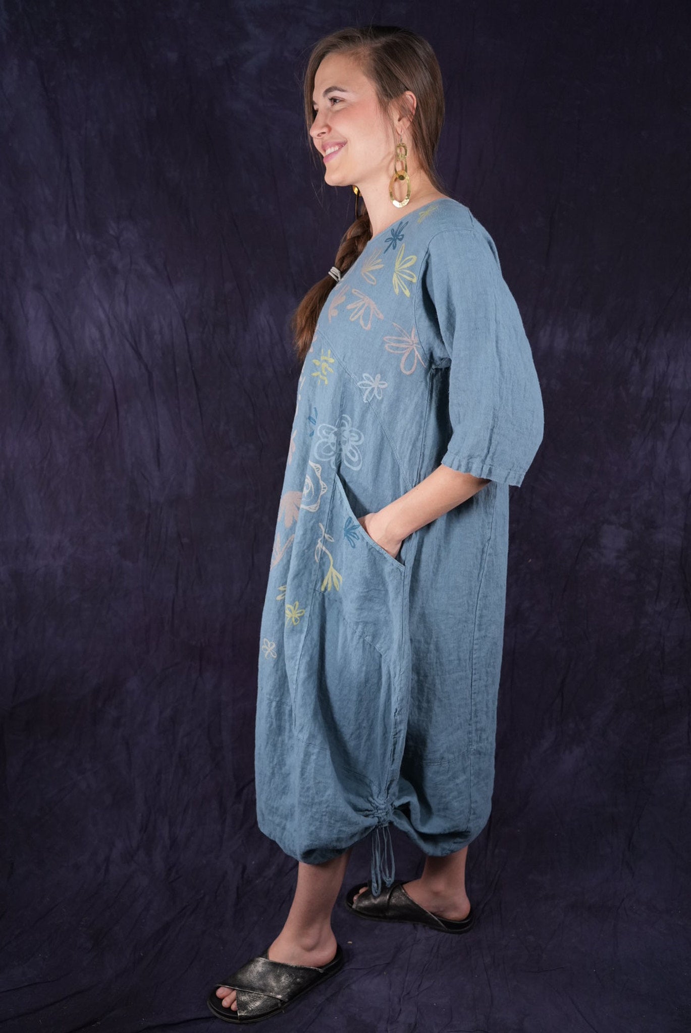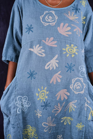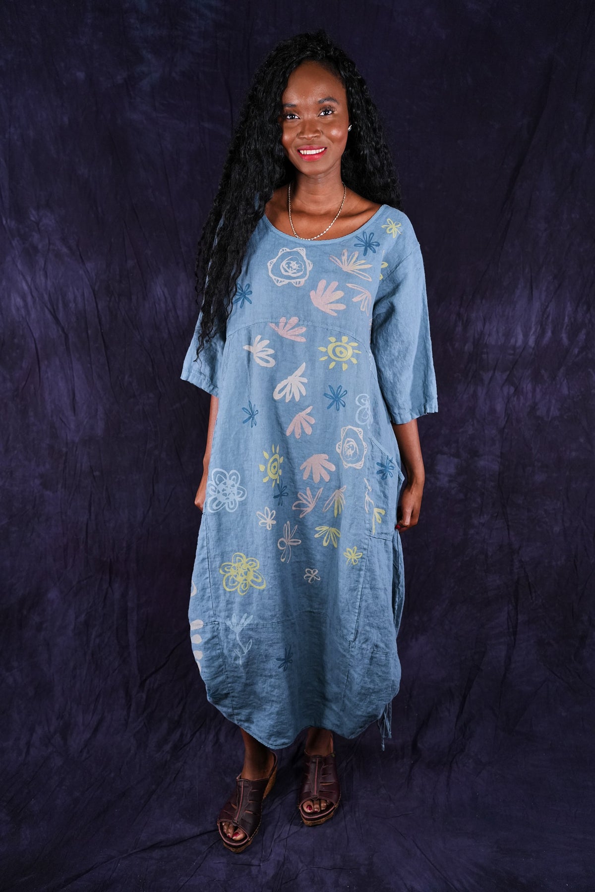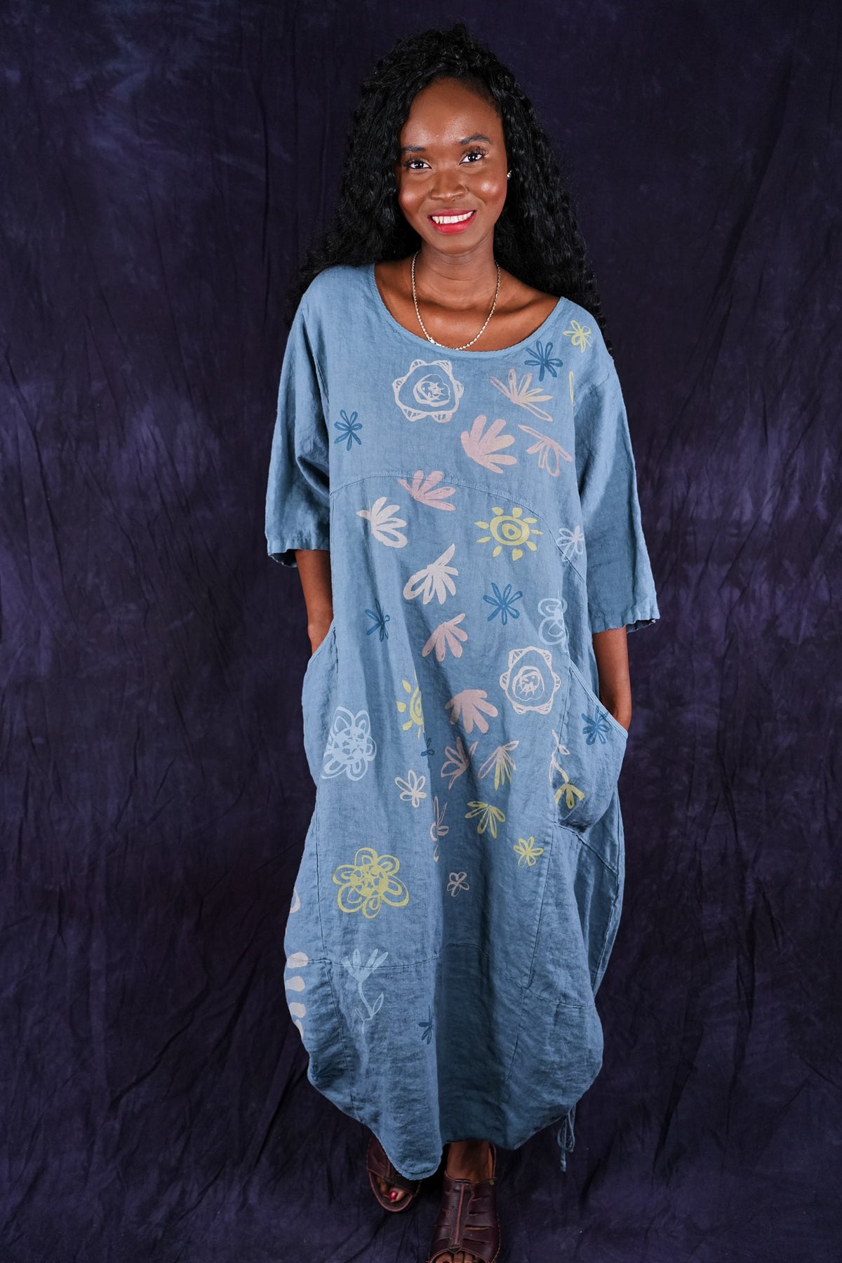 The last of these beautiful Blue Fish dresses in linen... The perfect spring/summer dress. Throw it on alone or layer over pants or skirts. Dress it up or down, and travel with it. The most versatile piece. Generous pockets and beautiful print in many shades allover the front!