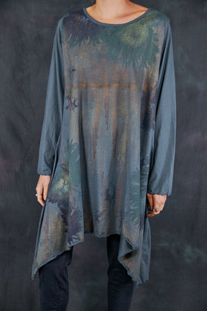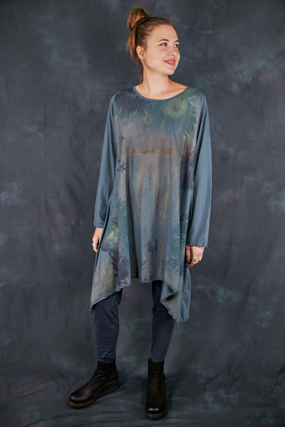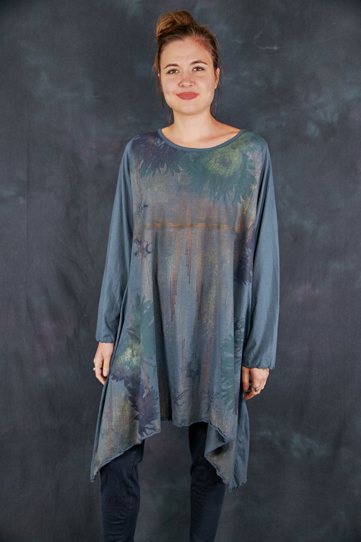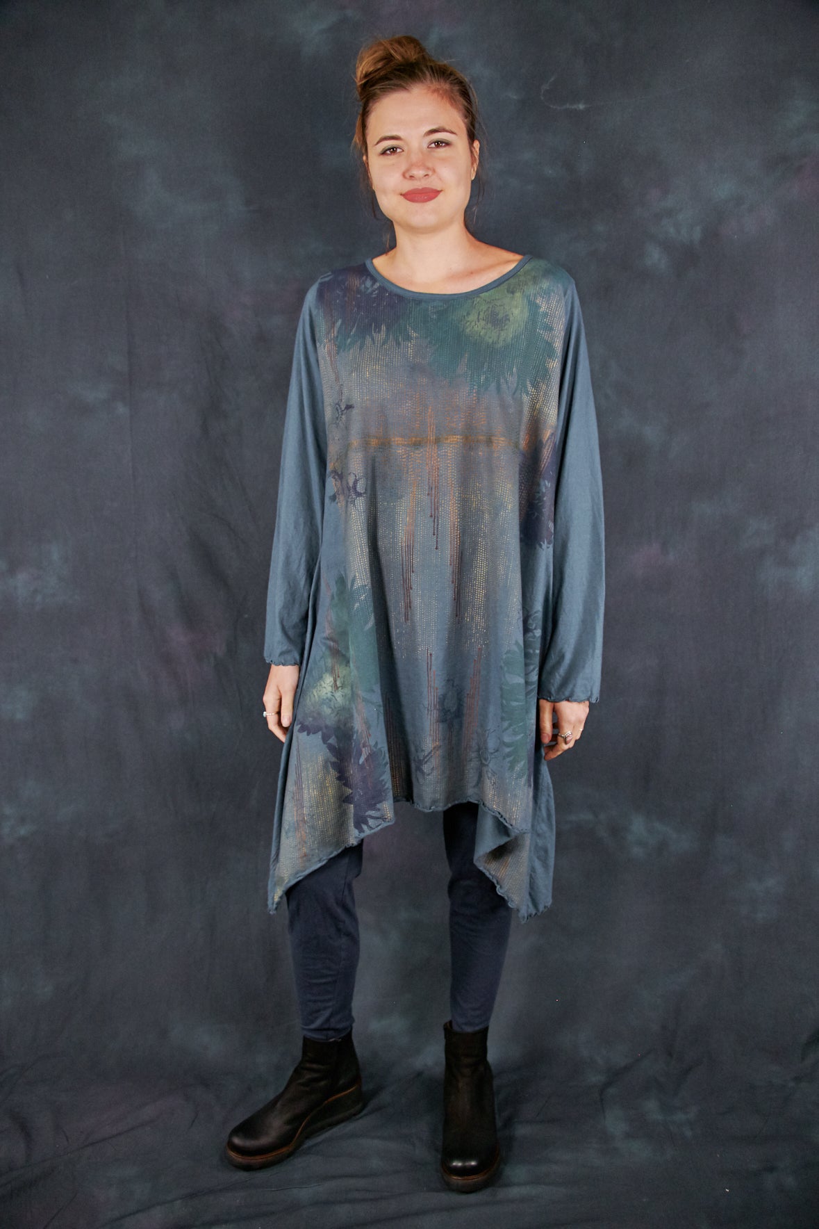 Based on our customer favourite Cafe Tee. We've lengthened this to a tunic/dress length. Center hem hits above the knee while the side points fall a few inches below. A-Line swing shape flatters most body types. Wear with leggings or wide pants. Ruffly lettuce edge sleeves and hem.
