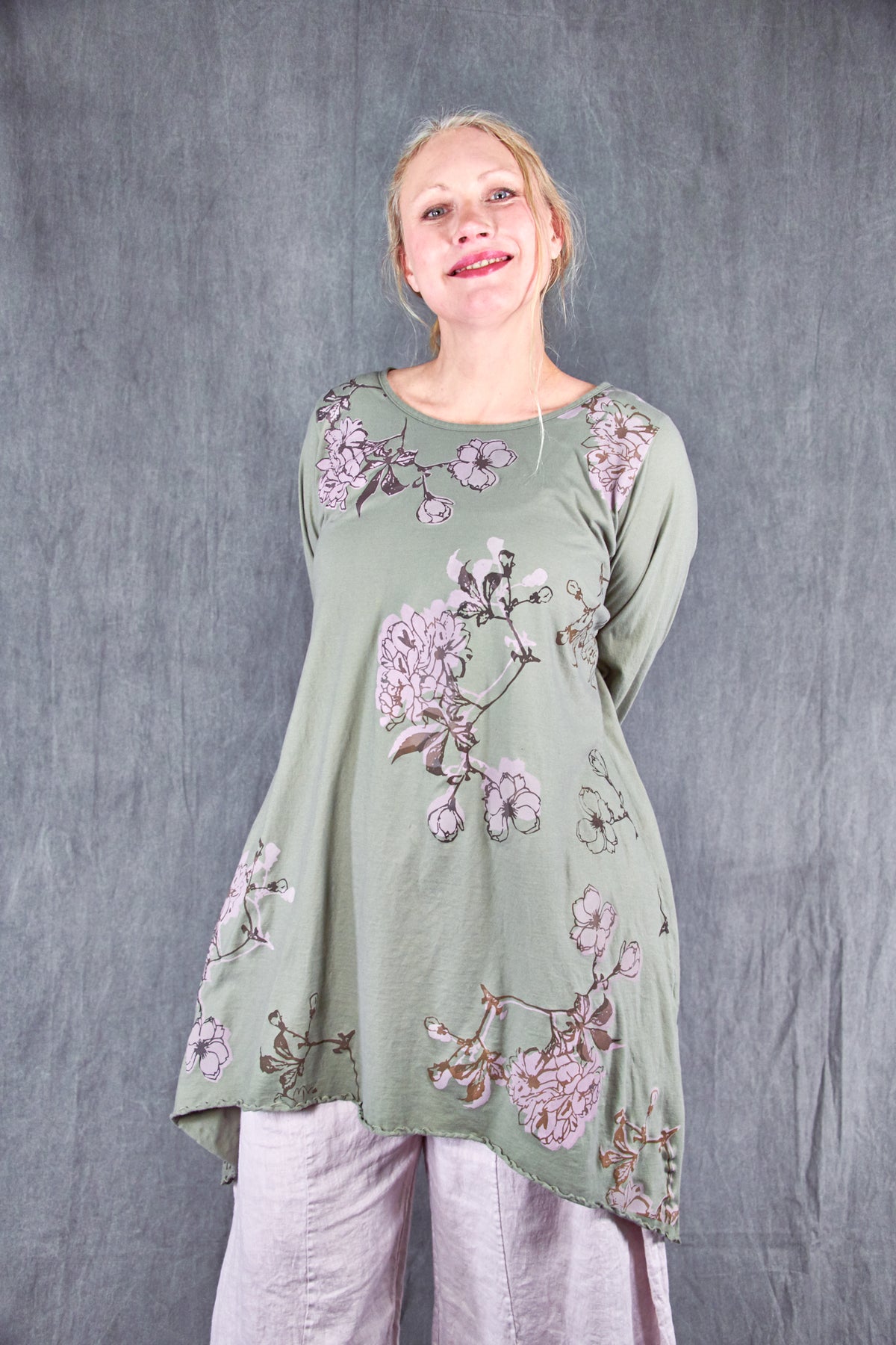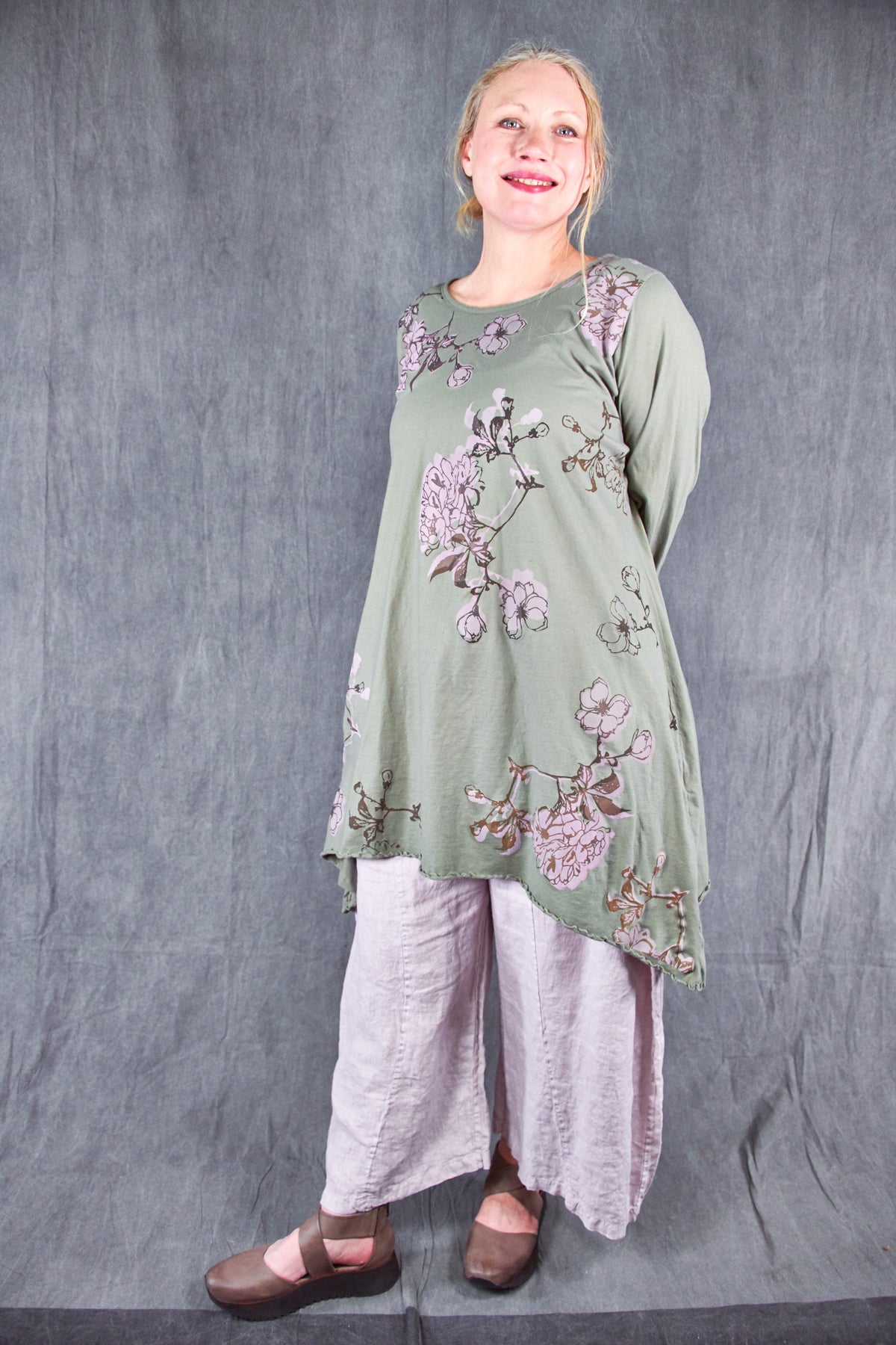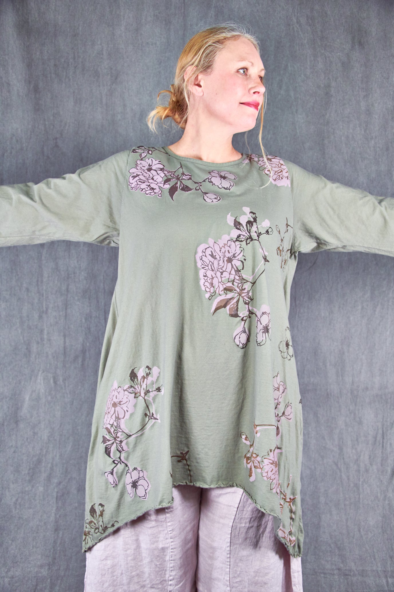 Based on our customer favourite Cafe Tee. We've lengthened this to a tunic/dress length. Center hem hits above the knee while the side points fall a few inches below. A-Line swing shape flatters most body types. Wear with leggings or wide pants. Ruffly lettuce edge sleeves and hem.