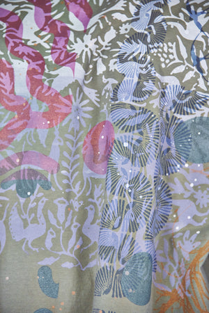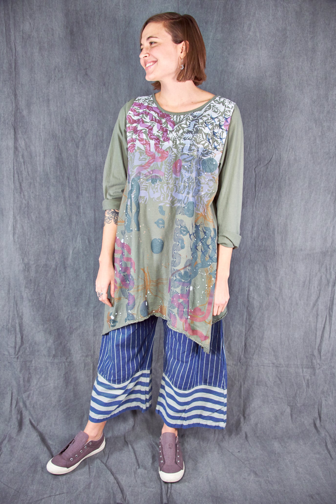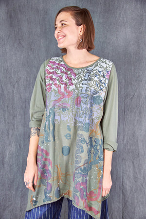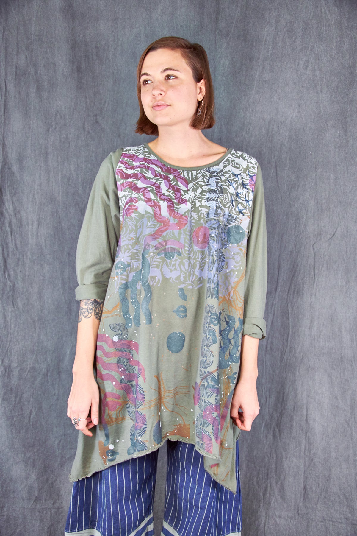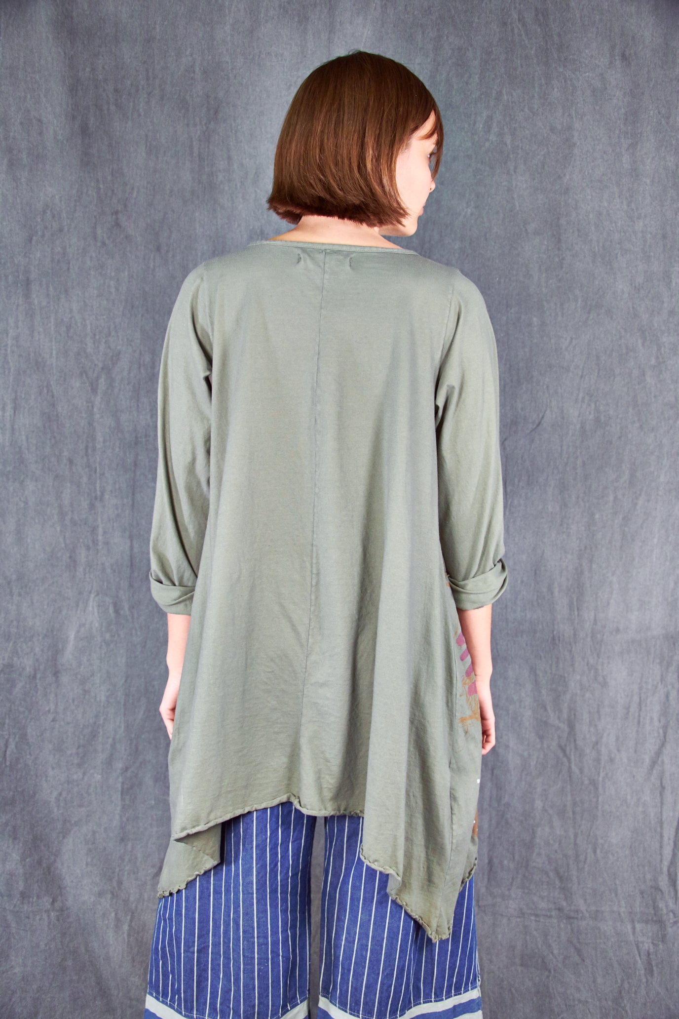 Based on our customer favourite Cafe Tee. We've lengthened this to a tunic/dress length. Center hem hits above the knee while the side points fall a few inches below. A-Line swing shape flatters most body types. Wear with leggings or wide pants. Ruffly lettuce edge sleeves and hem.