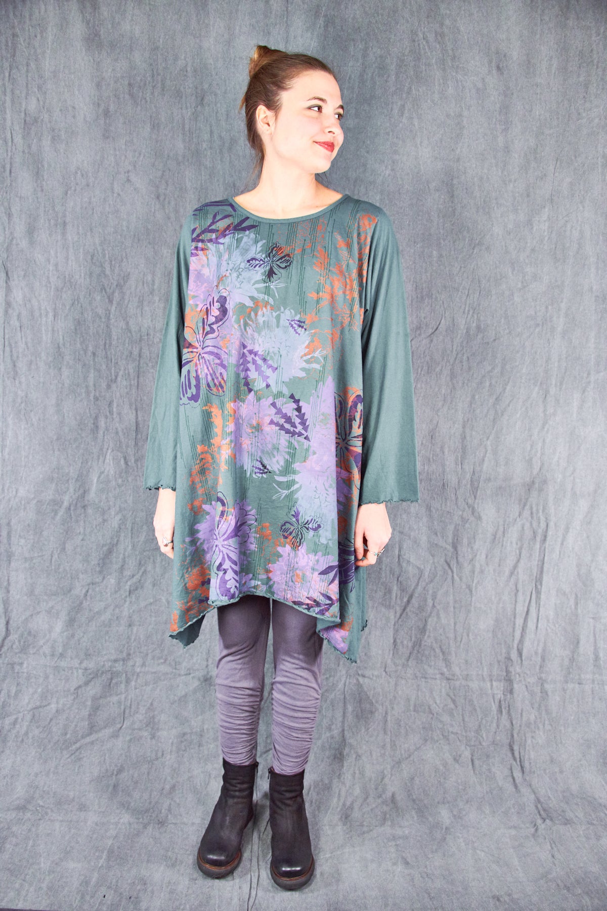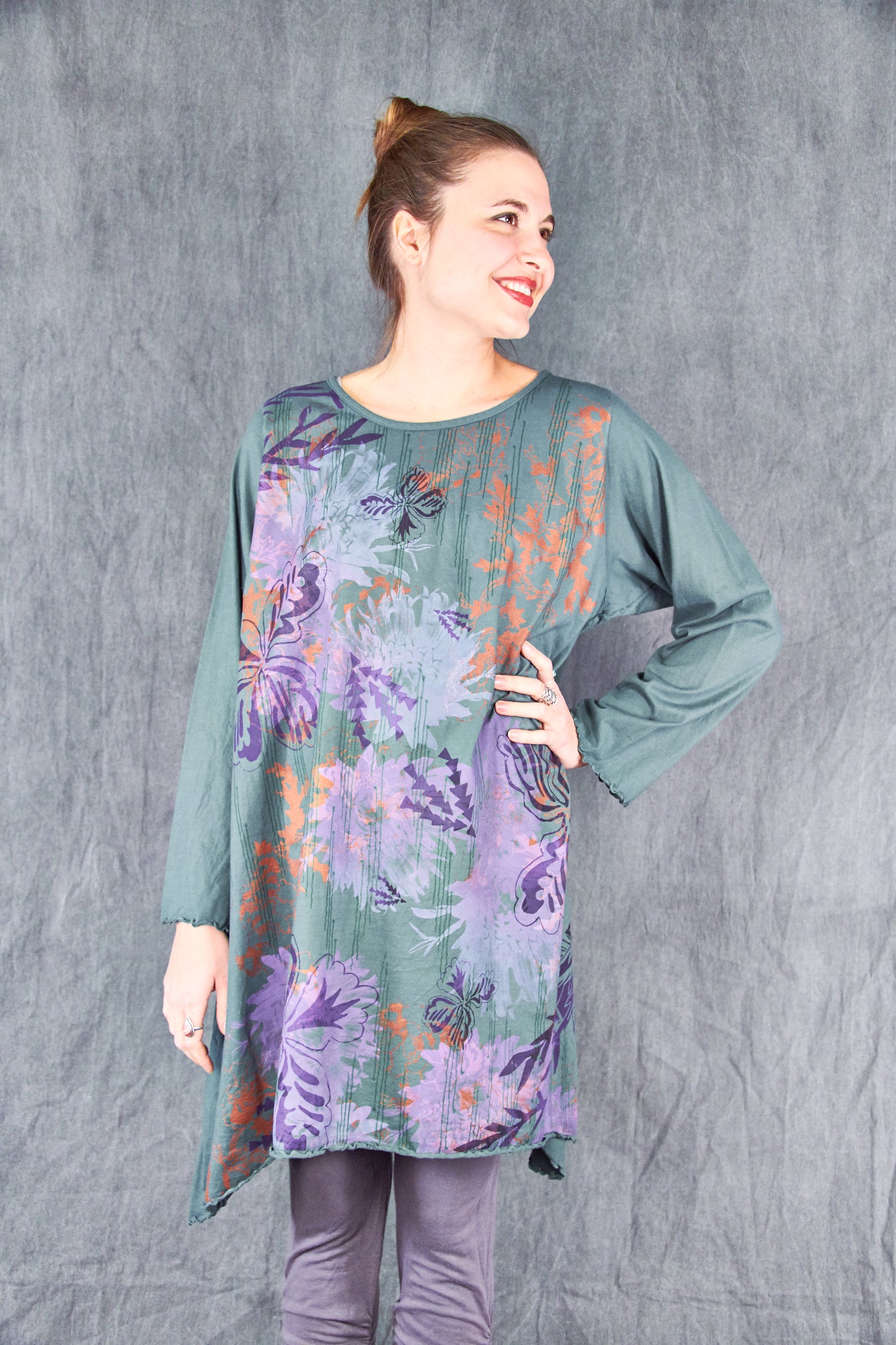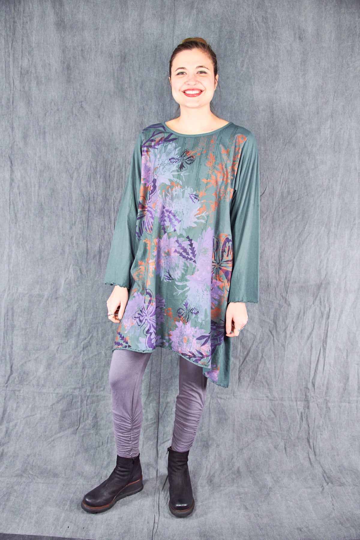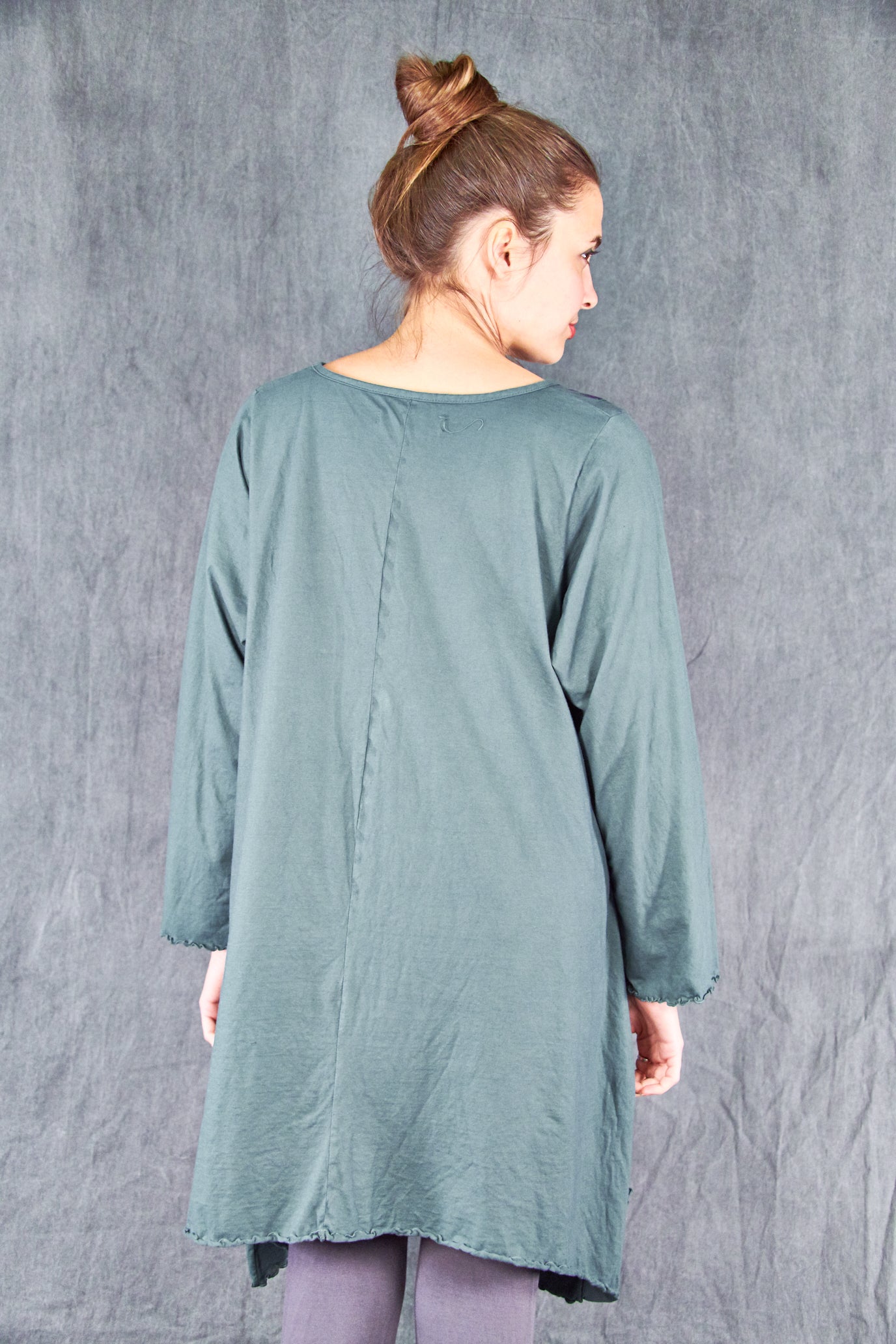 Based on our customer favourite Cafe Tee. We've lengthened this to a tunic/dress length. Center hem hits above the knee while the side points fall a few inches below. A-Line swing shape flatters most body types. Wear with leggings or wide pants. Ruffly lettuce edge sleeves and hem.