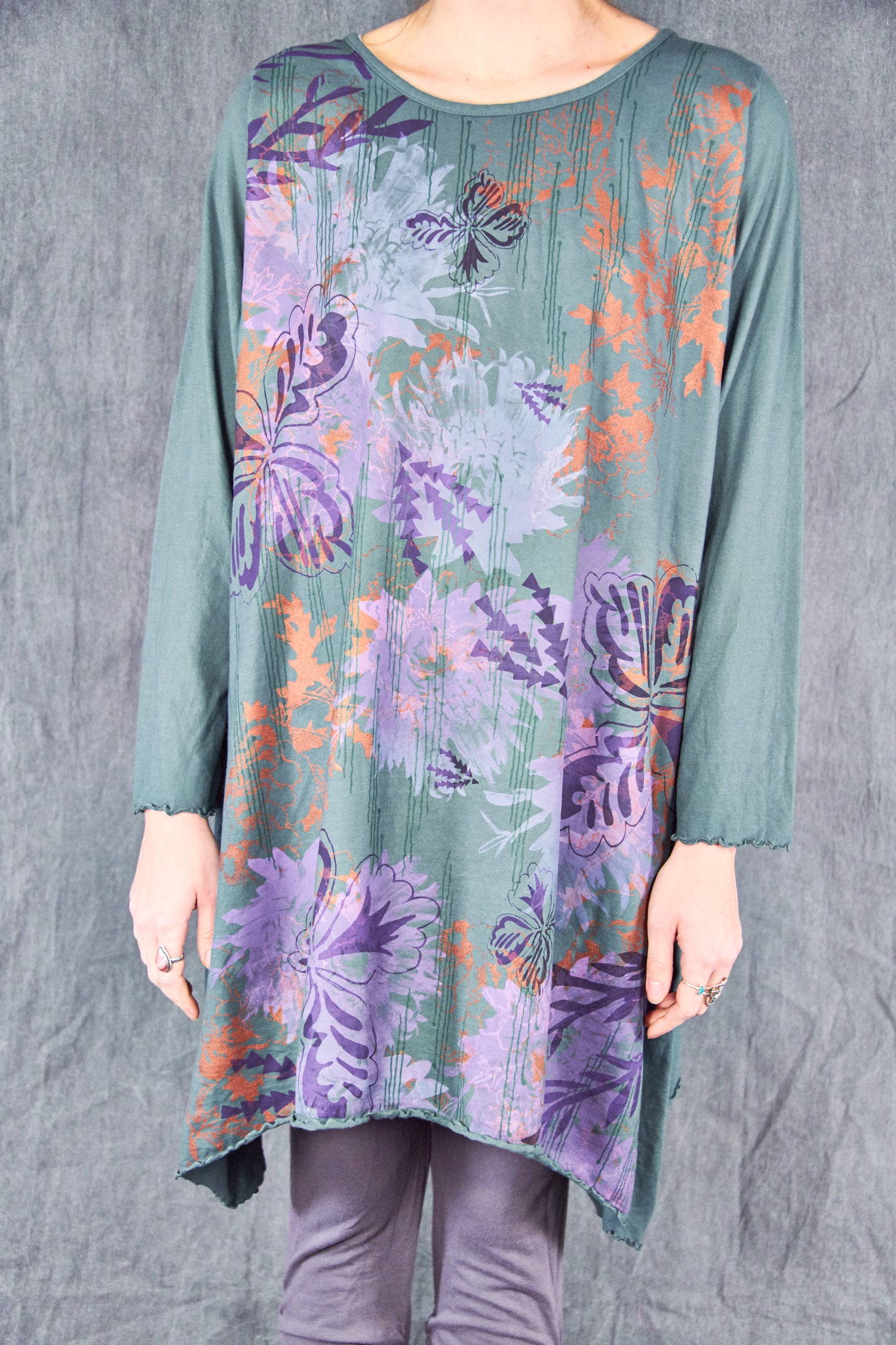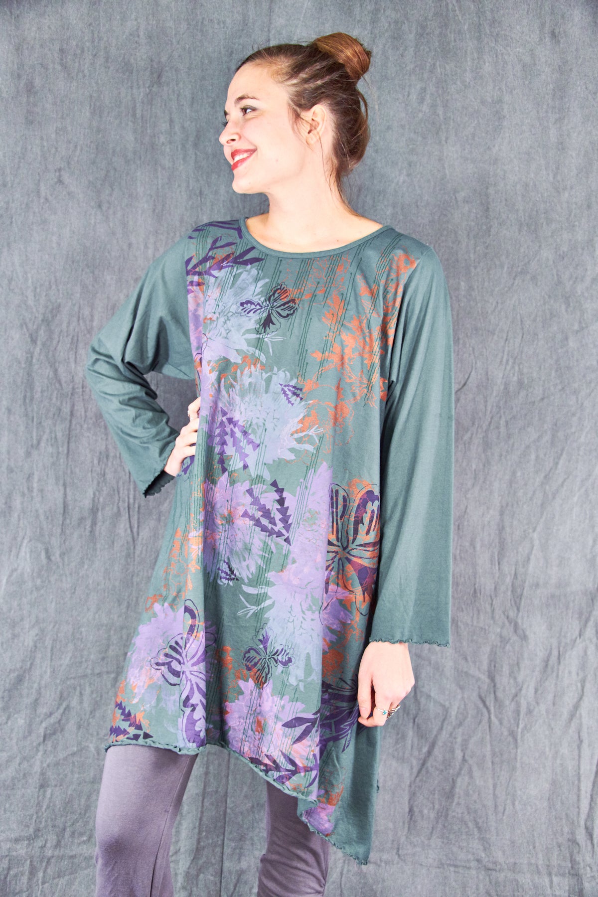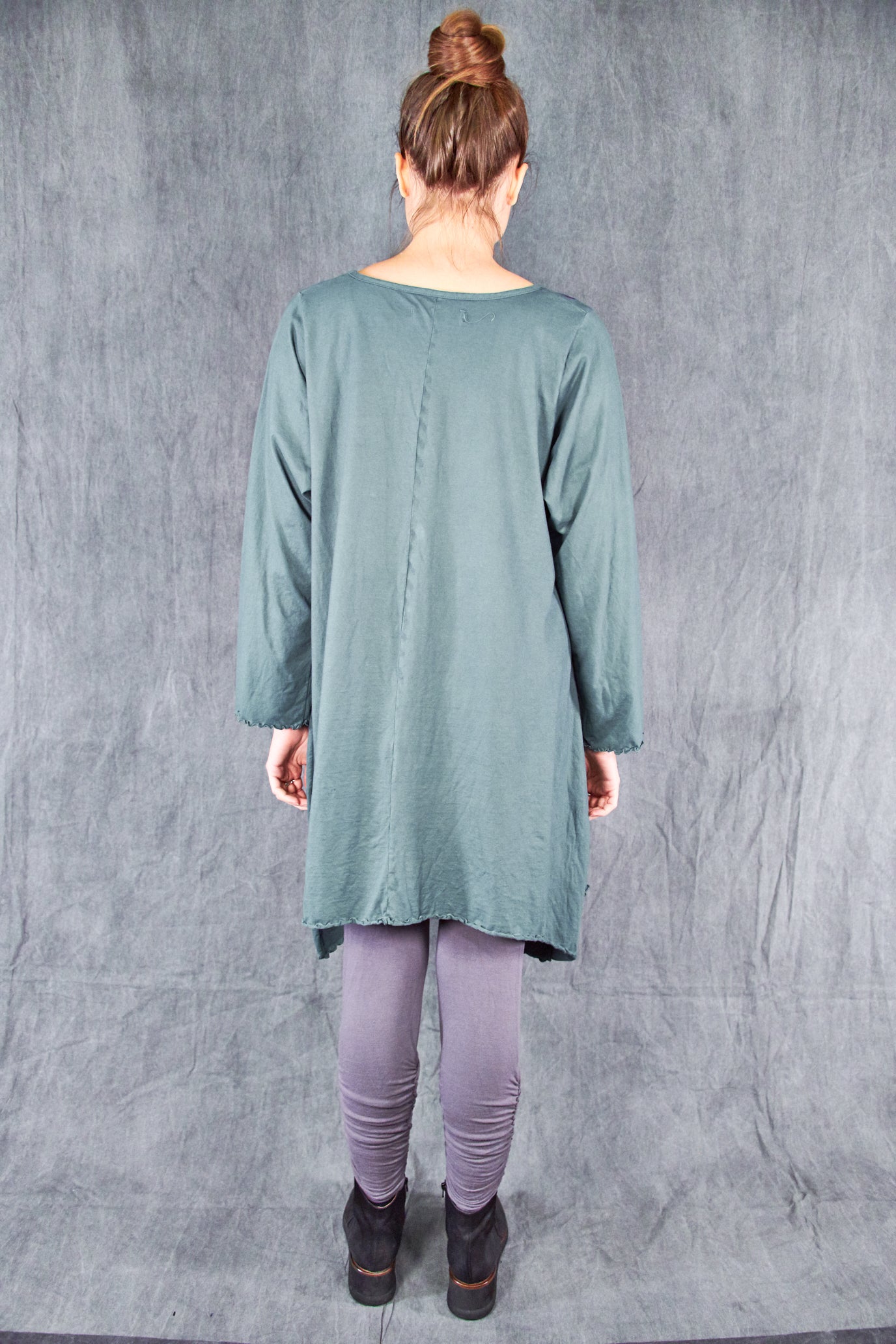 Based on our customer favourite Cafe Tee. We've lengthened this to a tunic/dress length. Center hem hits above the knee while the side points fall a few inches below. A-Line swing shape flatters most body types. Wear with leggings or wide pants. Ruffly lettuce edge sleeves and hem.