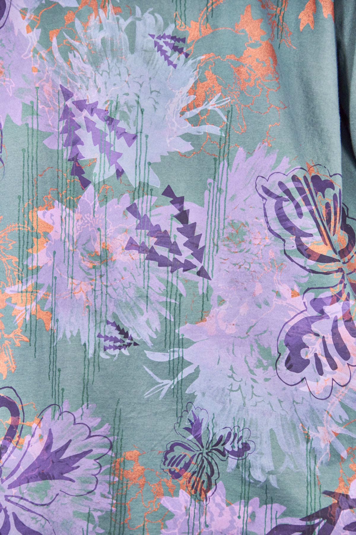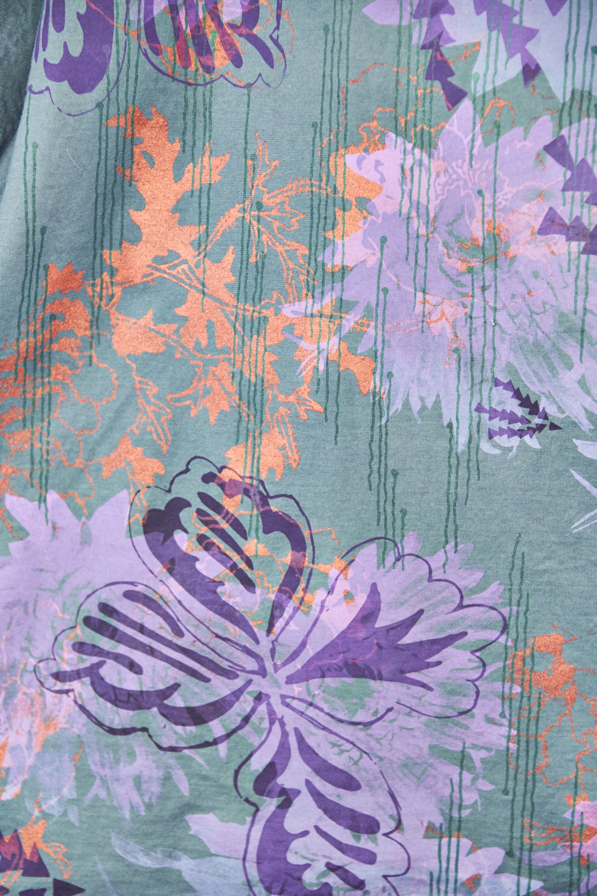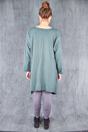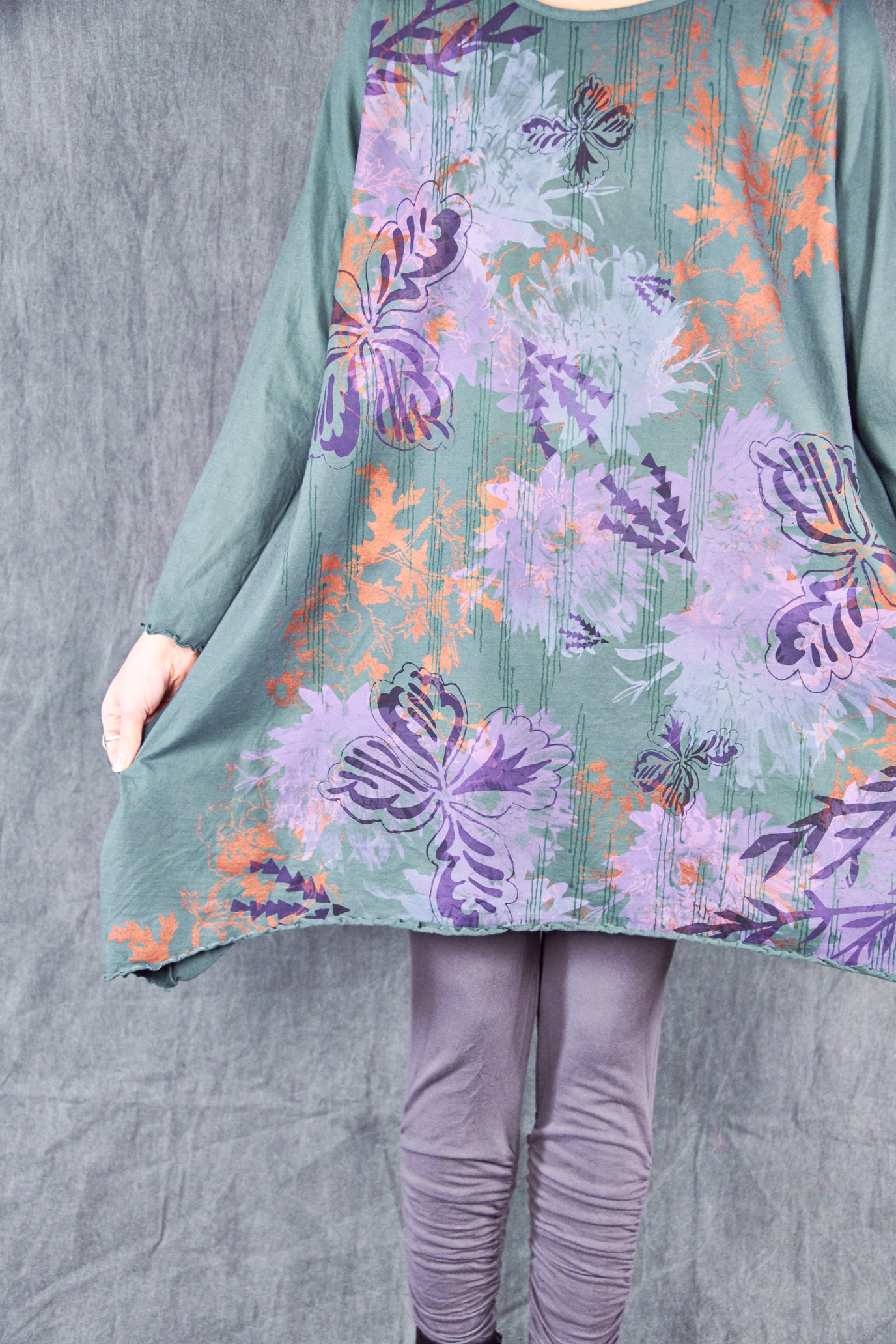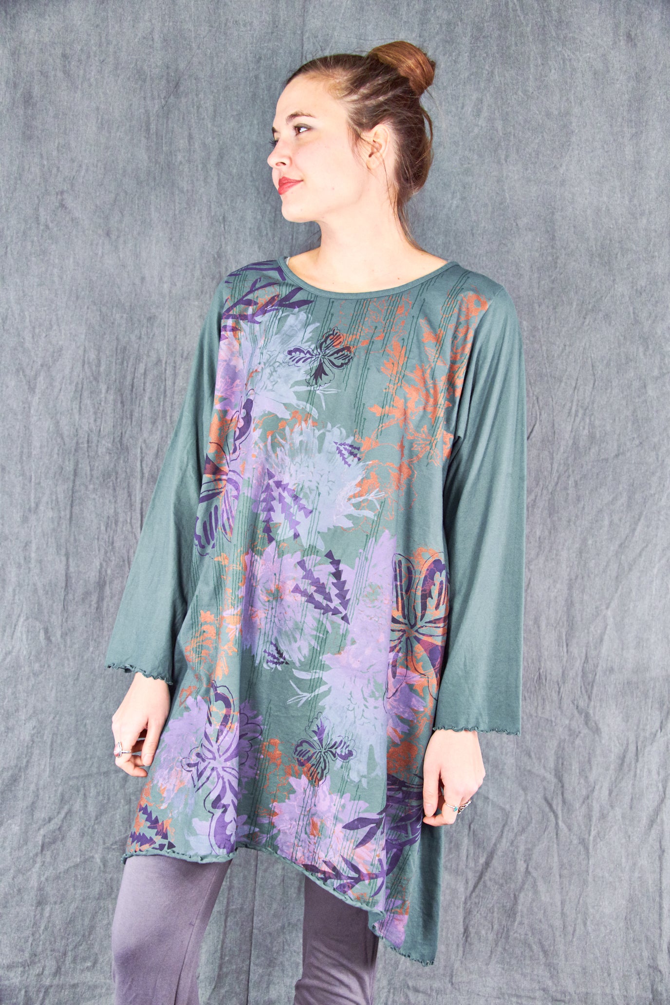 Based on our customer favourite Cafe Tee. We've lengthened this to a tunic/dress length. Center hem hits above the knee while the side points fall a few inches below. A-Line swing shape flatters most body types. Wear with leggings or wide pants. Ruffly lettuce edge sleeves and hem.