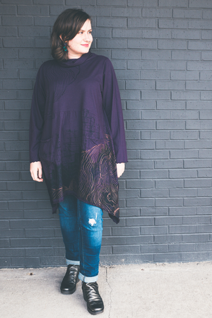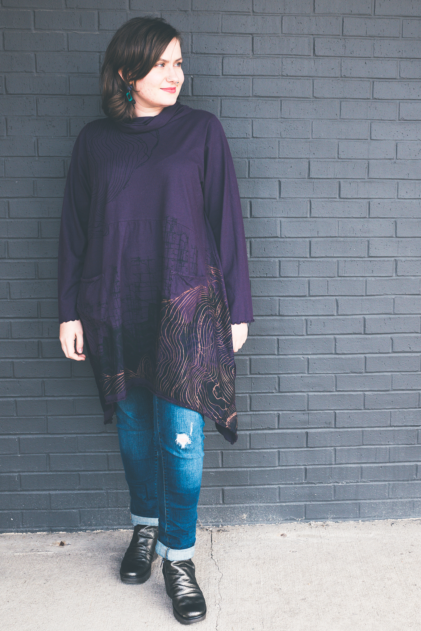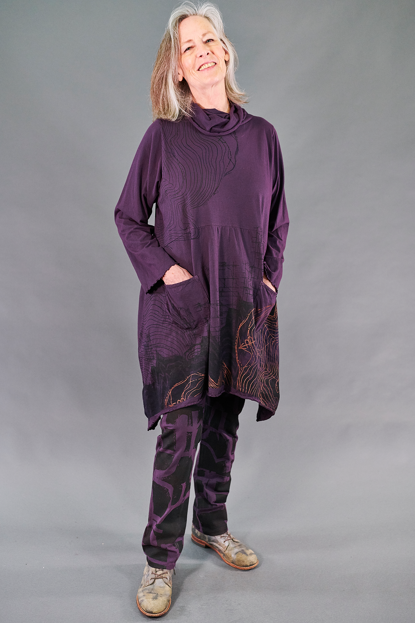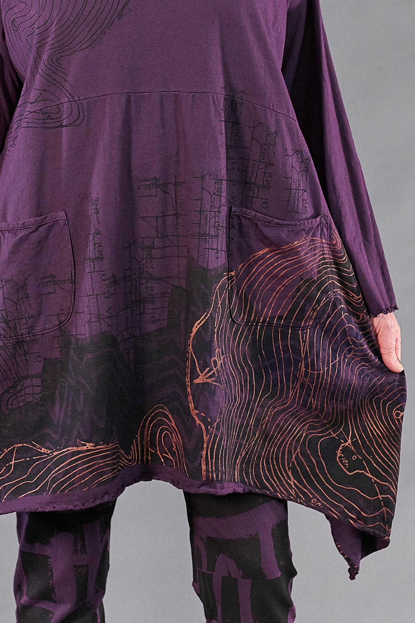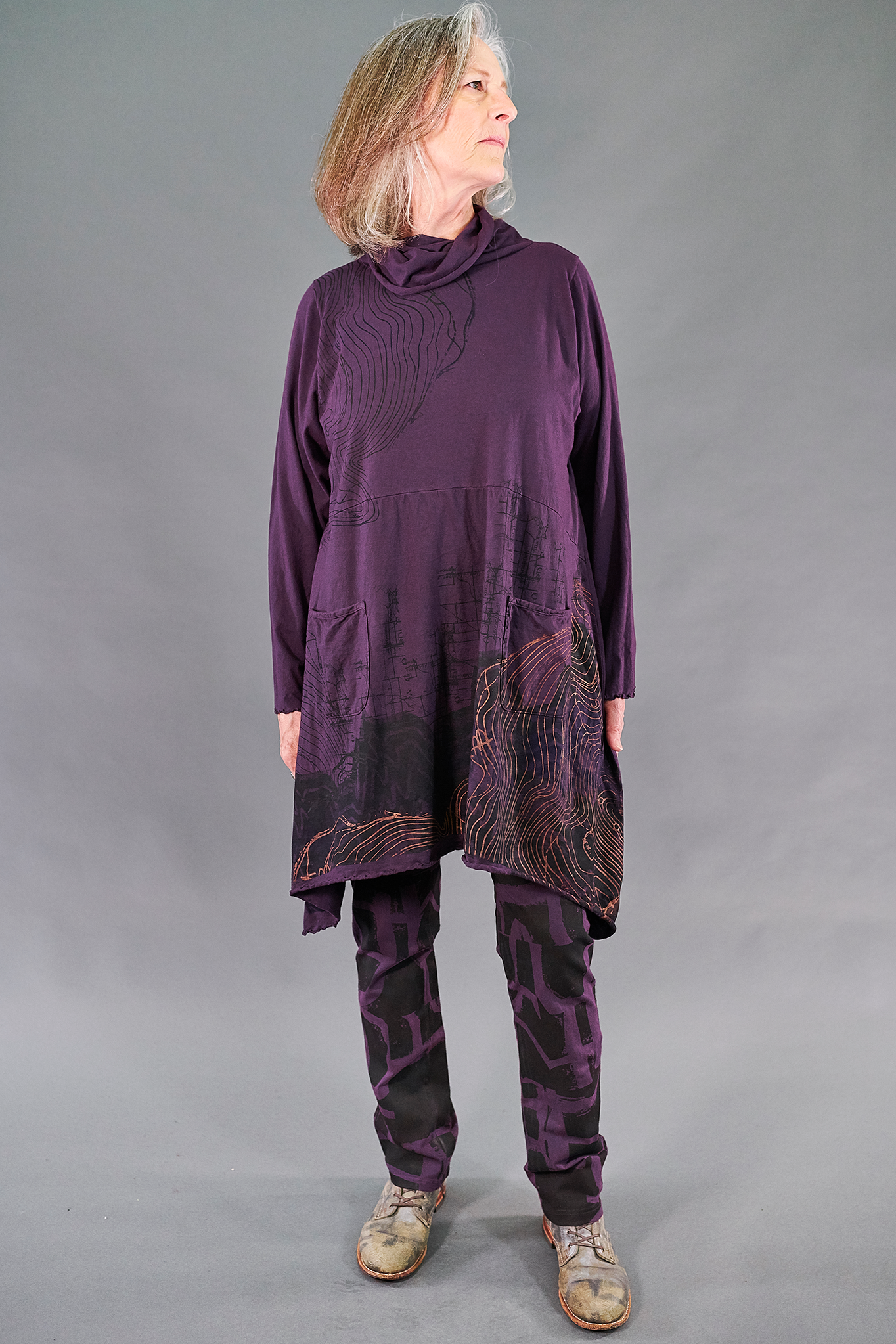 Worn as a tunic or a dress, our Cowl Dress with Pockets is an instant, all-season classic. The mysterious geography of selfhood was explored in the printing of this piece. Tree ring stratification is lapped over by sweeping contours of tarnished copper to create a dazzling and sumptuous terrain.
