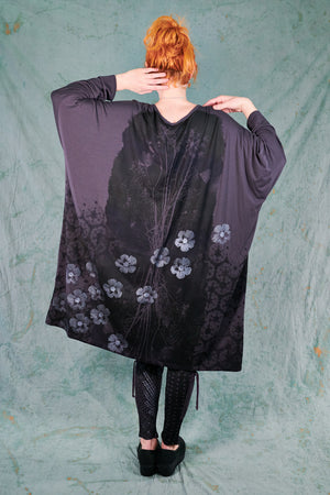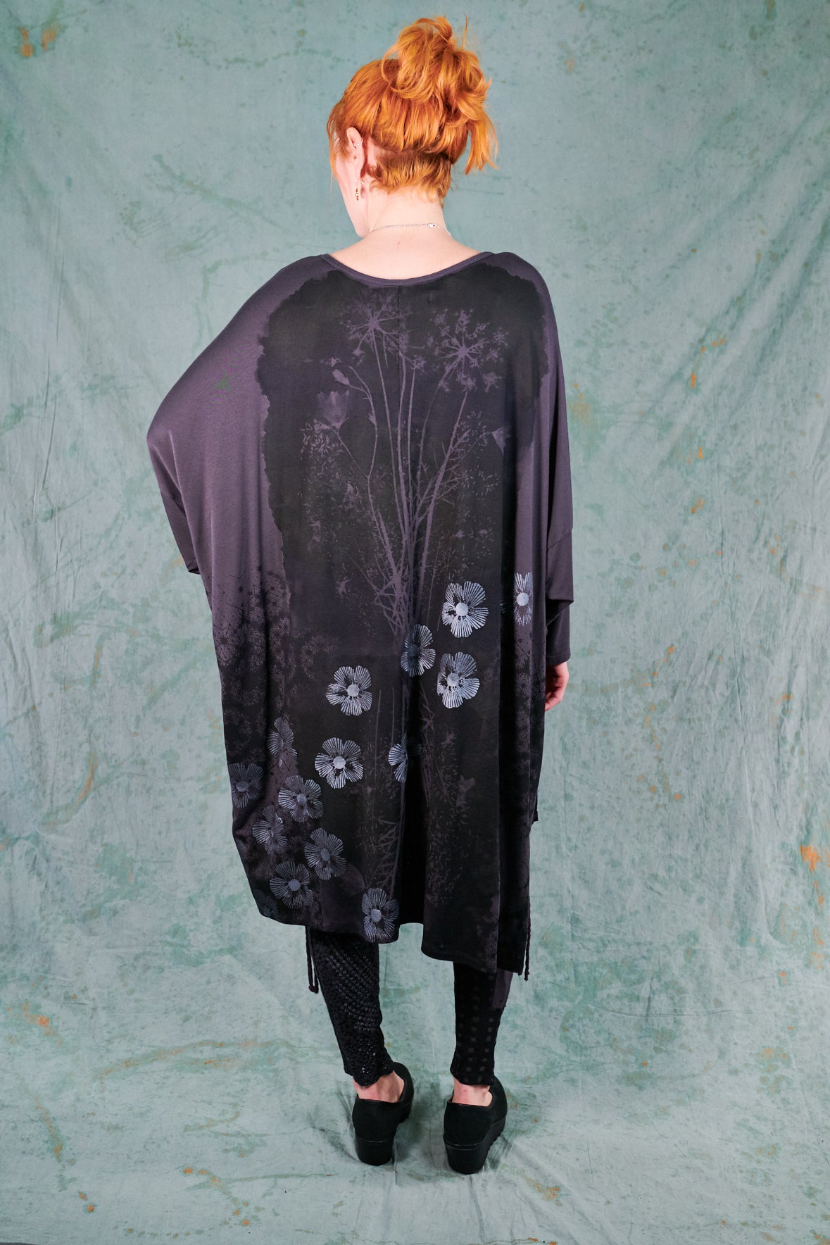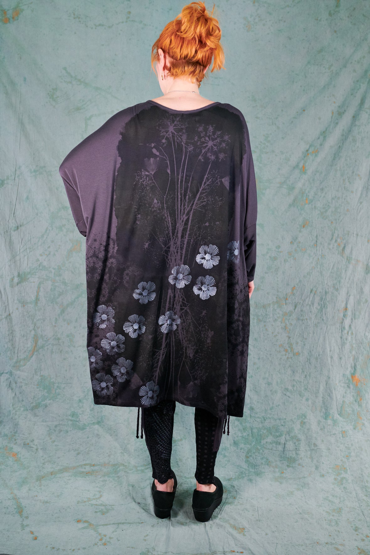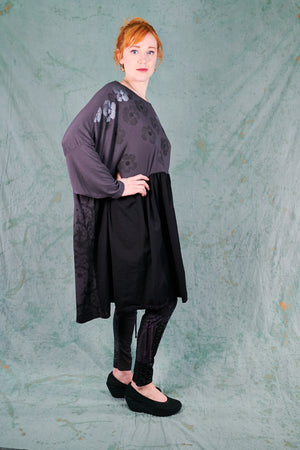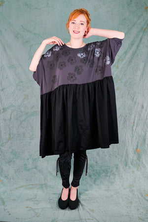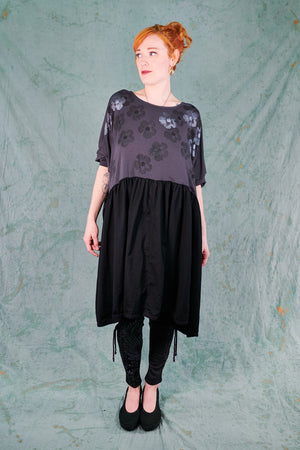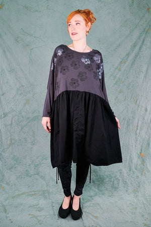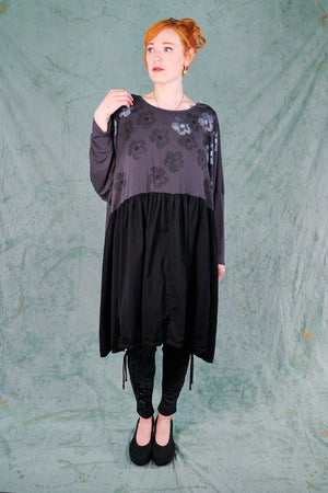 New season dress with a loose fitted, oversize silhouette, dropped shoulders, tapered sleeves and scoop neckline. Crafted from holiday weight modal/lycra fabric front upper portion, sleeves and back, with attached gathered black cotton voile flounce. pss this dress is reversible