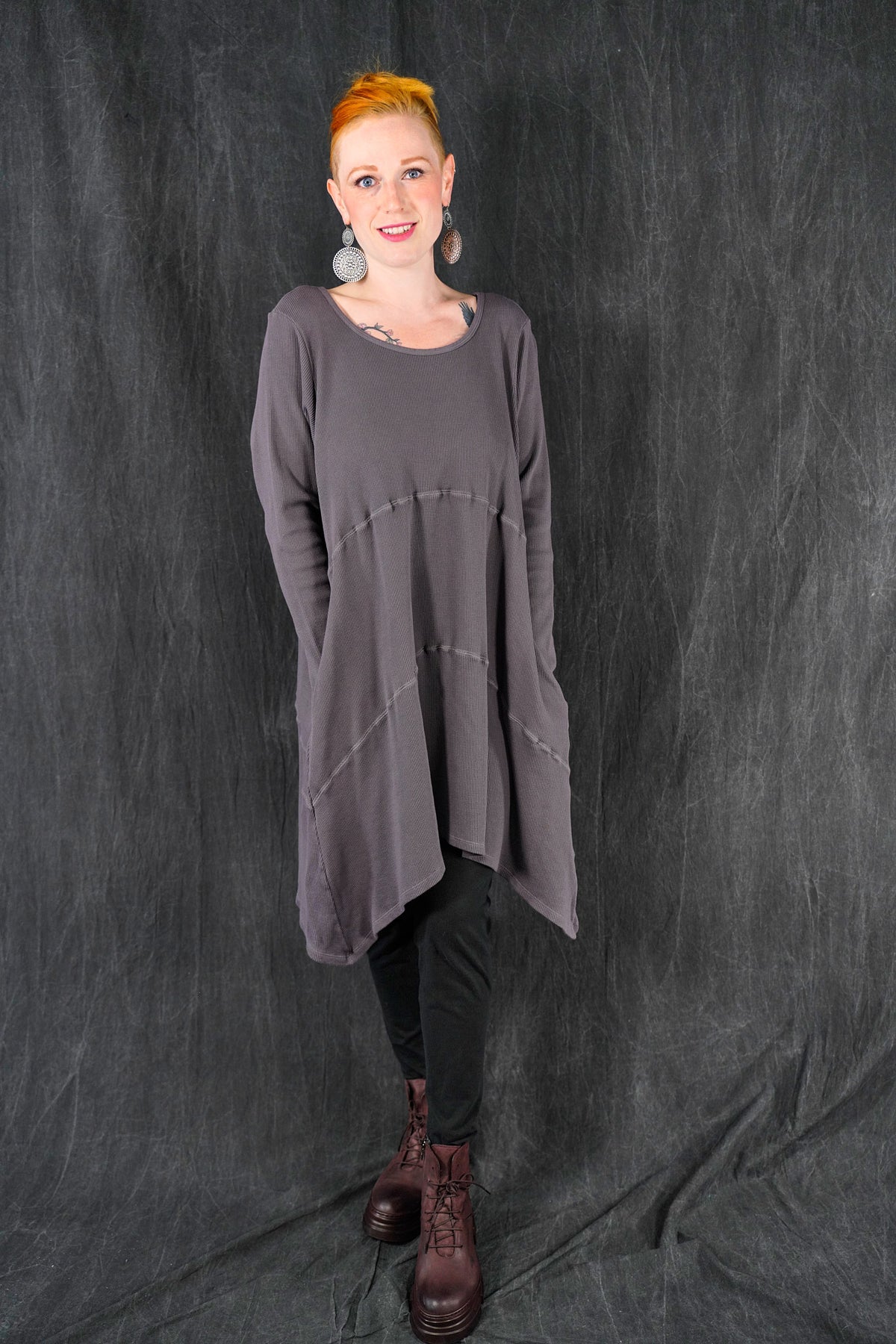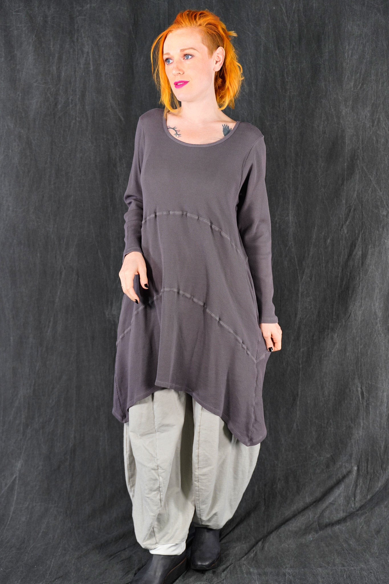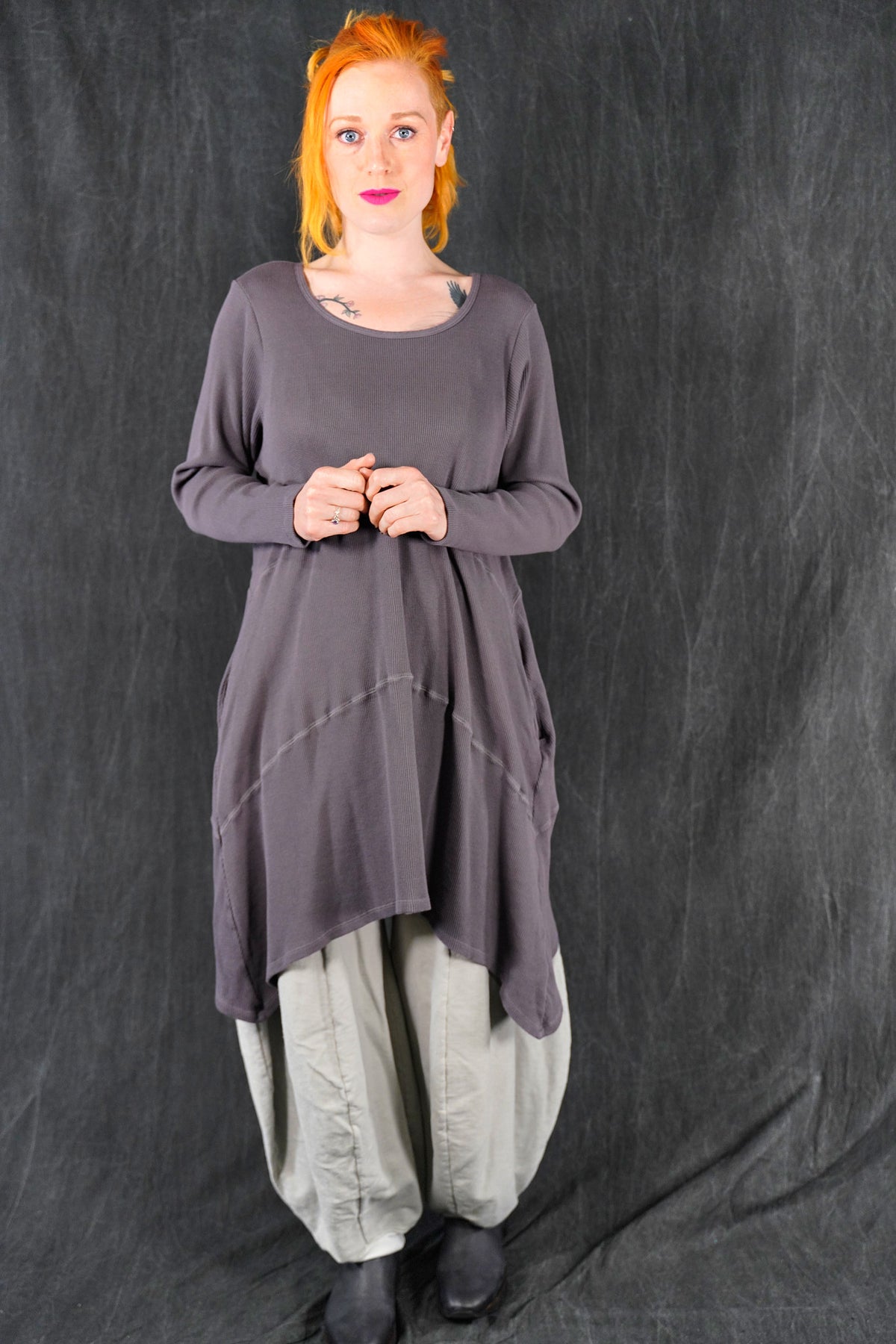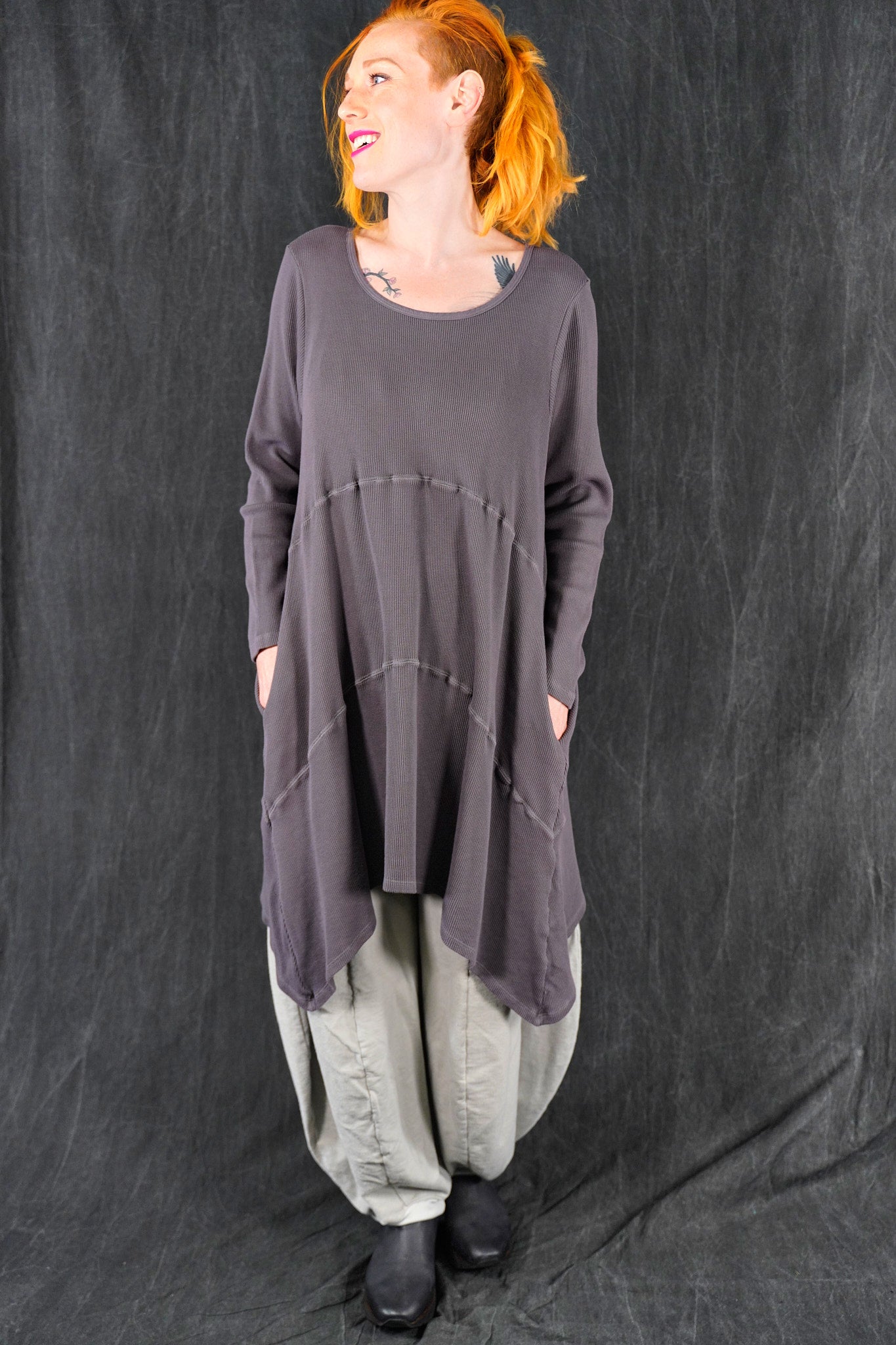 A quintessential favorite, tunic length, a warm piece that is fitted at the top and then gently A-lines out to the upcurved hemline. Long fitted sleeves. Great for winter layering, and easily worn with leggings, skirts, or four square pants as well as jeans. In new rich colors. Features curved, substantial decorative seams that give this piece it’s unmistakable style. On-seam pockets.