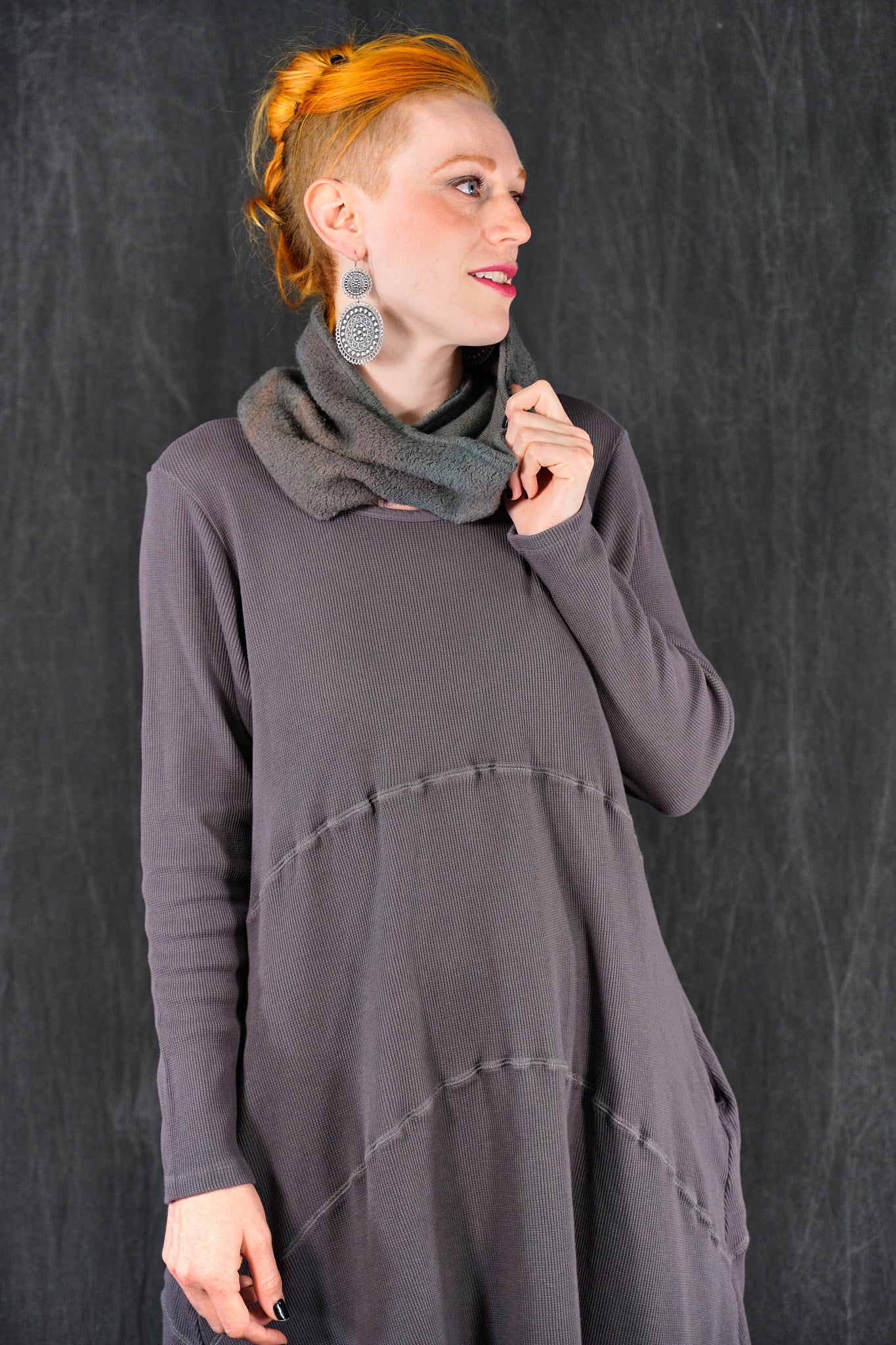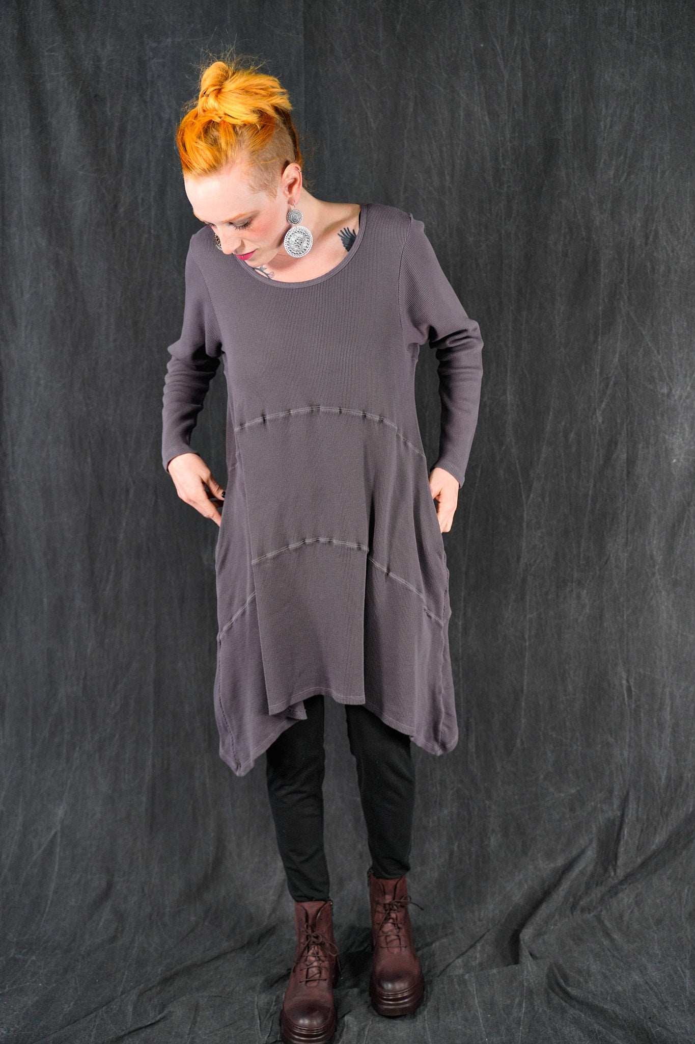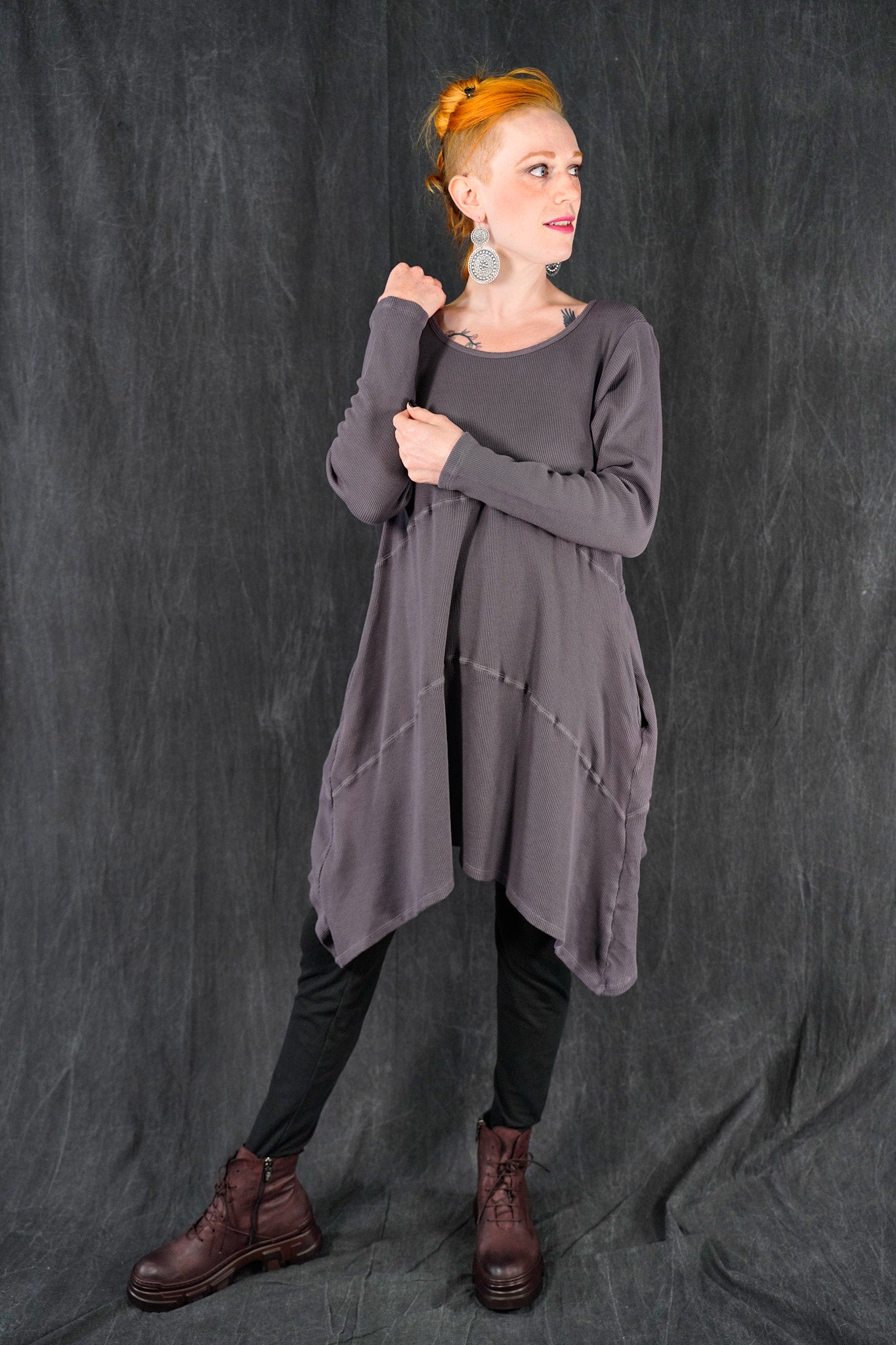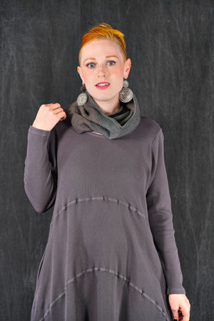 A quintessential favorite, tunic length, a warm piece that is fitted at the top and then gently A-lines out to the upcurved hemline. Long fitted sleeves. Great for winter layering, and easily worn with leggings, skirts, or four square pants as well as jeans. In new rich colors. Features curved, substantial decorative seams that give this piece it’s unmistakable style. On-seam pockets.