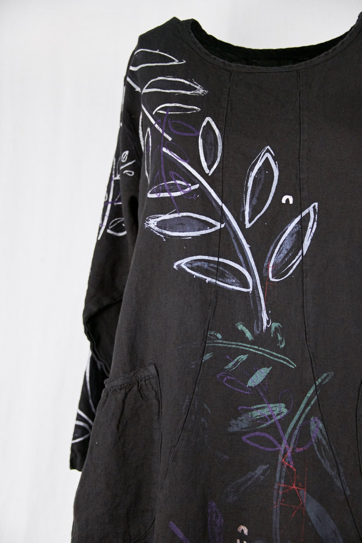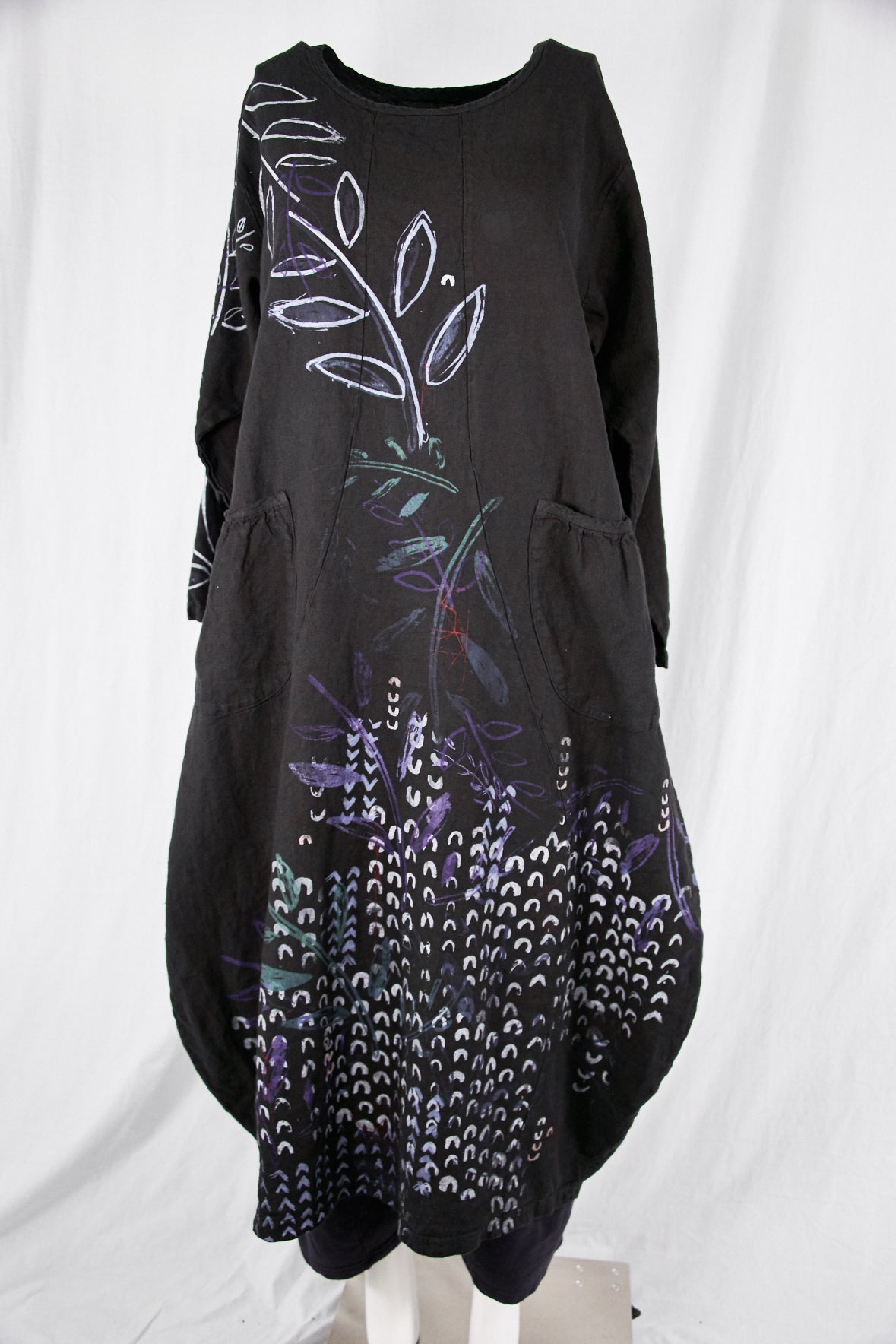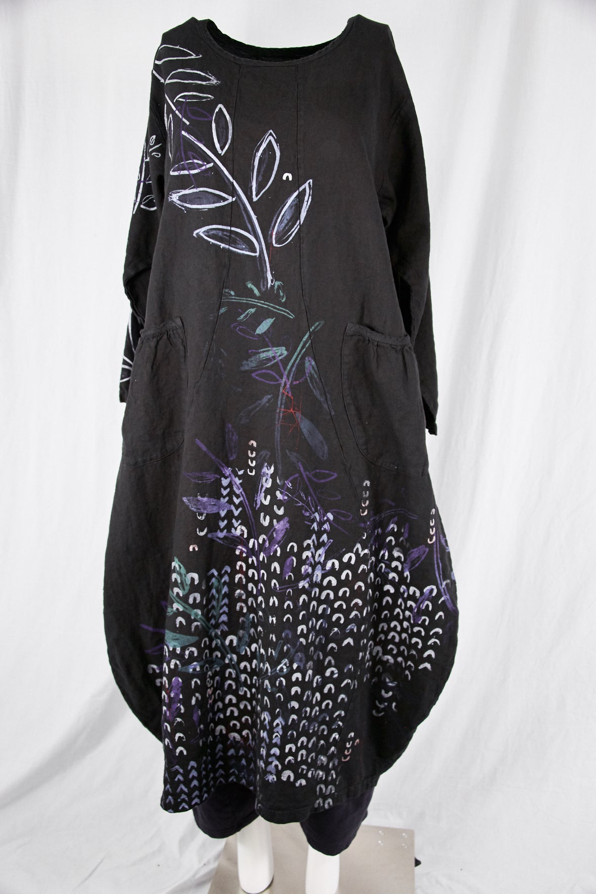 You may know this also as our popular Thistle Dress. Textural woven heavy linen made into a flattering, curved dress with a tulip shaped lower half. Featuring center front vertical, curving design lines for shaping and 2 sweet gathered pockets with binding and tucks. Printed front and back with wood cut blooms.