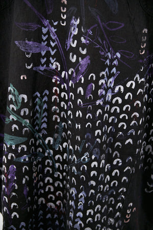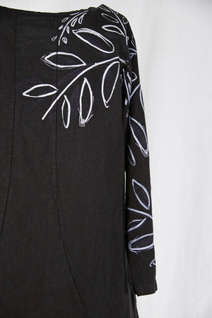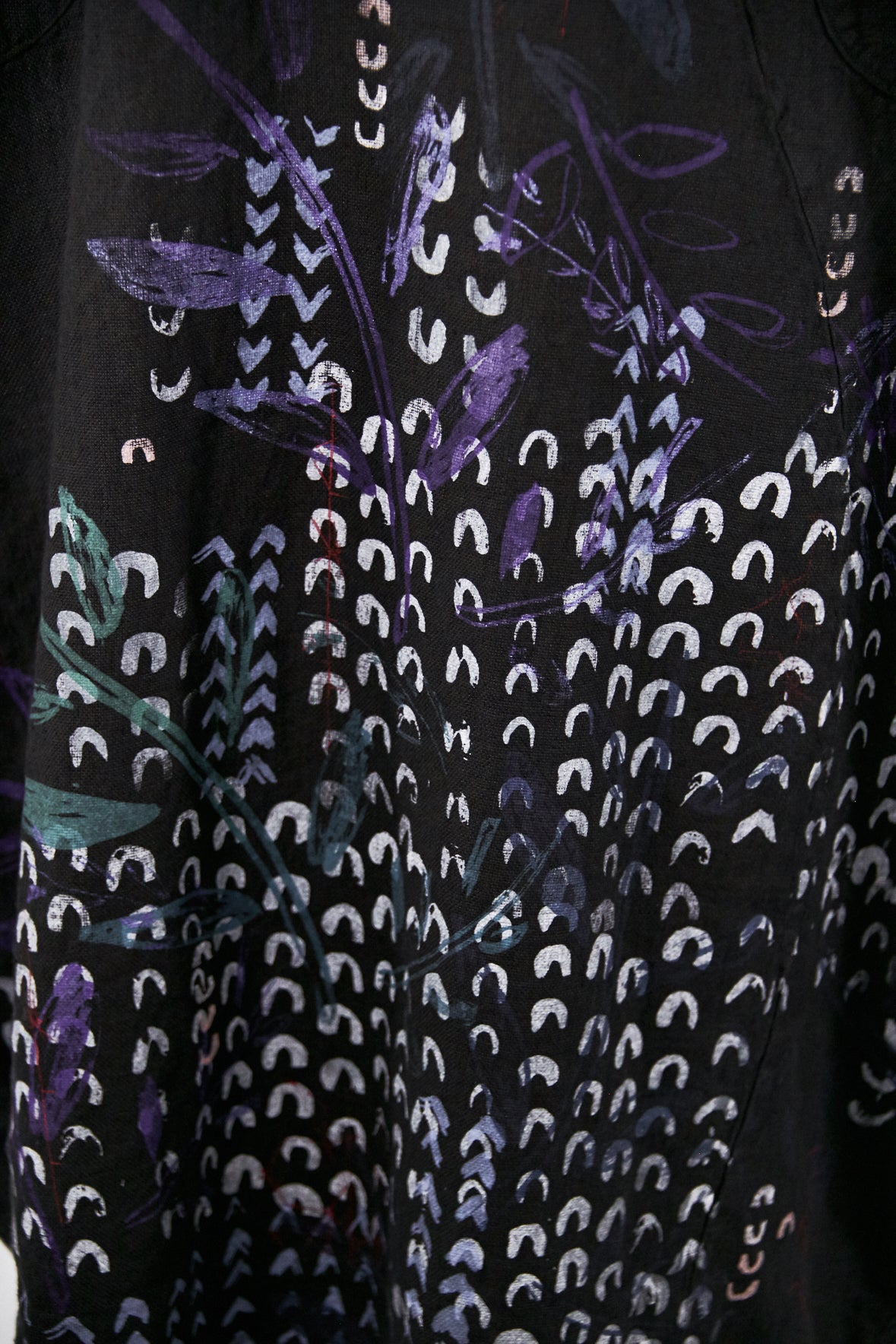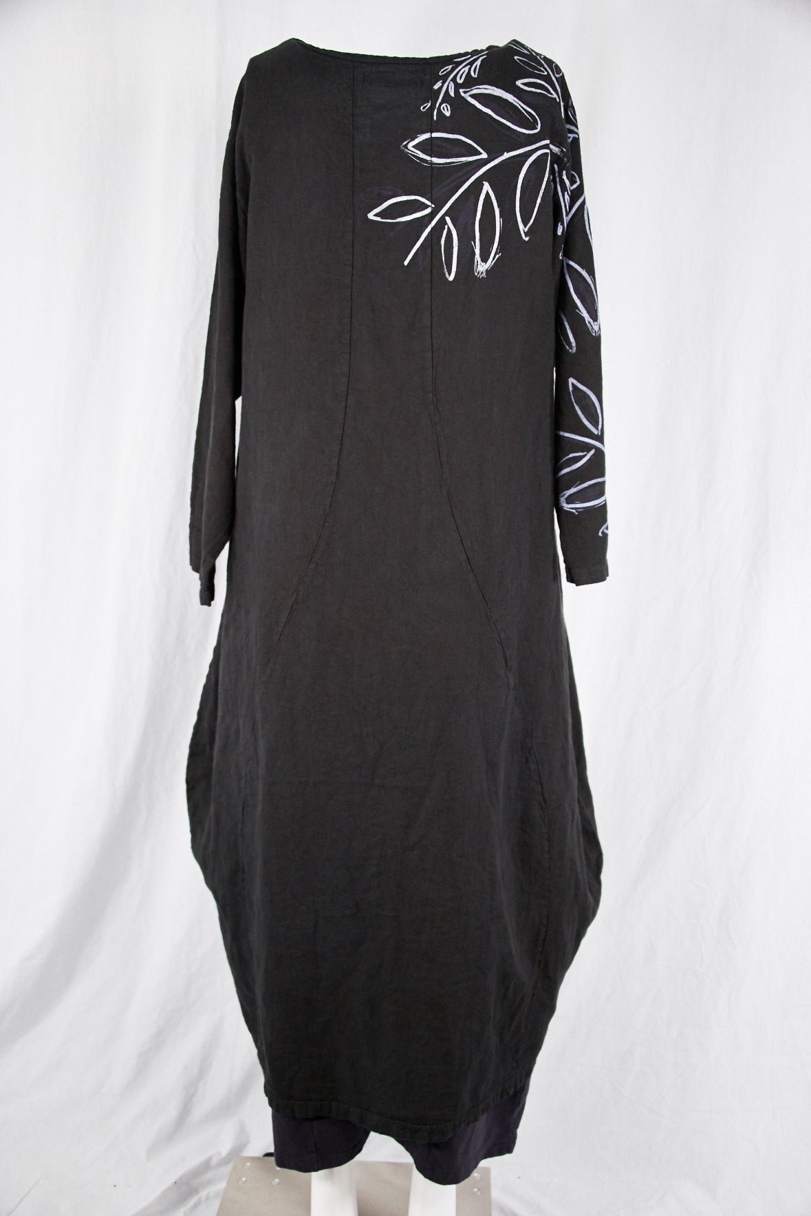 You may know this also as our popular Thistle Dress. Textural woven heavy linen made into a flattering, curved dress with a tulip shaped lower half. Featuring center front vertical, curving design lines for shaping and 2 sweet gathered pockets with binding and tucks. Printed front and back with wood cut blooms.