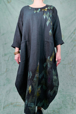 You may know this also as our popular Thistle Dress. Textural woven heavy linen-cotton made into a flattering, curved dress with a tulip shaped lower half. Featuring center front vertical, curving design lines for shaping and 2 sweet gathered pockets with binding and tucks.