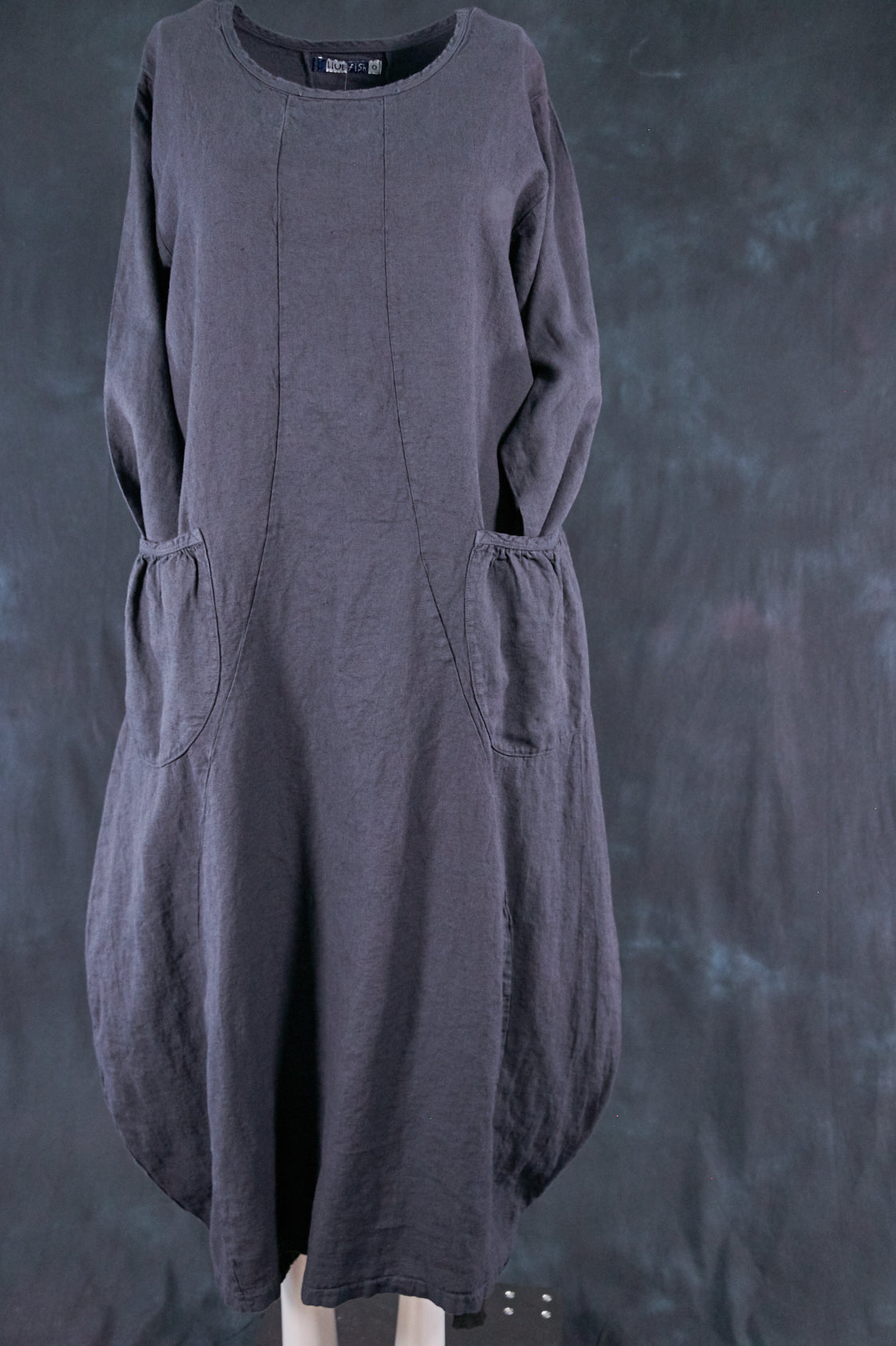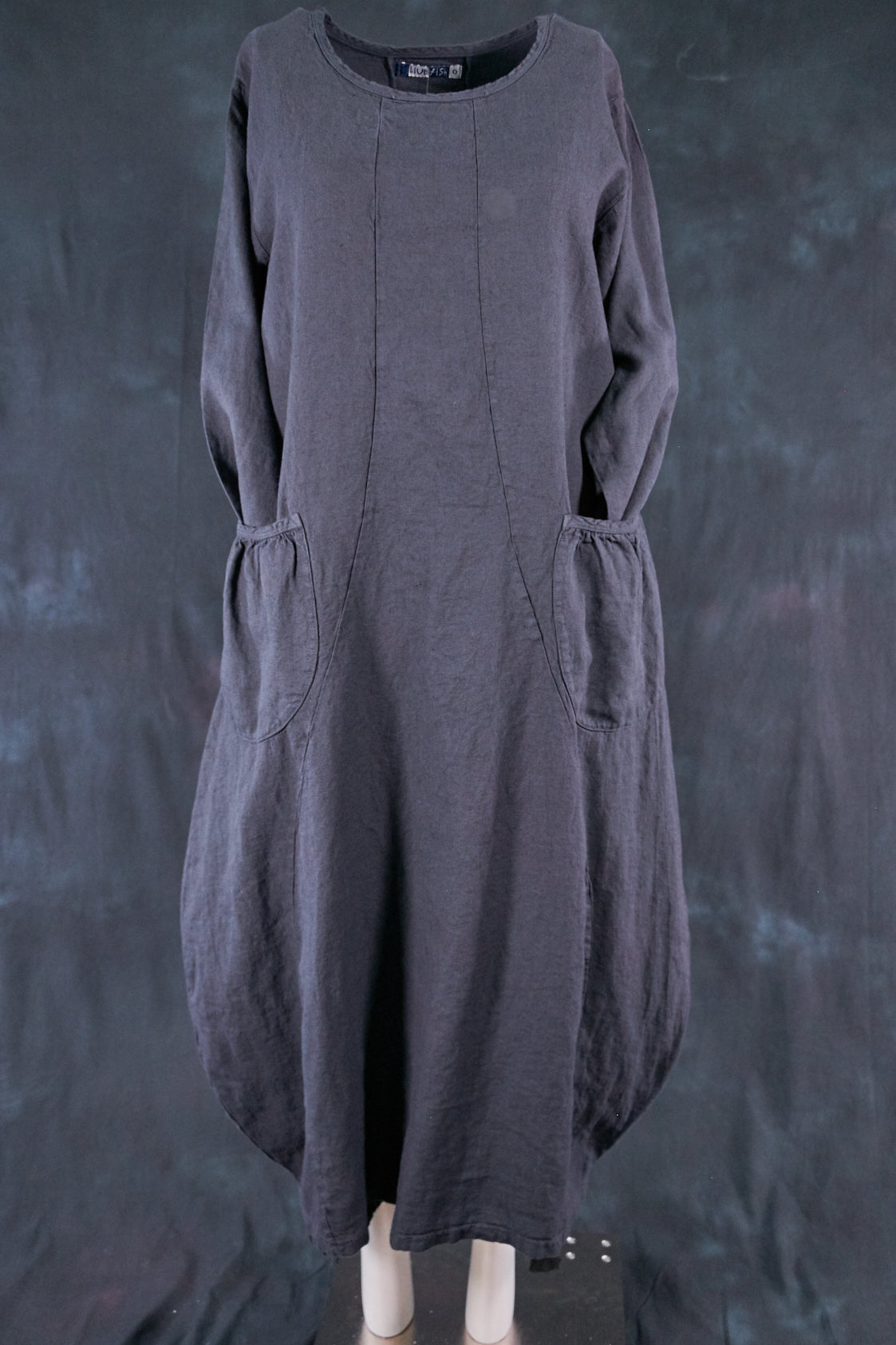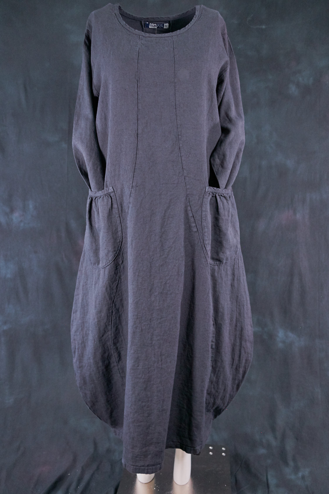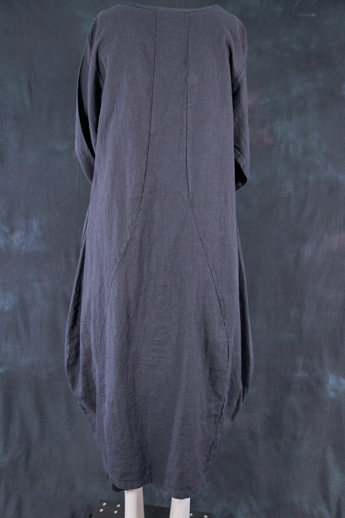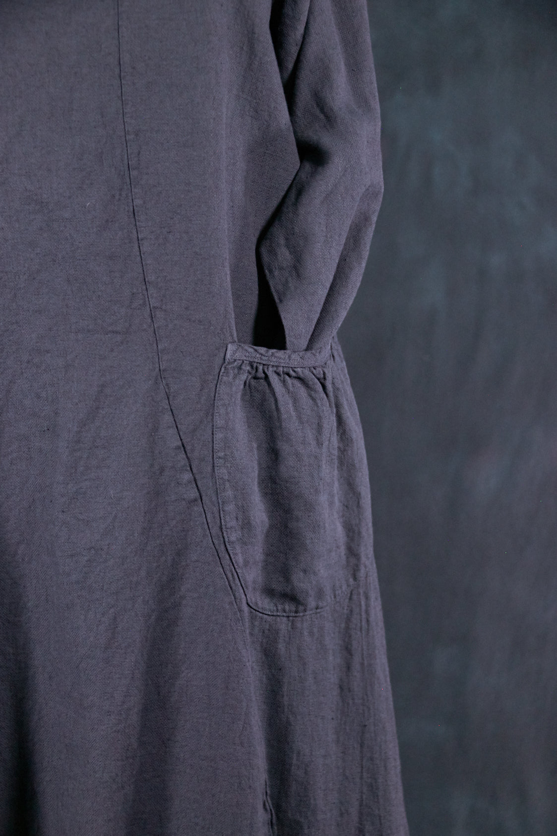 Textural woven heavy linen-rayon made into a flattering, long curved dress with a tulip shaped lower half. Featuring center front vertical, gently curving design seams for shaping and 2 deep gathered pockets with binding and tucks.