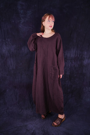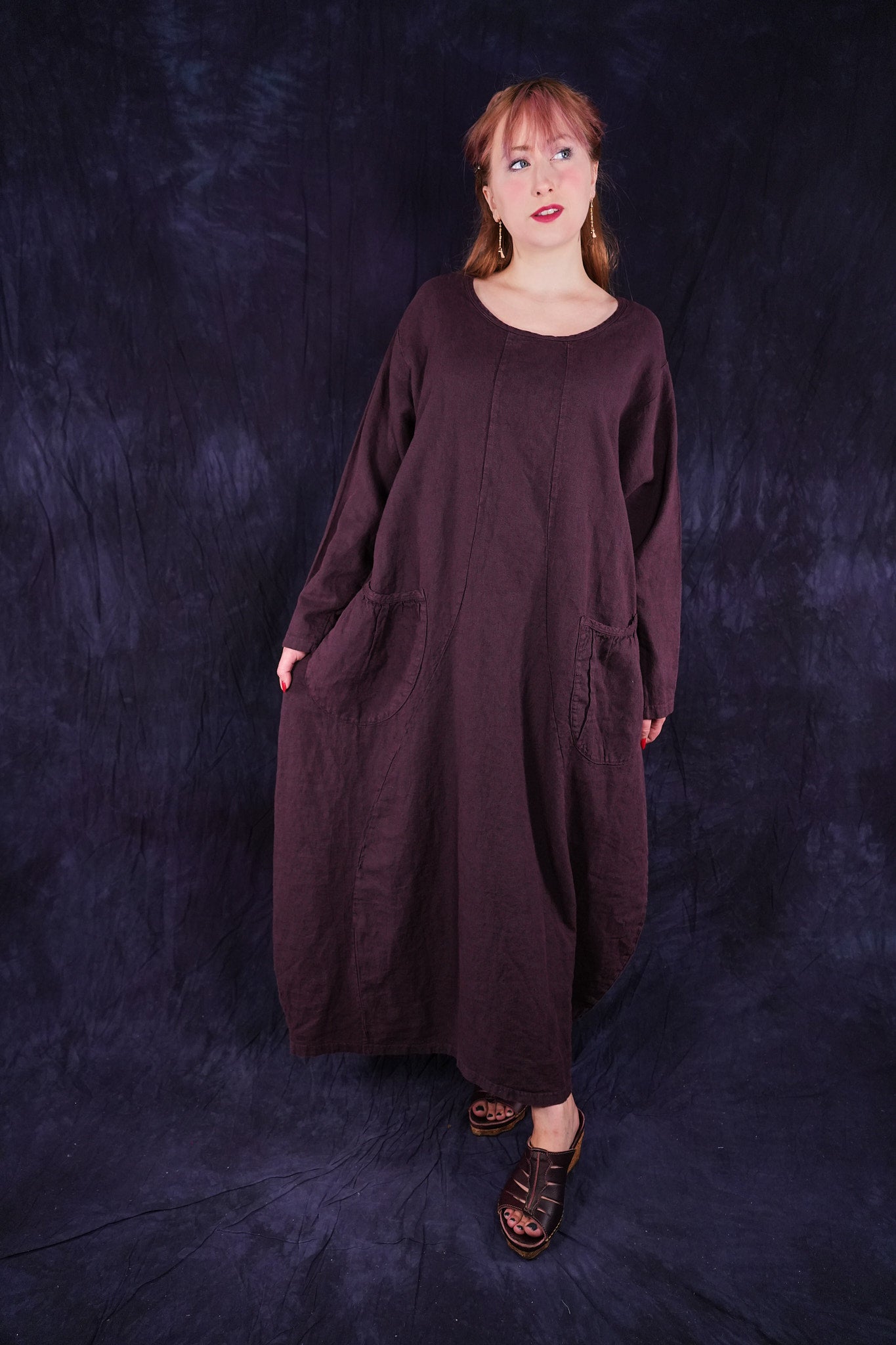 You may know this also as our popular Thostle Dress. Oversized, heavy Linen Rayon suitable for cooler months. Wide, bell shaped dress with seaming and pockets, has always been a favorite style of many.