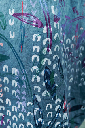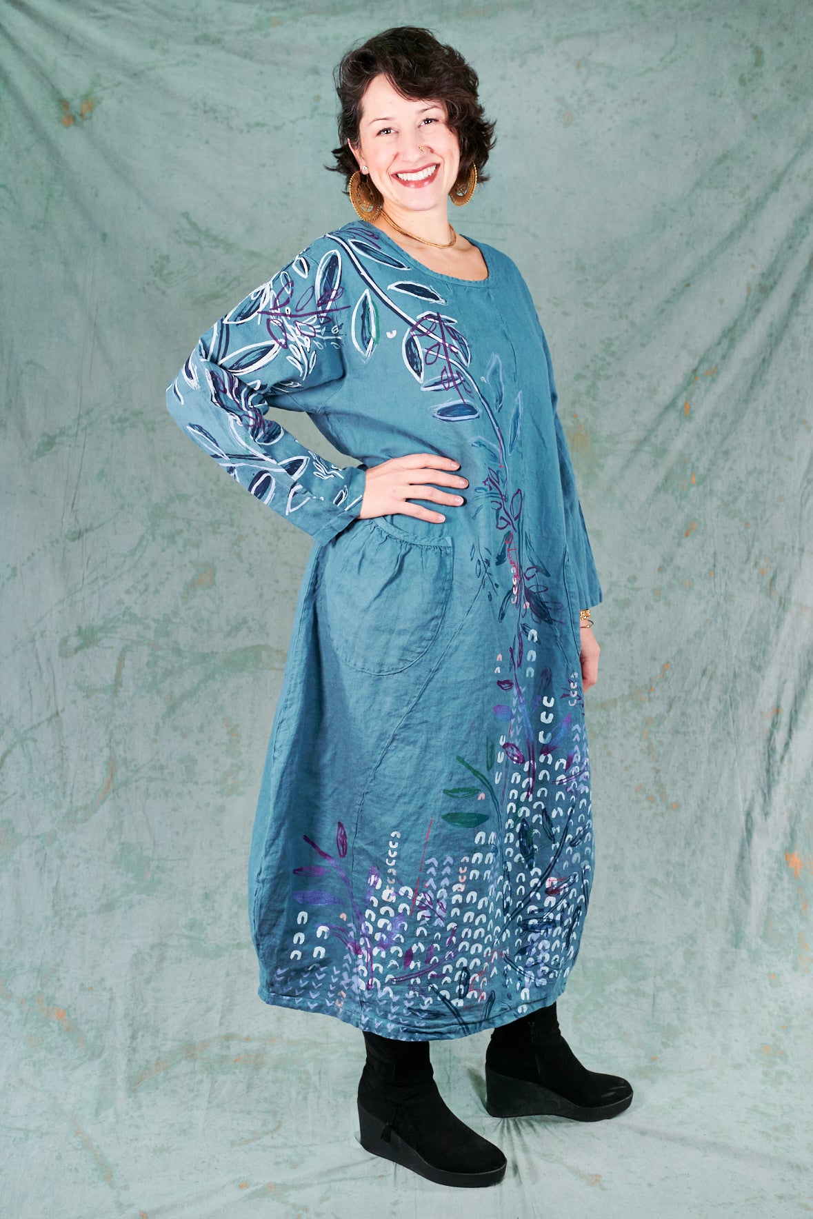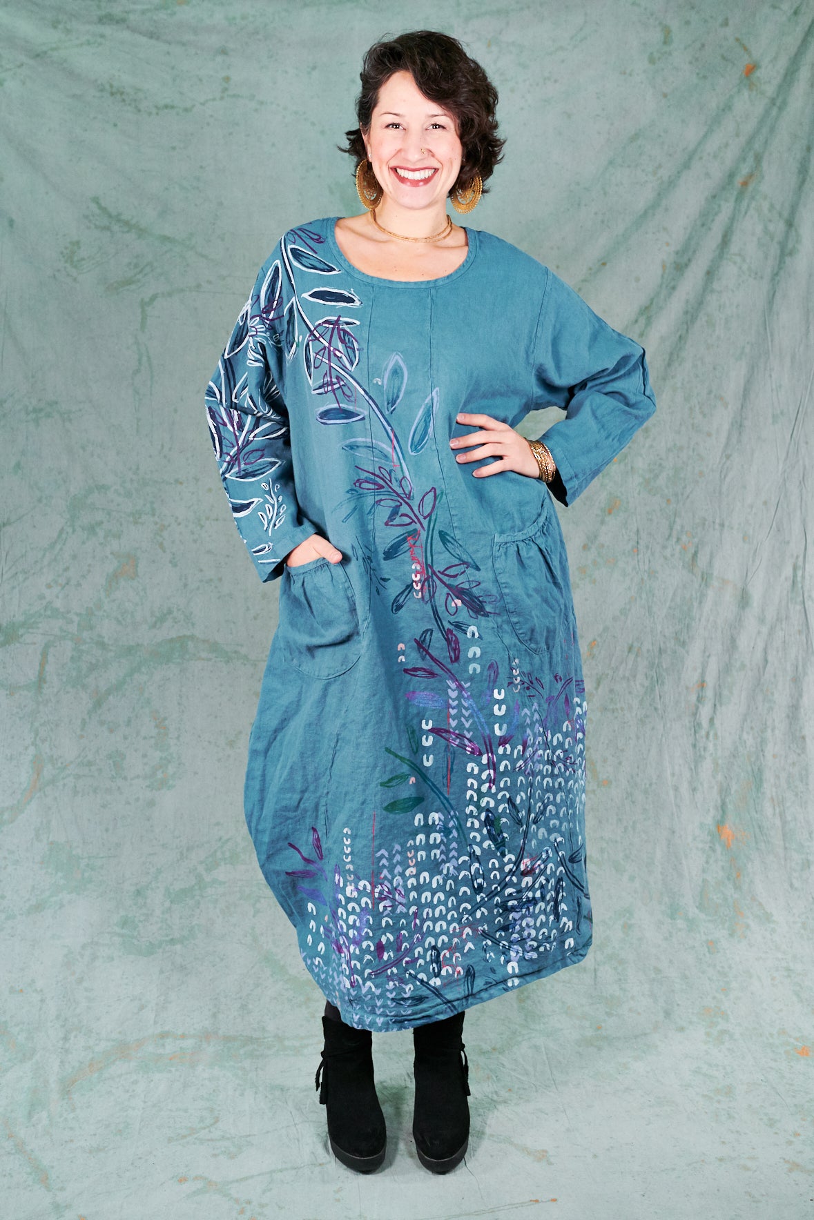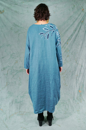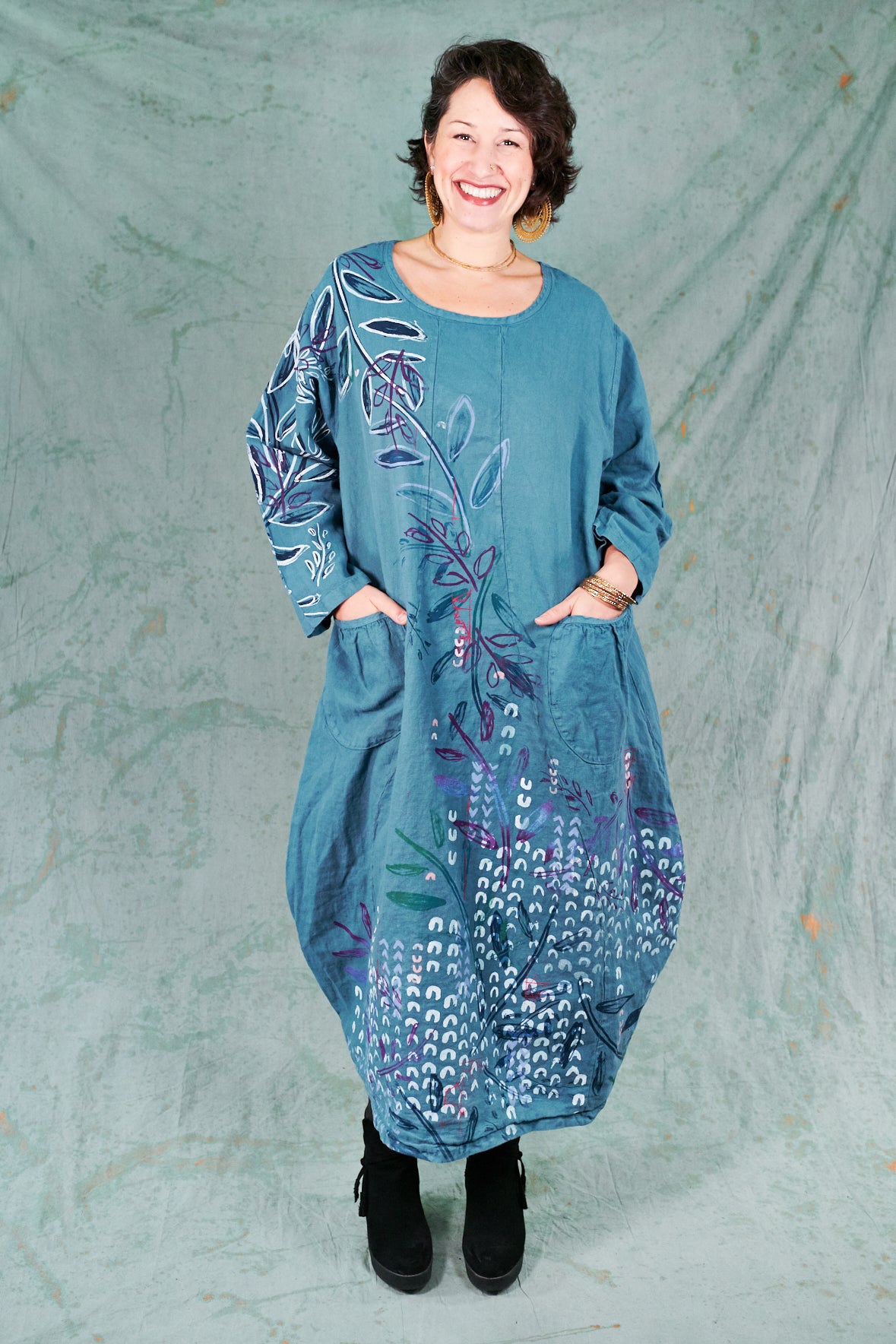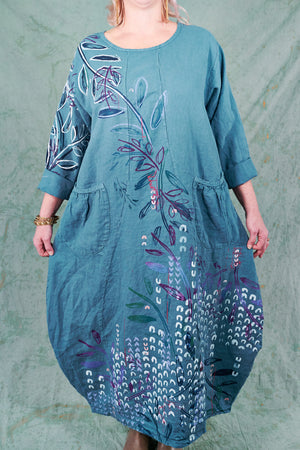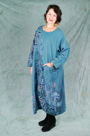 You may know this also as our popular Thistle Dress. Textural woven heavy linen made into a flattering, curved dress with a tulip shaped lower half. Featuring center front vertical, curving design lines for shaping and 2 sweet gathered pockets with binding and tucks.